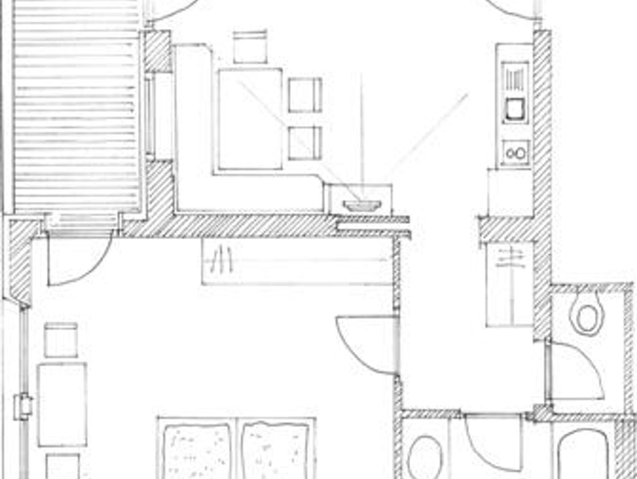 Geräumige Ferienwohnung für 2-4 Personen mit einem Schlafzimmer, einer Wohnküche mit ausziehbarer Couch und Südbalkon in einer Einheit. Das Schlafzimmer ist gross genug für 2 Zusatzbetten.