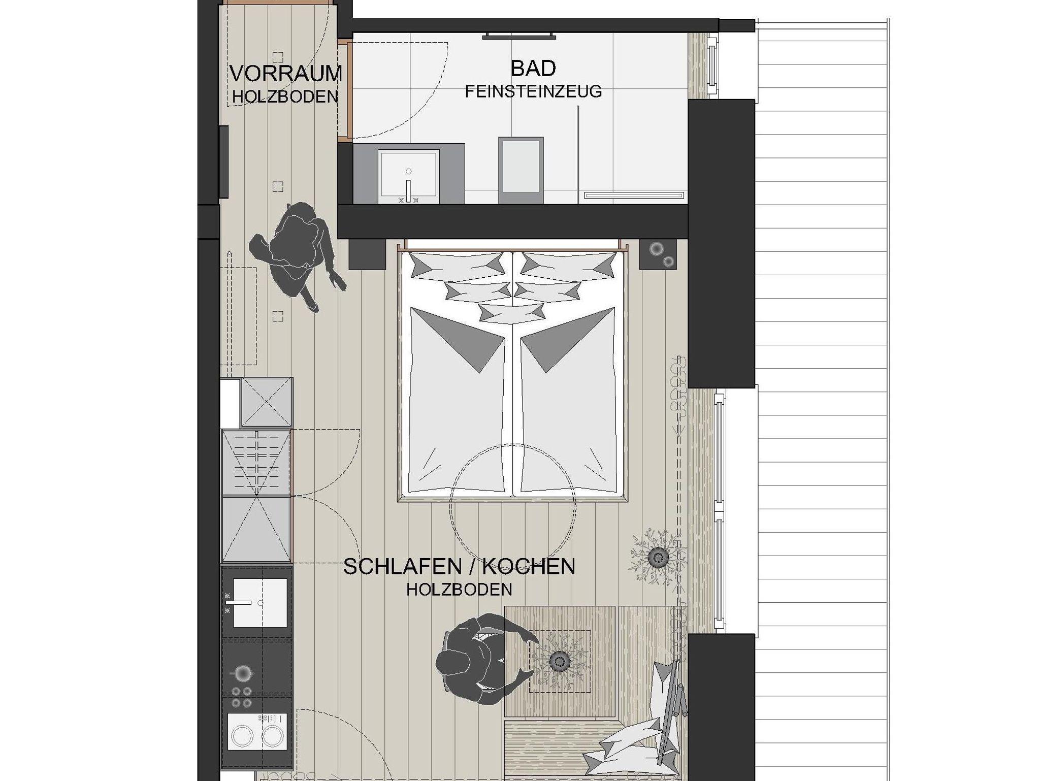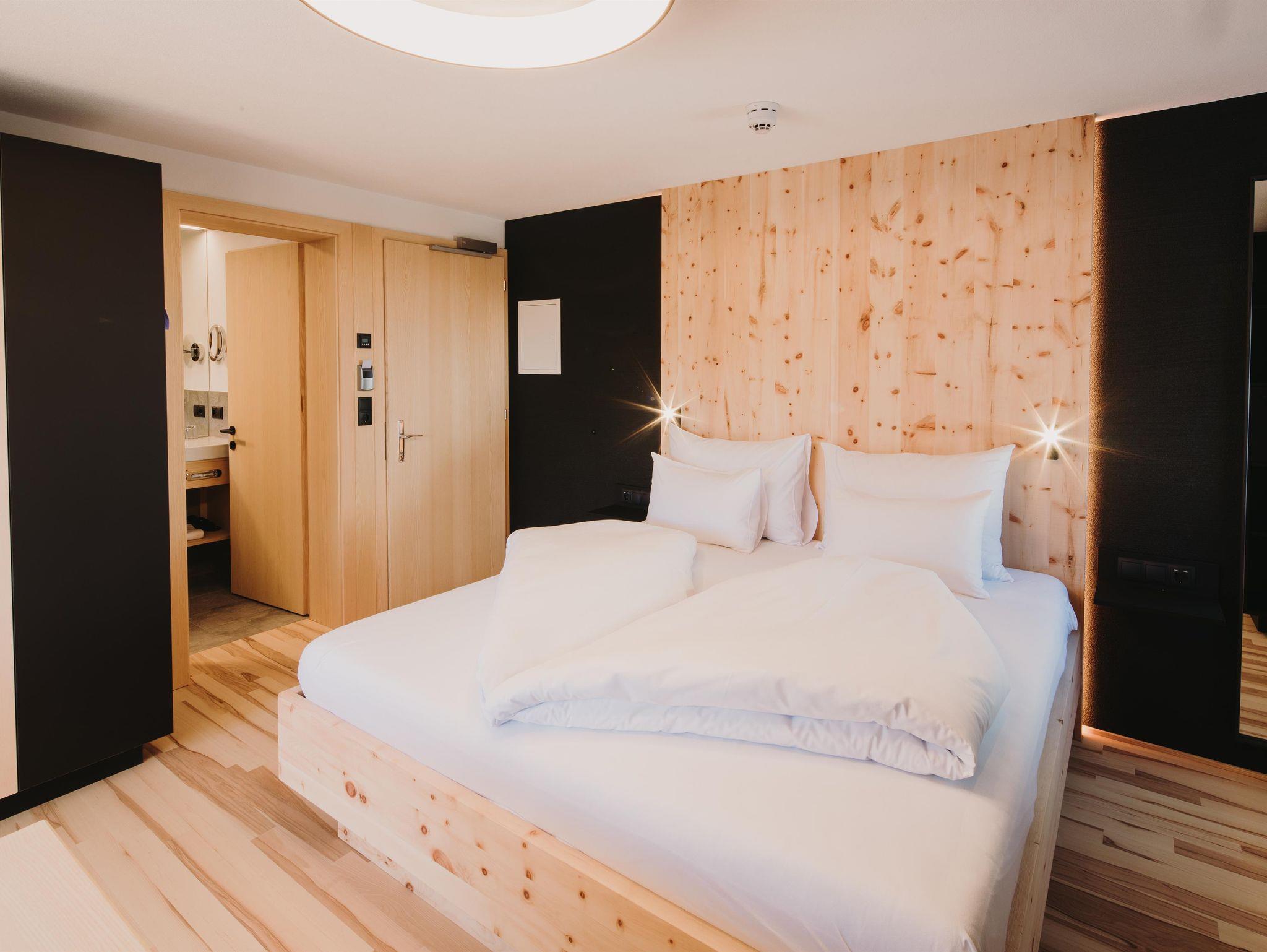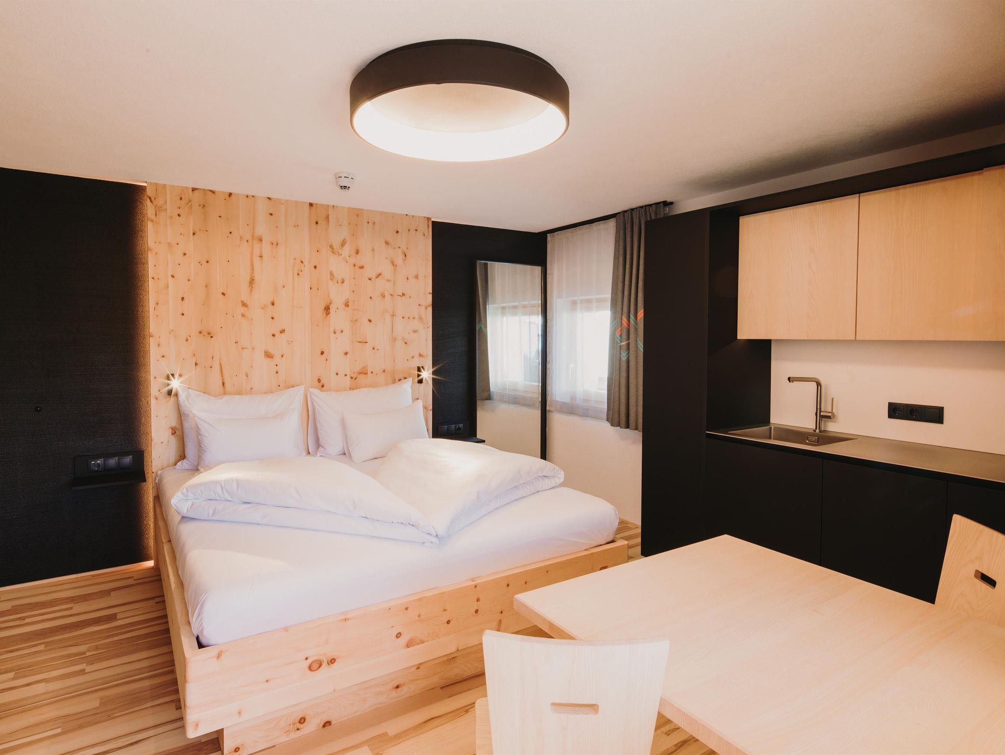Hell, gemütlich, natürlich – einfach lovely! Die helle und freundliche Einrichtung der Doppelstudios Lovely Alpin gepaart mit dunklen Akzenten sorgt für sofortigen Wohlfühl-Effekt. Hochwertiges Bett aus Zirbenvollholz für pure Erholung während des Schlafs. Kitchenette für die nötige Flexibilität bei der Verpflegung. Kleiner Essbereich, Badezimmer mit Walk-In Regendusche und WC. Auf den Balkonen die Sonne und das Bergpanorama genießen. Glasfaser-TV, Telefon, Safe und kostenloses WLAN.