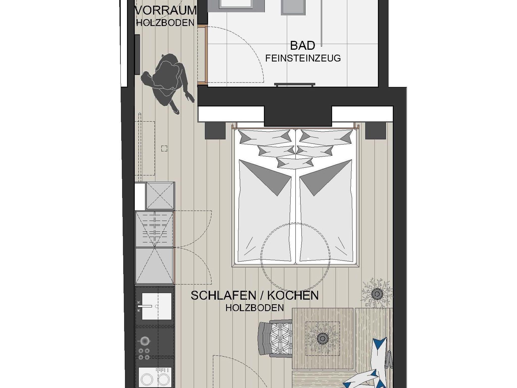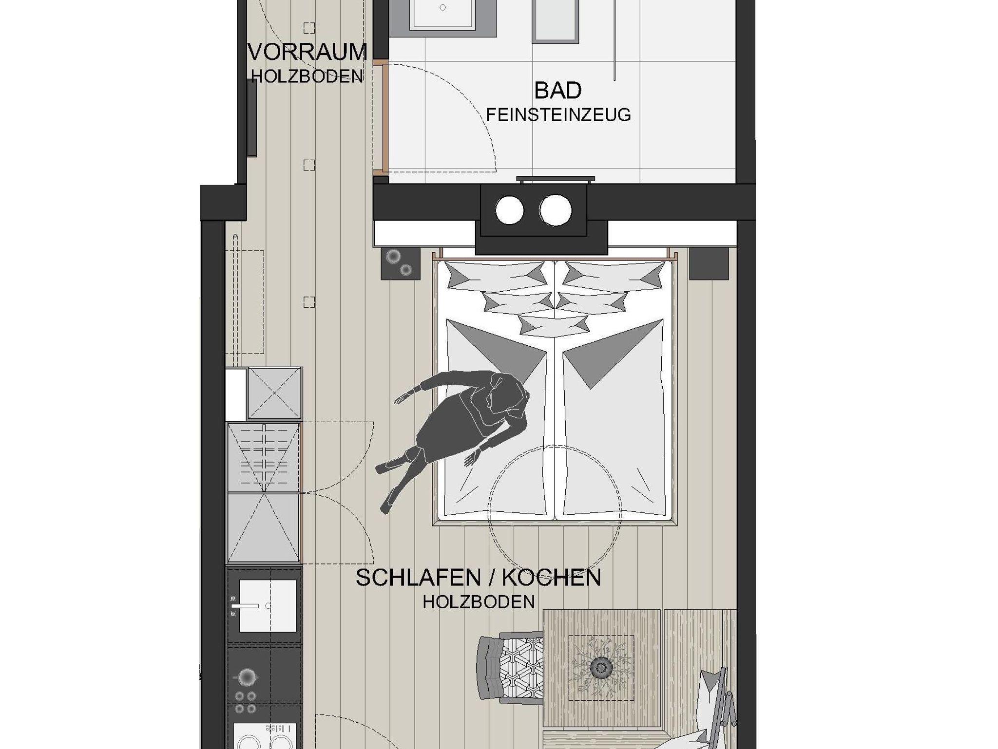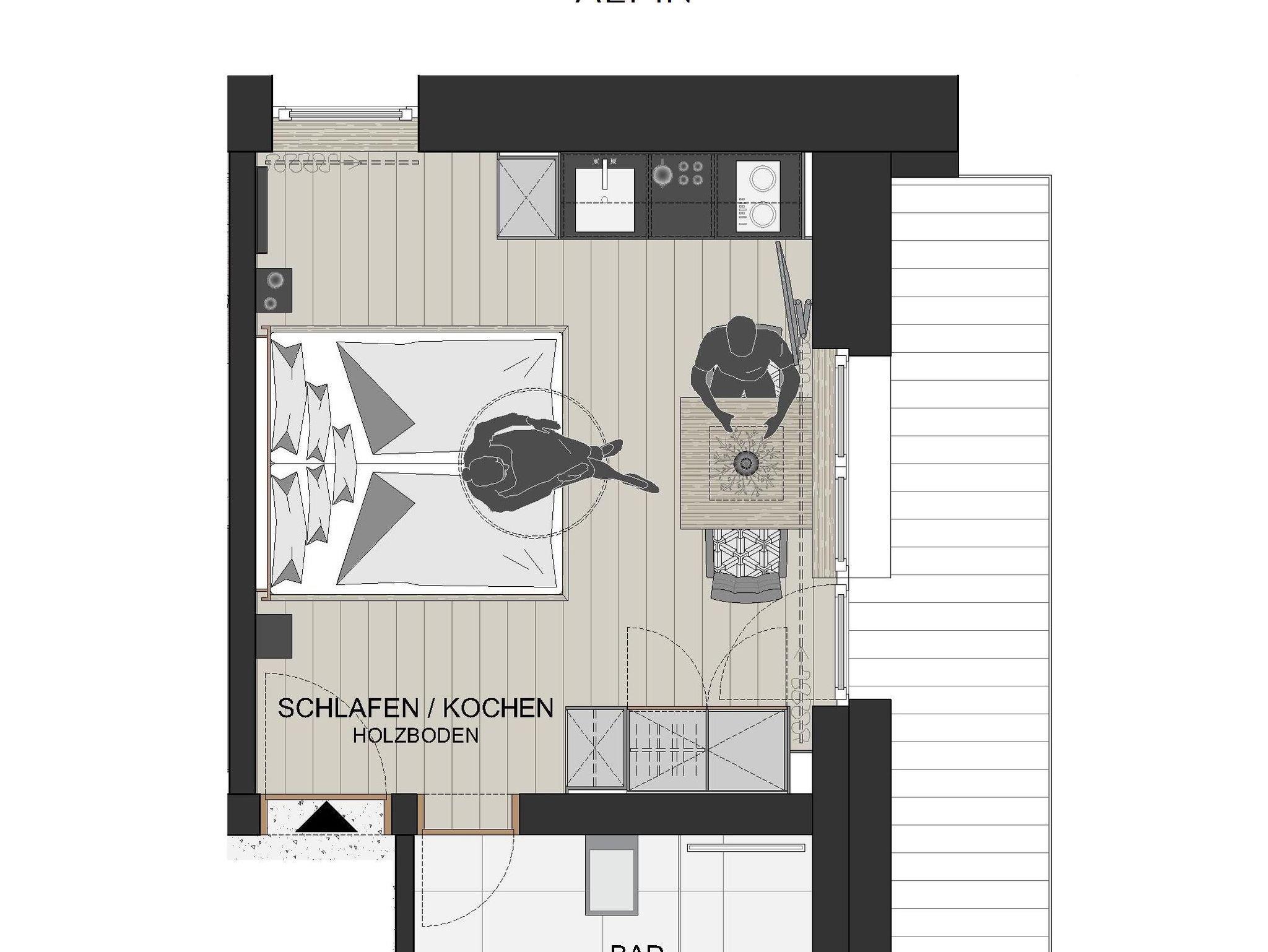 Hell, gemütlich, natürlich – einfach lovely! Die helle und freundliche Einrichtung der Doppelstudios Lovely Alpin gepaart mit dunklen Akzenten sorgt für sofortigen Wohlfühl-Effekt. Hochwertiges Bett aus Zirbenvollholz für pure Erholung während des Schlafs. Kitchenette für die nötige Flexibilität bei der Verpflegung. Kleiner Essbereich, Badezimmer mit Walk-In Regendusche und WC. Auf den Balkonen die Sonne und das Bergpanorama genießen. Glasfaser-TV, Telefon, Safe und kostenloses WLAN.