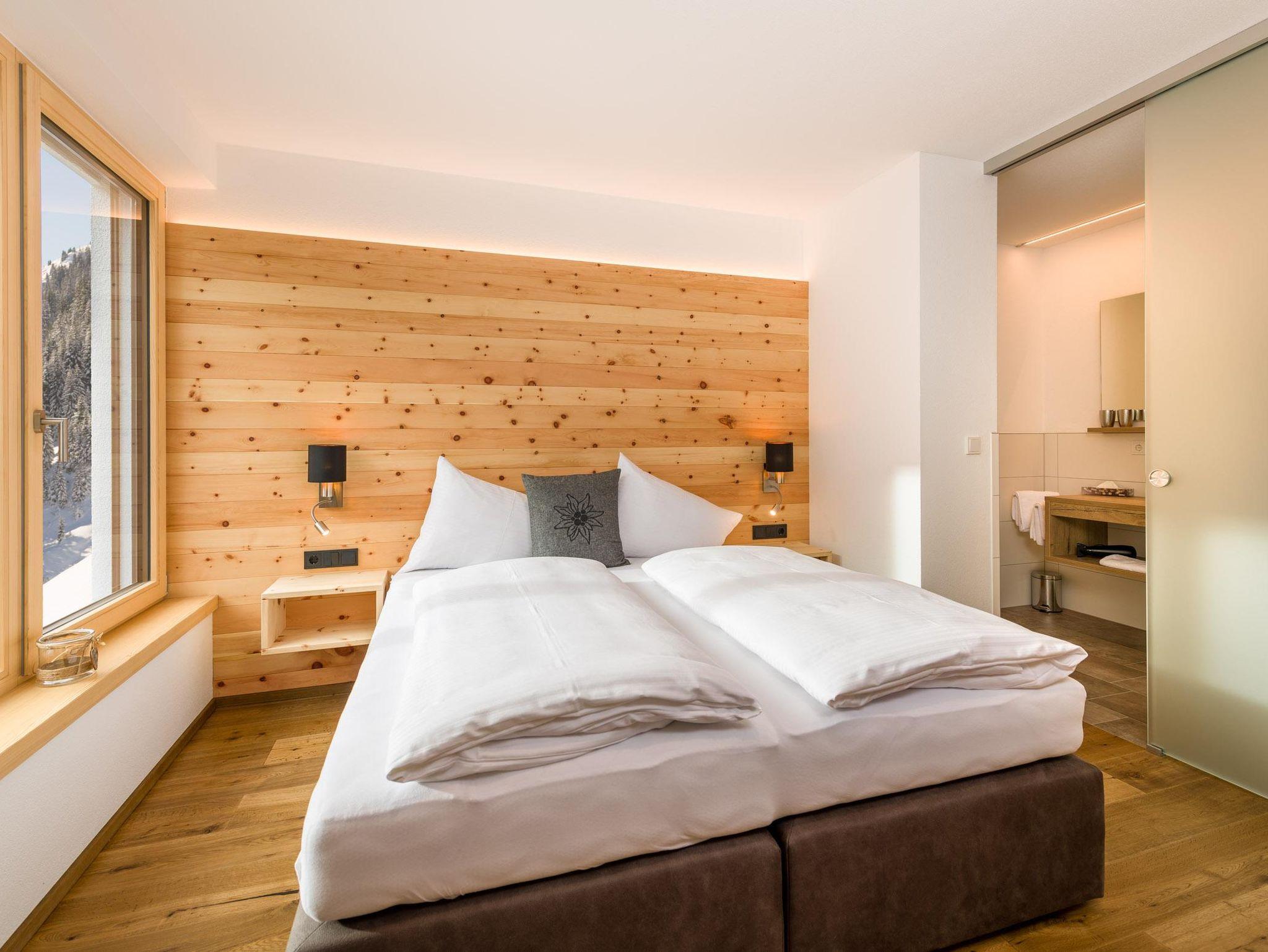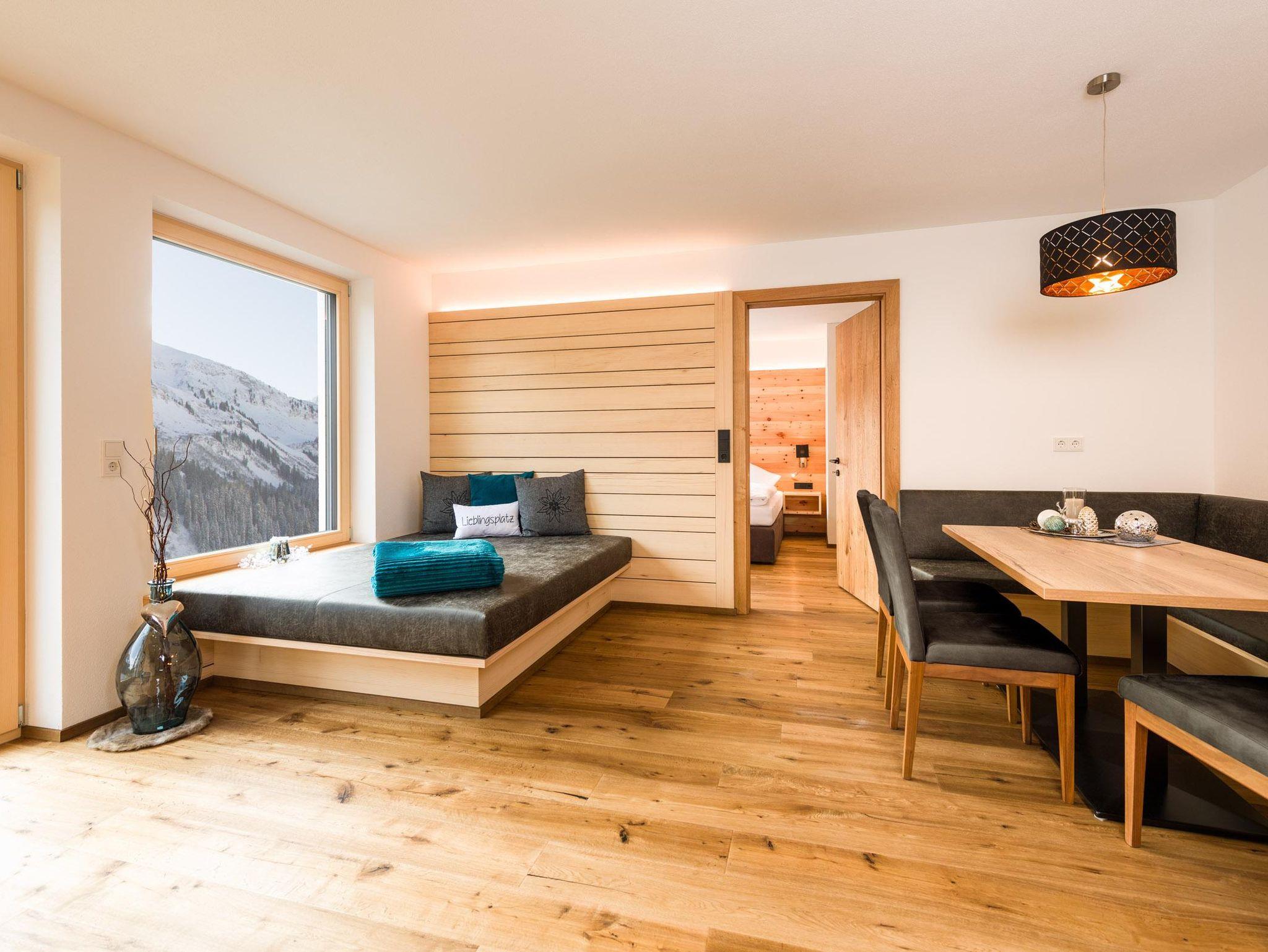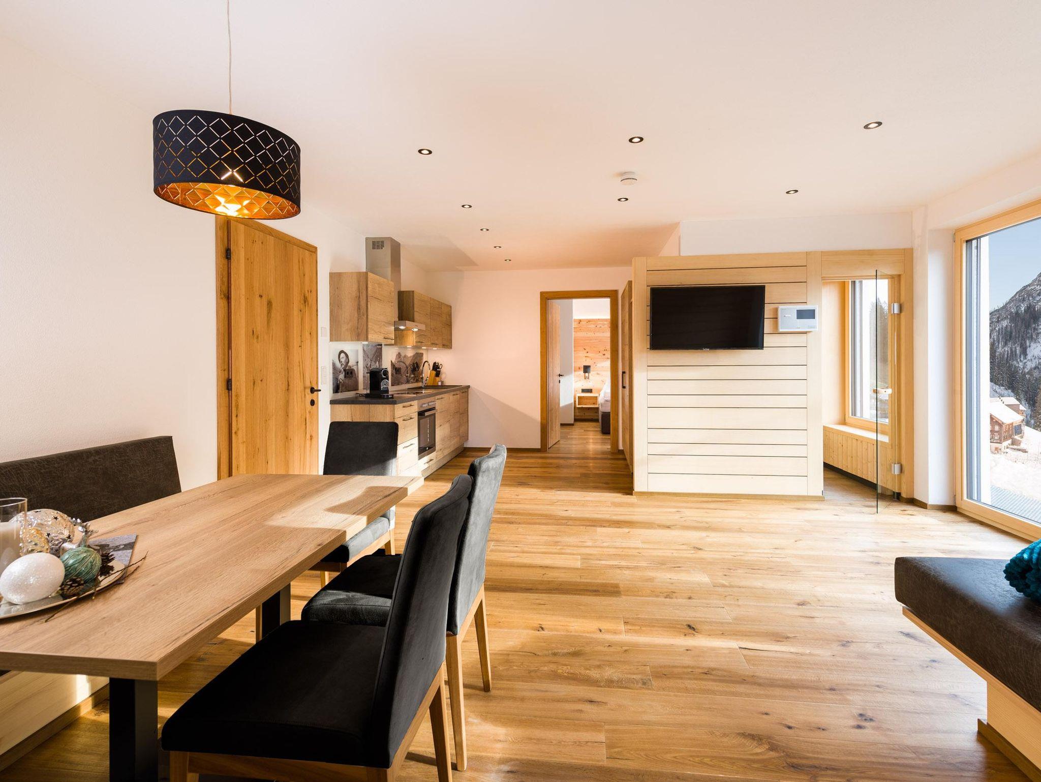 Unser modern eingerichtetes, neu eröffnetes Haus liegt mitten im Skigebiet Warth-Schröcken. Zentral aber in ruhiger Lage können Sie hier ausgiebig die Seele baumeln lassen und sind gleichzeitig nah dran an Natur, Action und Tradition. Jedes der drei Appartements hat zwei Schlafzimmer mit jeweils separatem Badezimmer. Sie eignen sich daher perfekt sowohl für junge Familien als auch für befreundete Paare, die zusammen reisen. Die großzügig geschnittenen Wohnungen verfügen außerdem über eine moderne, komplett ausgestattete Küche, eine große Terrasse mit Traumblick-Garantie und einen eigenen Wellnessbereich mit privater Sauna und Liegewiese mit Panoramafenster.
