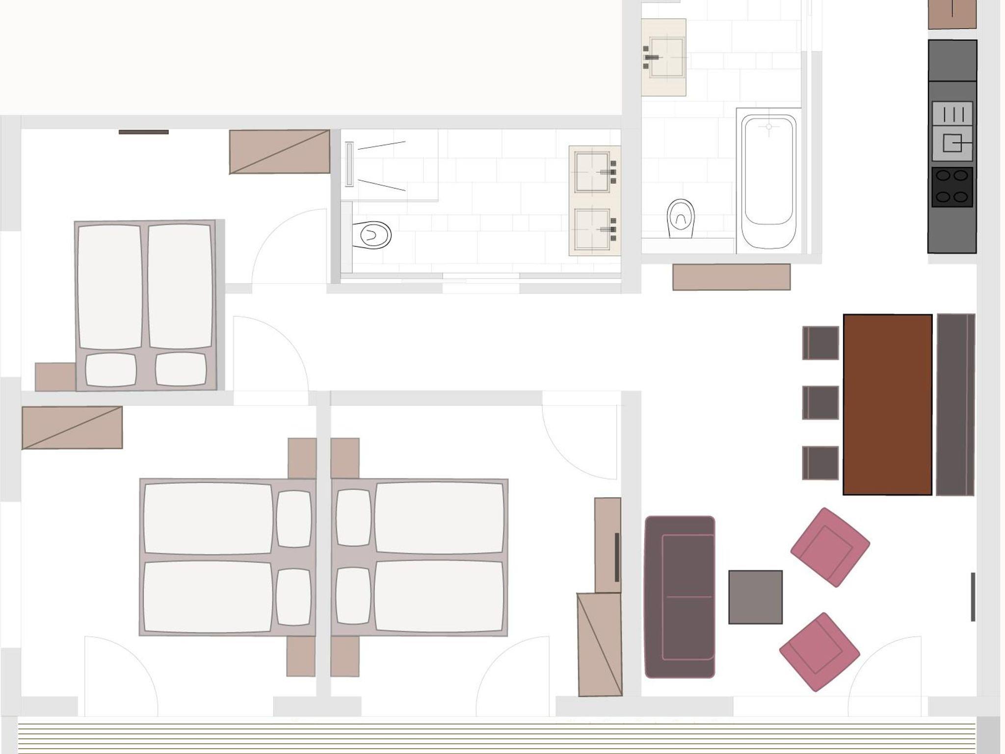 Das sehr großzügige Appartement Zilli ist 90 m2 groß und verfügt über 3 Schlafzimmer (2 Doppelzimmer und ein Schlafzimmer mit Queensizebett für 2 Personen). Ein Badezimmer ist ausgestattet mit Dusche und WC, das zweite Badezimmer verfügt über Dusche und Badewanne, Doppelwaschbecken und WC. Der großzügige Wohnraum ist ausgestattet mit einer Wohnecke mit Sofa, gemütlichem Essbereich, voll ausgestattete Küche und Garderobe. Großer Balkon mit Blick ins Skigebiet nach Süden.