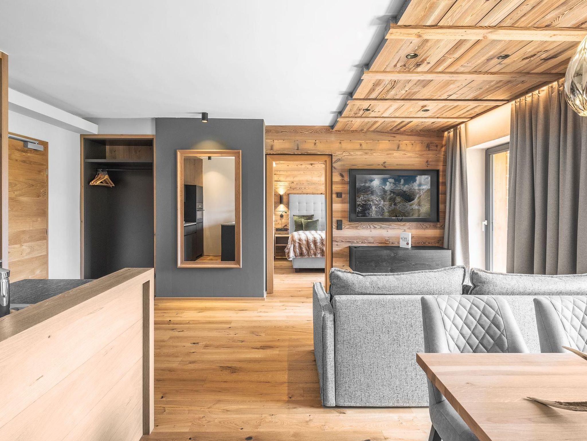 65m² Lodge Feeling | Getrennter Schlaf- & Wohnraum | 2 Schafzimmer mit großen Boxspring-Betten| 1 Zusatz Sofabett möglich | 2 en Suite Badezimmer mit WC, Wellnessdusche oder Wanne | Terrasse oder Balkon mit herrlichem Postkartenblick auf das atemberaubend Bergpanorama | Haartrockner & Kosmetikspiegel | Beauty & Vanity Produkte | Handtücher & Bademäntel für Erw. für unser Alpen Spa | voll ausgestattete Küche mit Elektroherd, Backrohr, Mikrowelle, Kühlschrank, Nespresso Maschine, Wasserkocher, Spühlmaschine, Ess- und Kochgeschirr | TV in allen Wohn- und Schlafbereichen, WIFI |