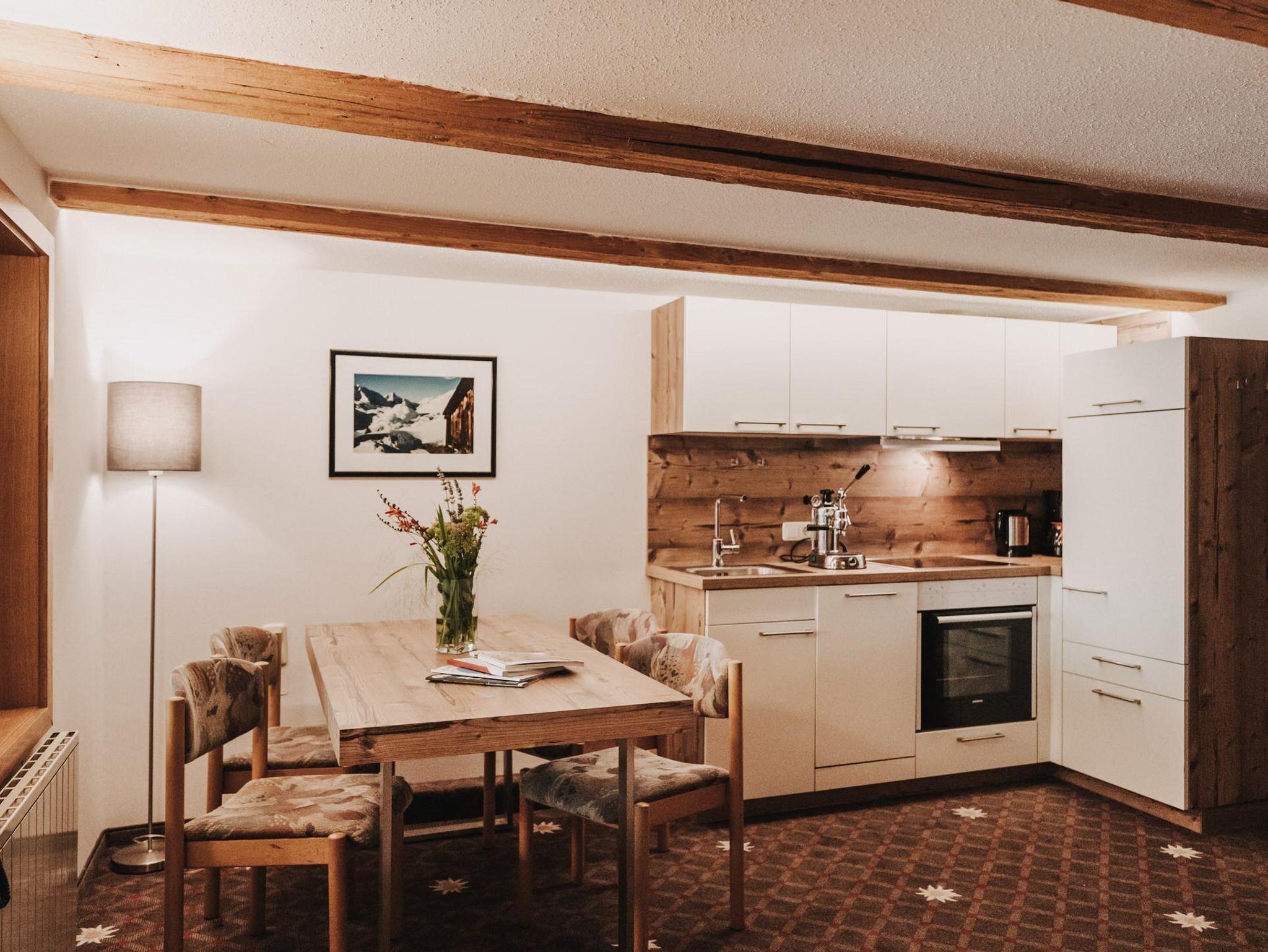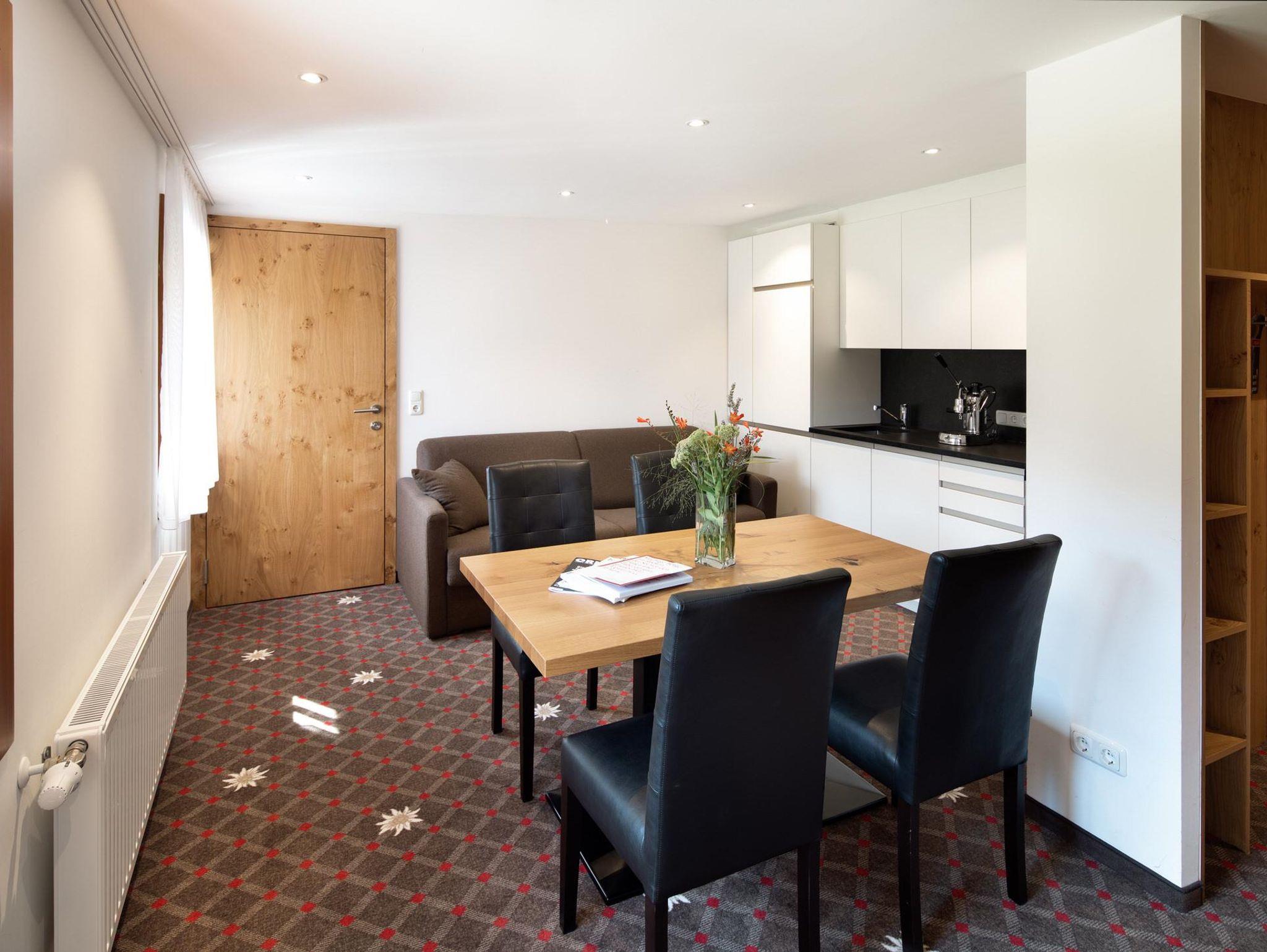 Ausgestattet mit Dusche/WC oder Bad/WC, ca. 40m2, 1 abgetrenntes Schlafzimmer mit Doppelbett, Wohnbereich mit Doppelschlafcouch, kleine Küche, Essbereich, kostenloses WLAN, SAT-TV/Radio, Safe, Fön, 1 Garagenplatz. Alle Hotelsuiten befinden sich ruhig gelegen im 1. und 2. Obergeschoss im Haupthaus mit Blick nach Westen, Norden und Süden