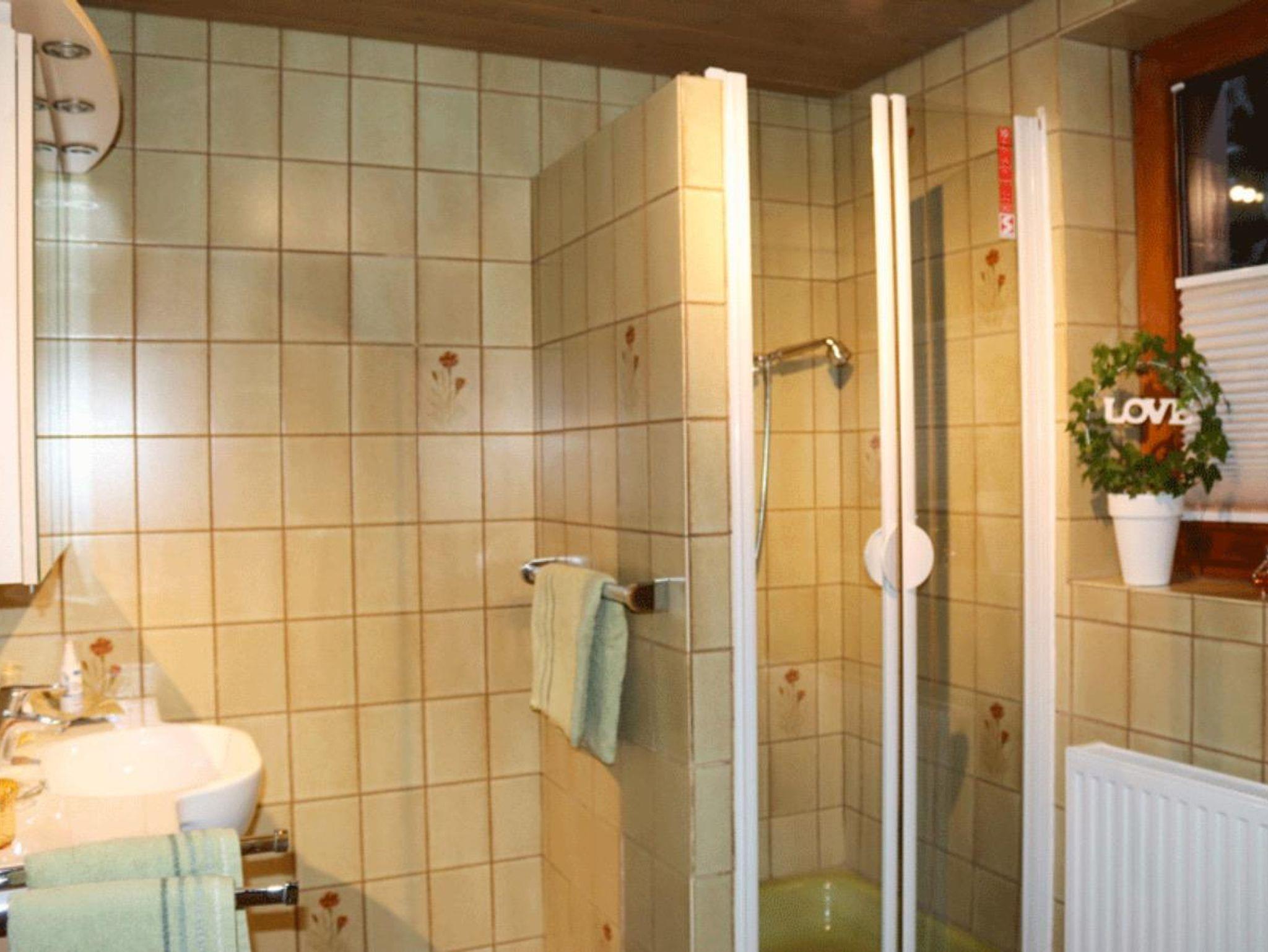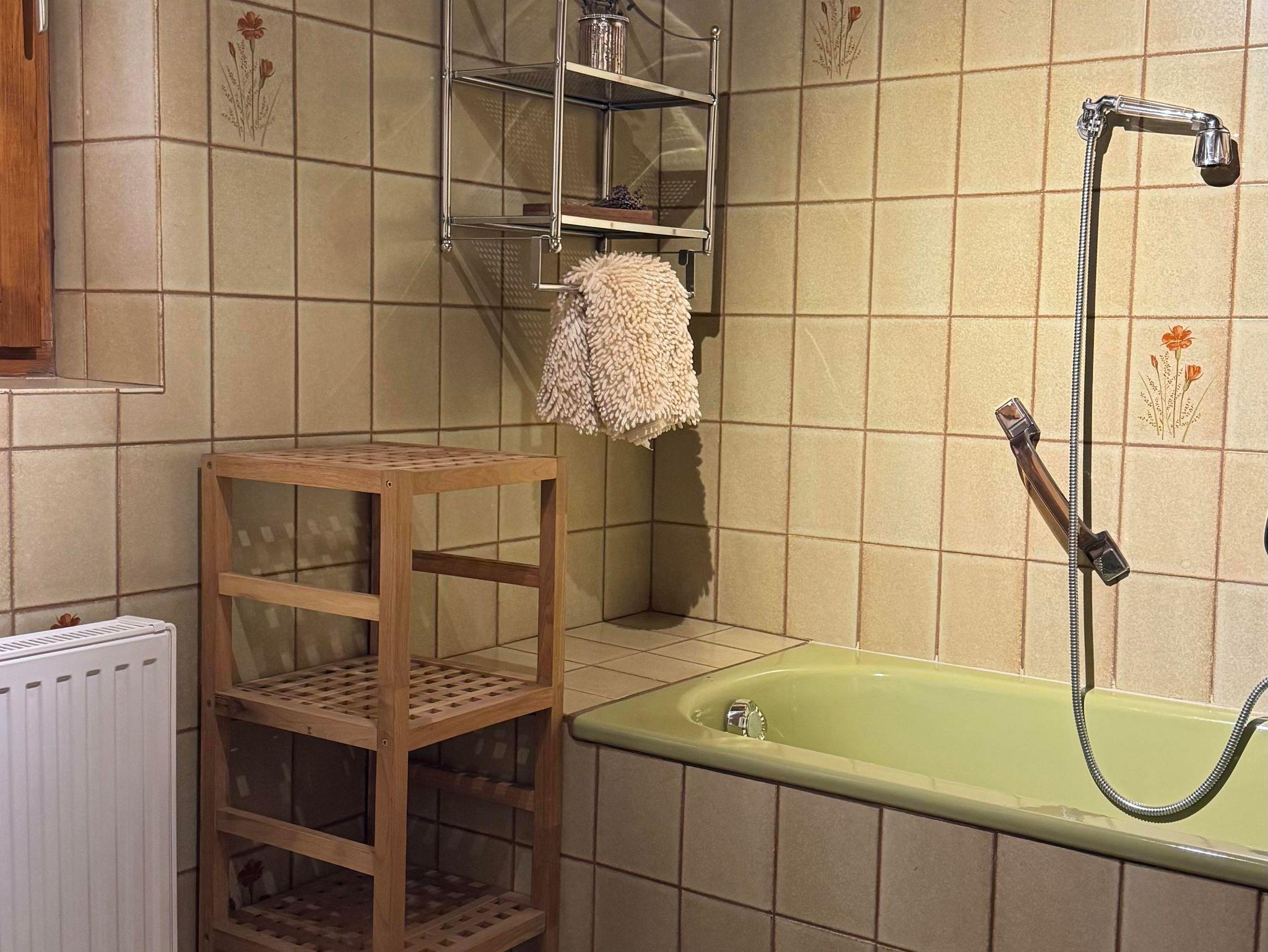 Das Haus verfügt im Erdgeschoss über eine große Wohnküche mit Holzküchenofen, ein Bad mit Badewanne und Dusche, extra WC.