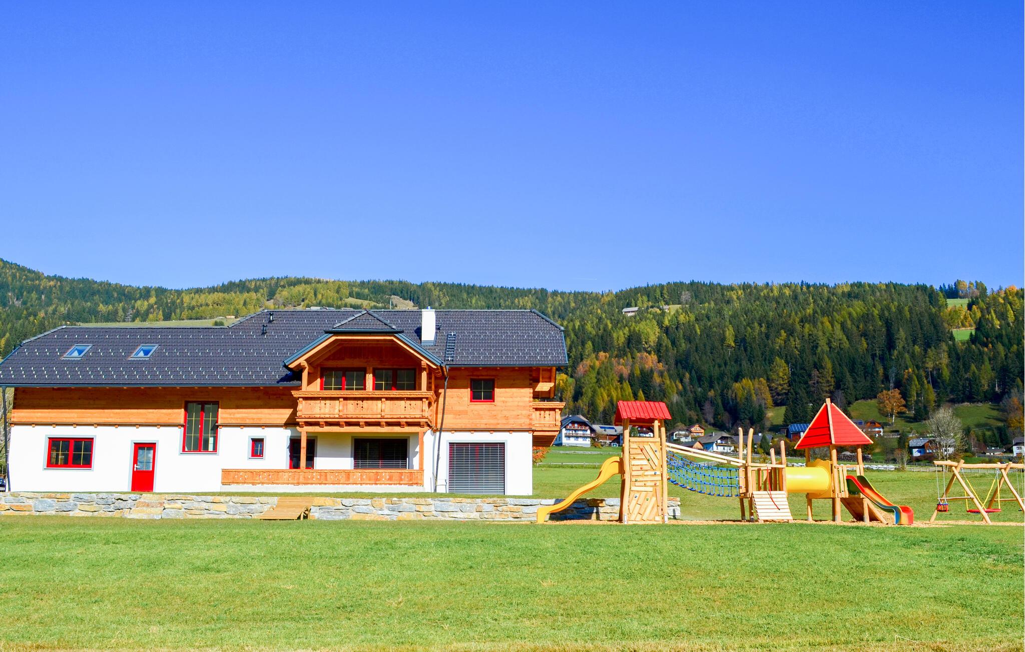 På de varme dage kan I begynde dagen med en friskbrygget kop kaffe på altanen, tabe kæben over bjergudsigten og holde øje med børnene, der klatrer, gynger og leger på legepladsen.