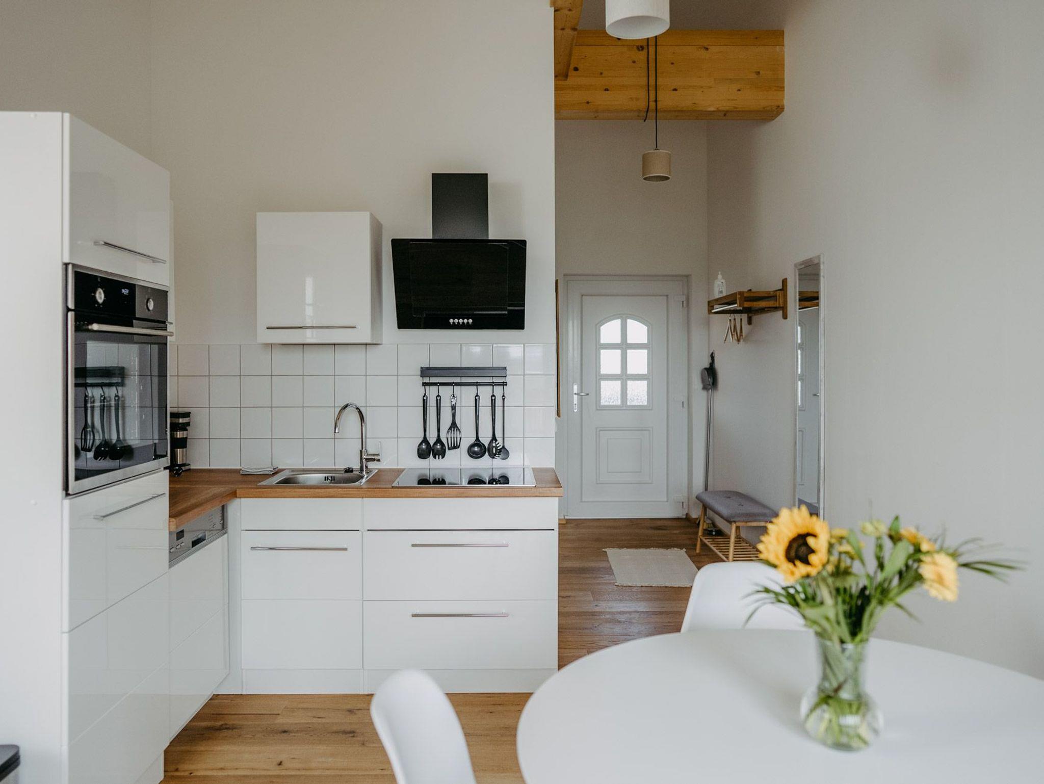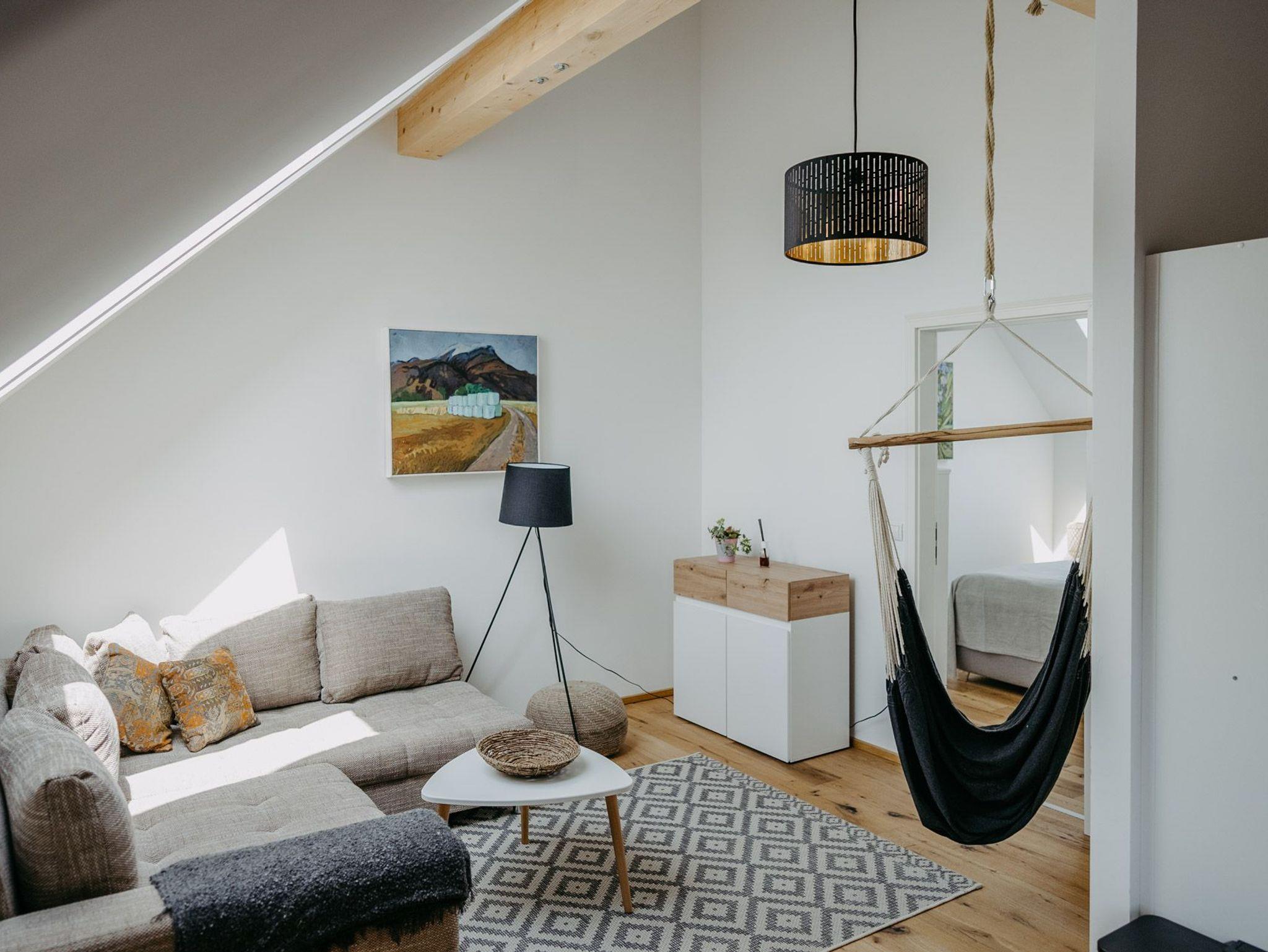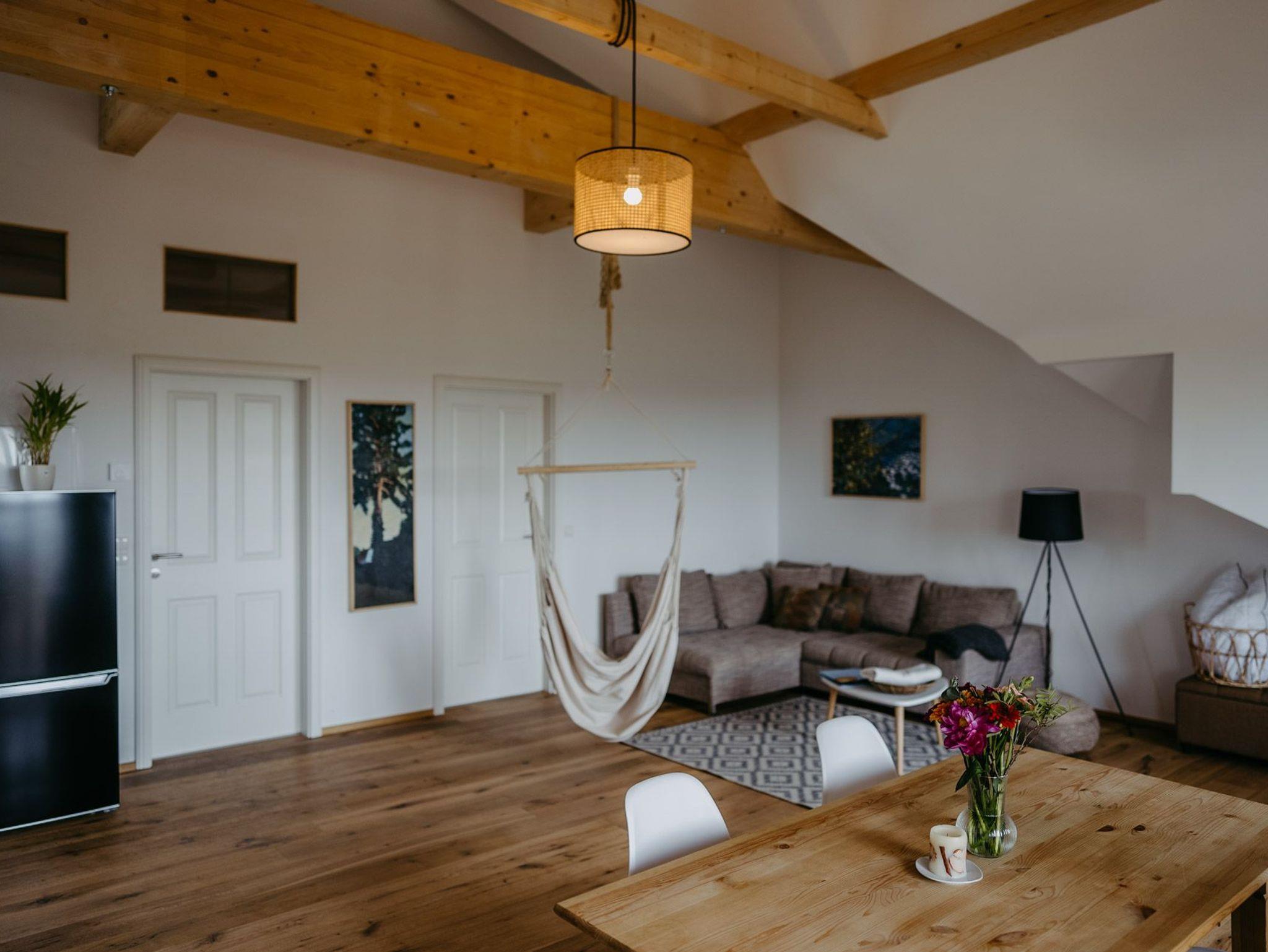 50m² Apartment, Fußbodenheizung, 1 Schlafzimmer mit King Size Bett, Smart TV und Safe. 1 großer Wohnraum mit Wohnzimmer, ausziehbarer Couch in Doppelbettgröße und Hängeschaukel, Esszimmer und Küchenzeile, überdachter Balkon, Badezimmer, 3h privater Saungang inklusive, eBike Schnupperstunde inklusive, Obstkorb, Burgenland Bonus Card inklusive