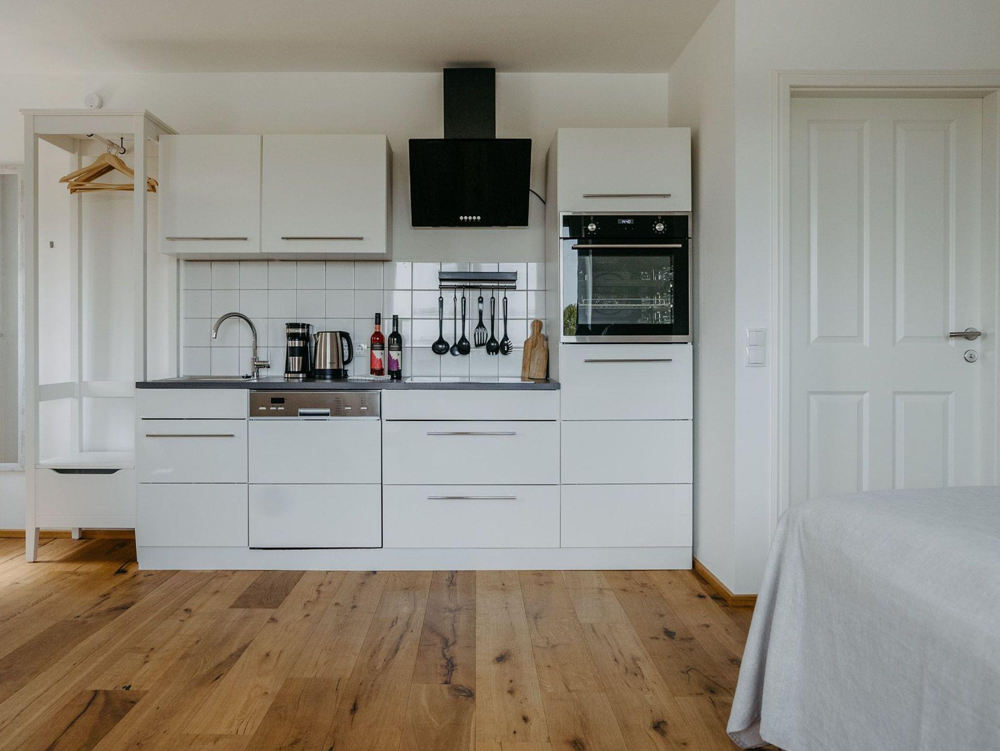 31m² Apartment, 1 King Size Bett, Smart TV und Safe, ausziehbares Schlafsofa in Doppelbettgröße, Küchenzeile, überdachter 10m² Balkon Richtung Westen (Sonnenaufgang), Badezimmer, Ausrichtung Westen
