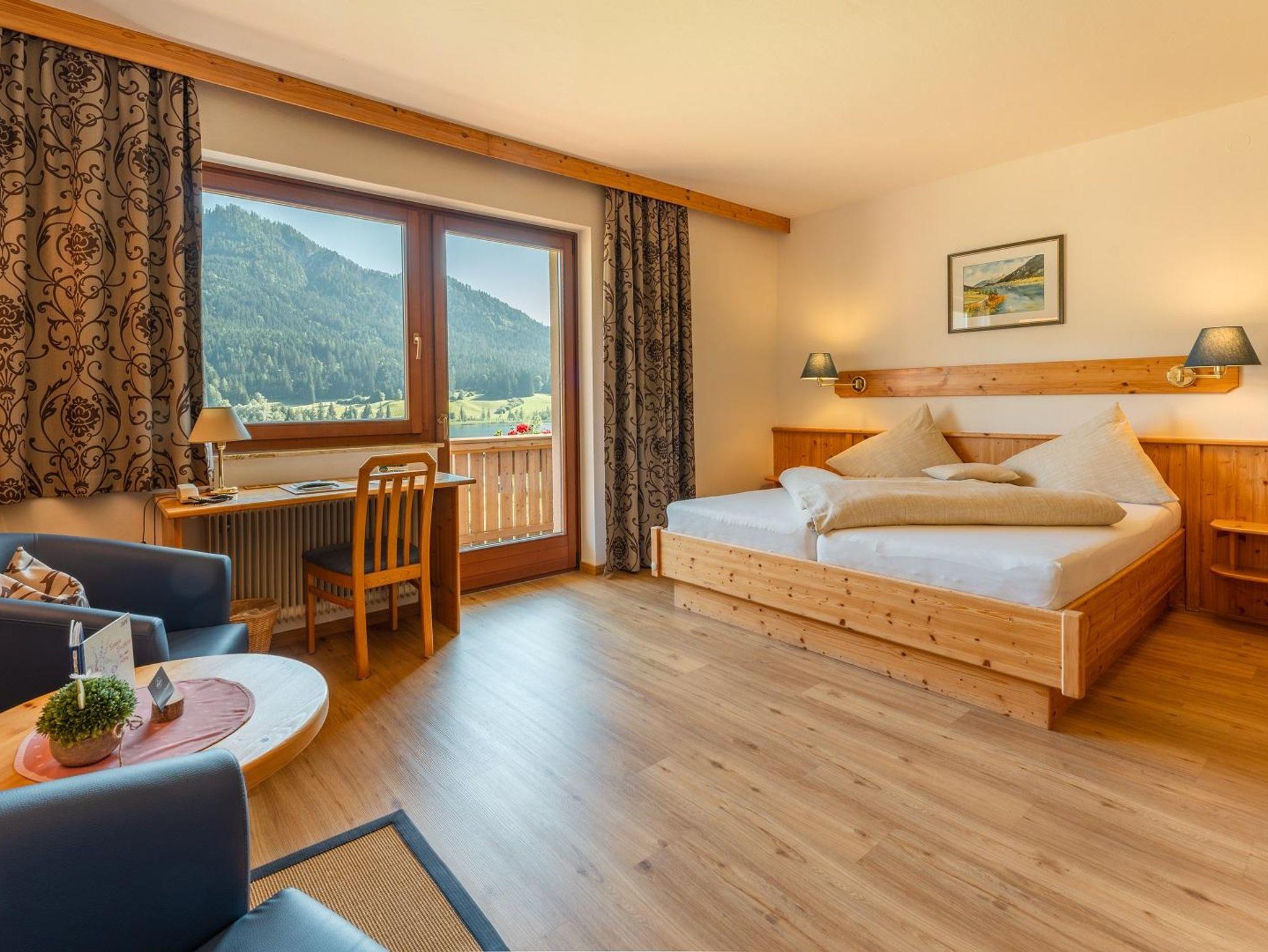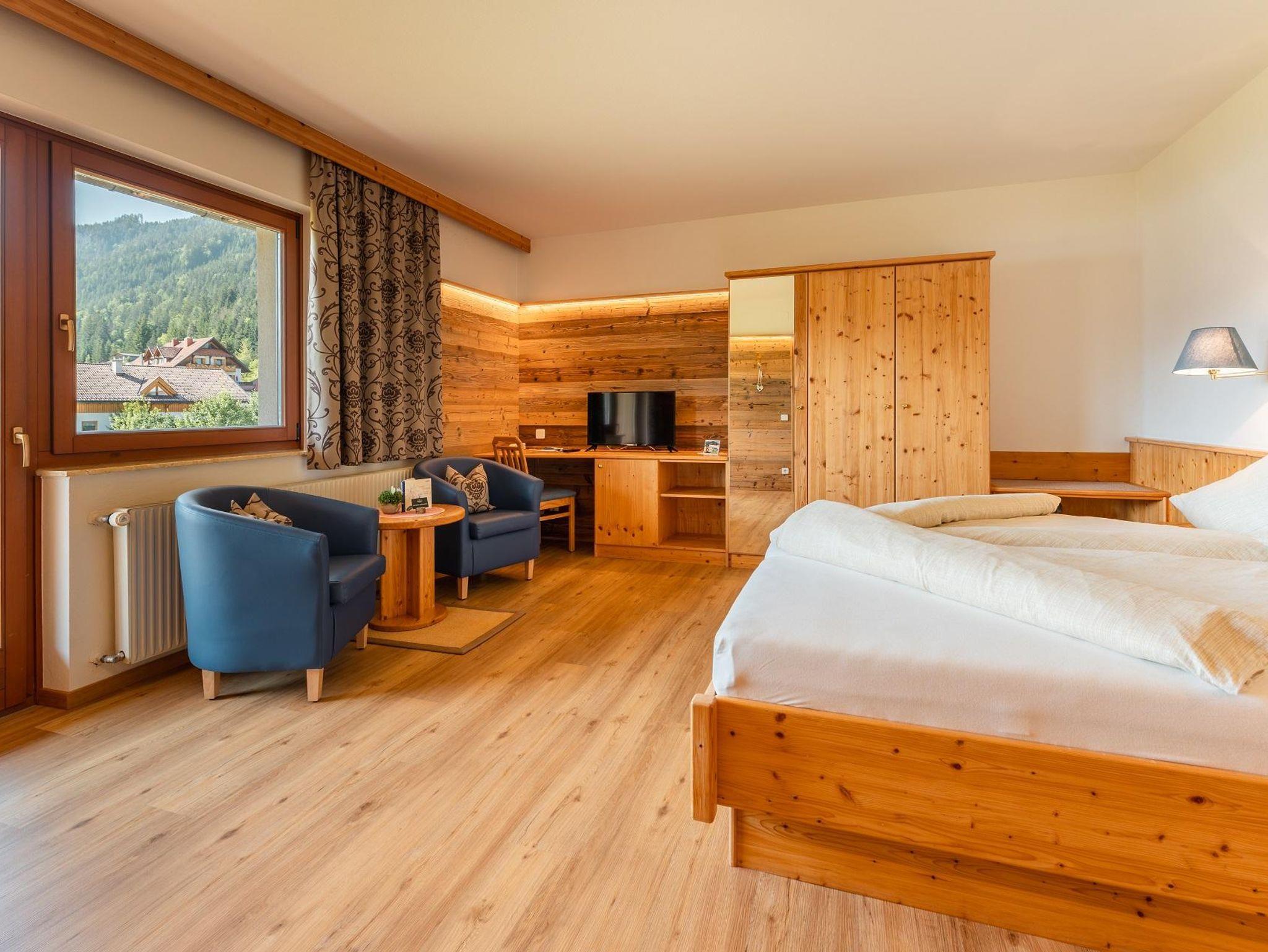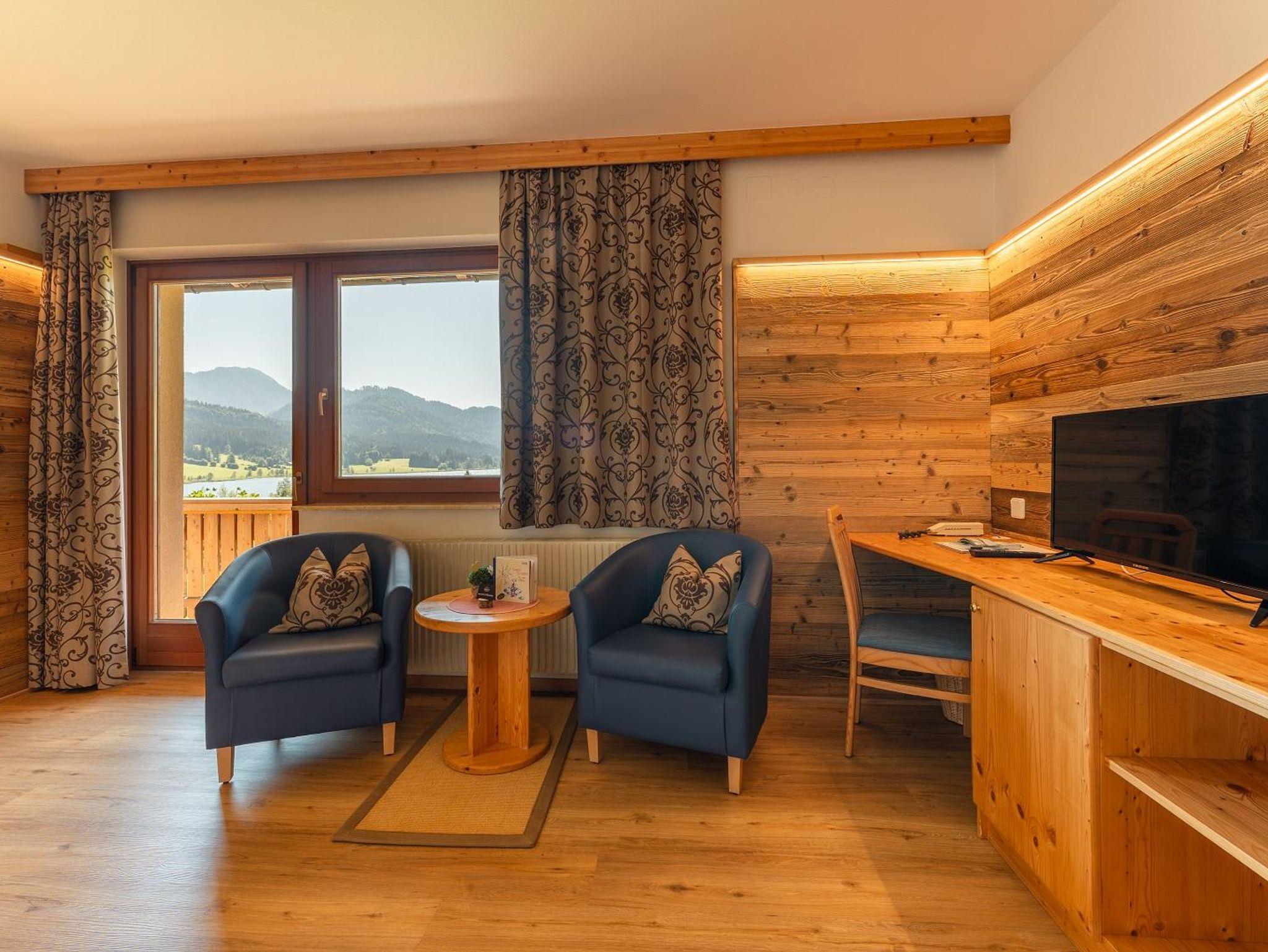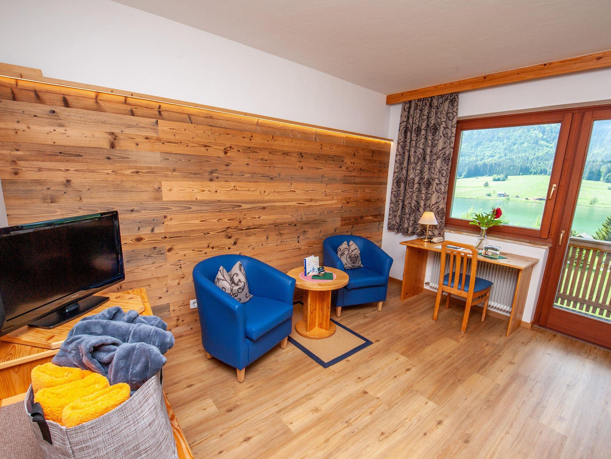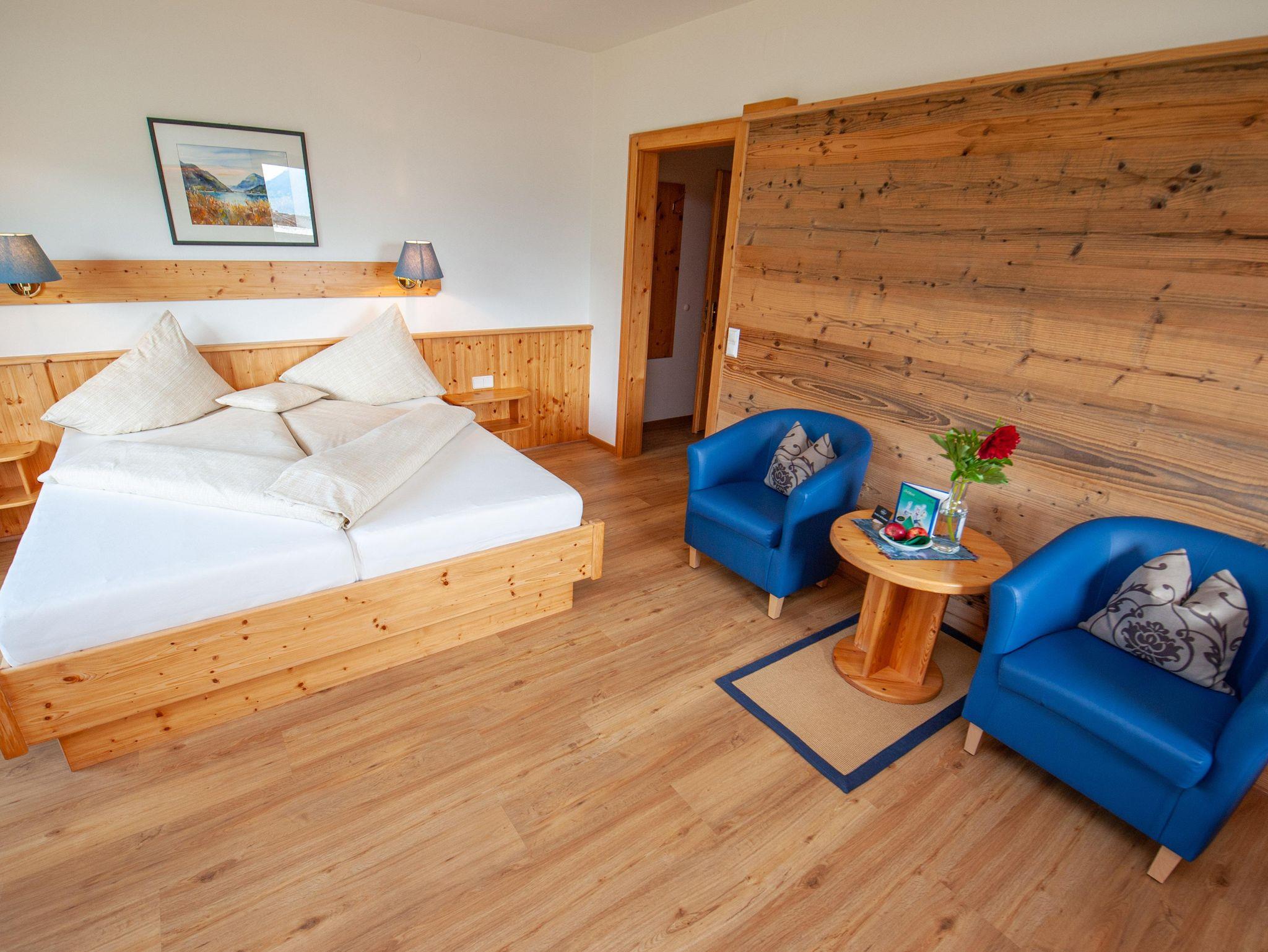 Unsere Doppelzimmer Südseite, sind alle hell und freundlich eingerichtet - Naturholzmöbel - großer Balkon mit Seeblick, haben zw. 27 und 32m² , Sitzecke, TV, Schreibtisch.