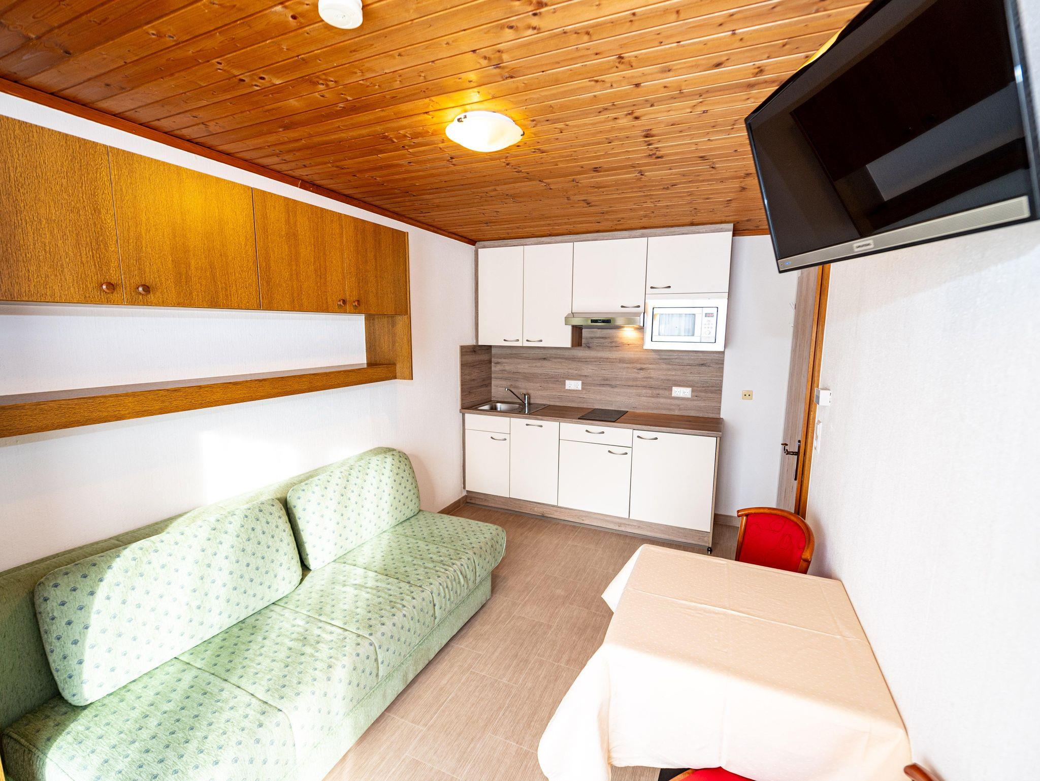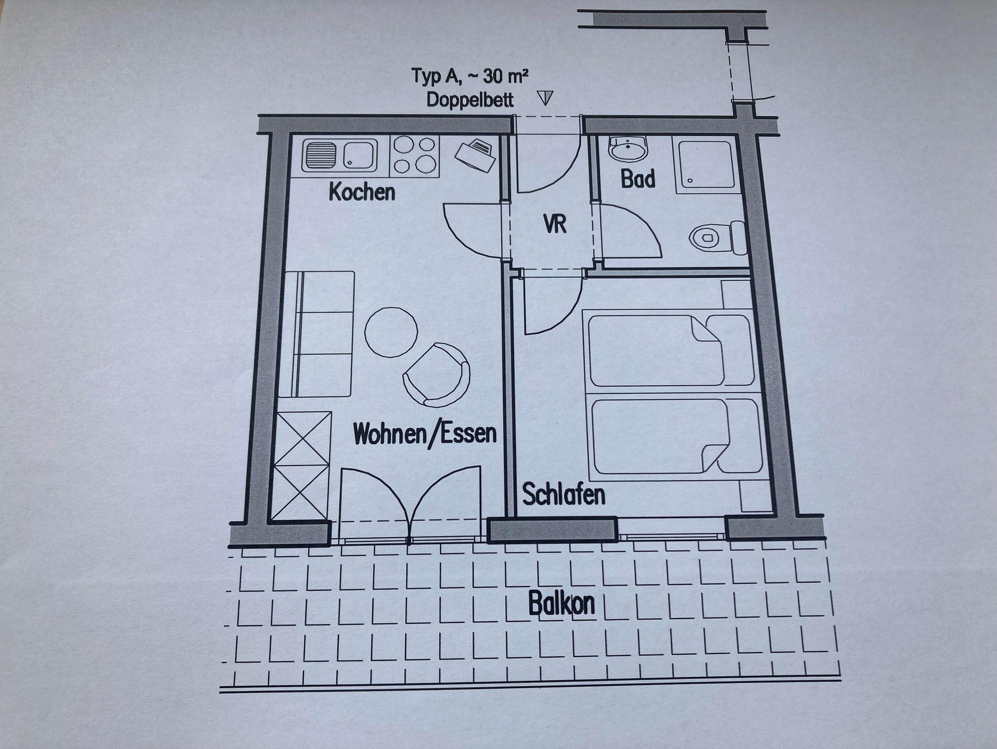 Fewo mit 30 m²/ Doppelzimmer, Wohnraum mit Schlafcouch, Kochnische, Dusche, WC, Sat-TV, Safe, Südbalkon zum See.