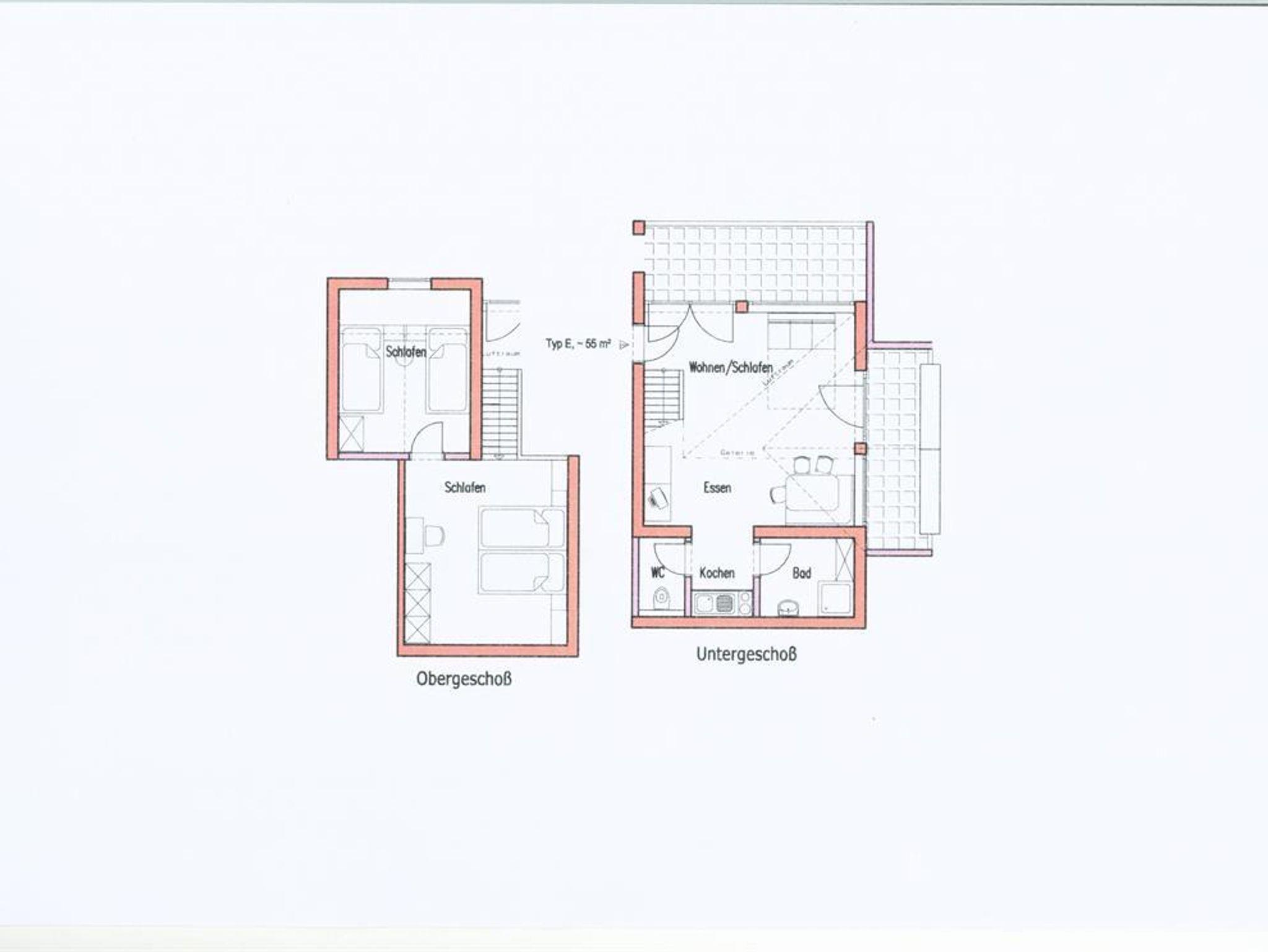 55 m² / Etagenwohnung - Galerieschlafzimmer mit Doppelbett, Zweibettzimmer mit Zusatzbett, Wohnraum mit Schlafcouch, Eßecke, Kochnische, Dusche, sep. WC, Sat-TV, Safe, Balkon, Loggia.