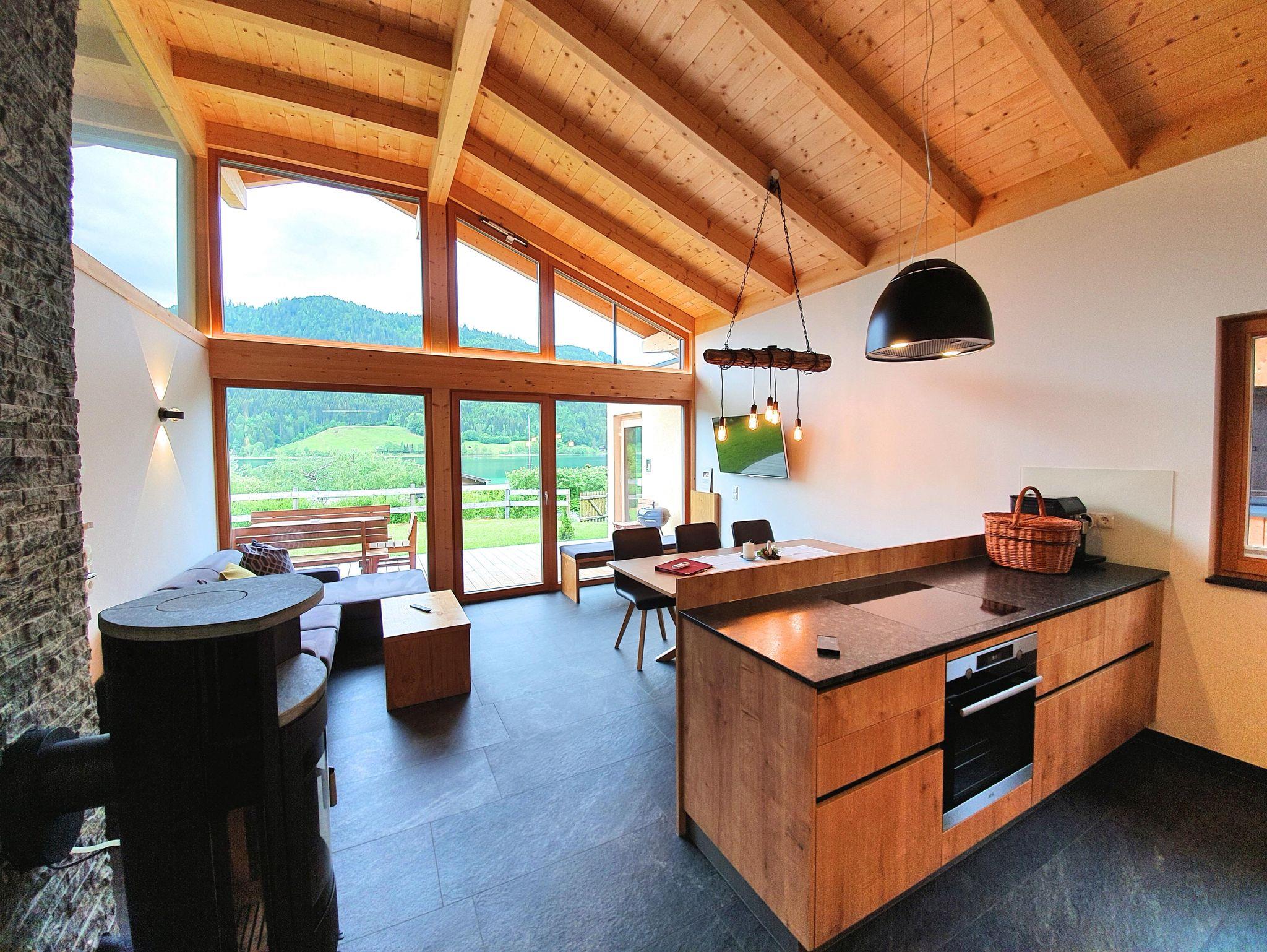 Erdgeschoss: Wohnzimmer mit Kachelofen, Tel., Smart-TV, Safe, gratis Internet, Terrasse, Balkon mit Seeblick.