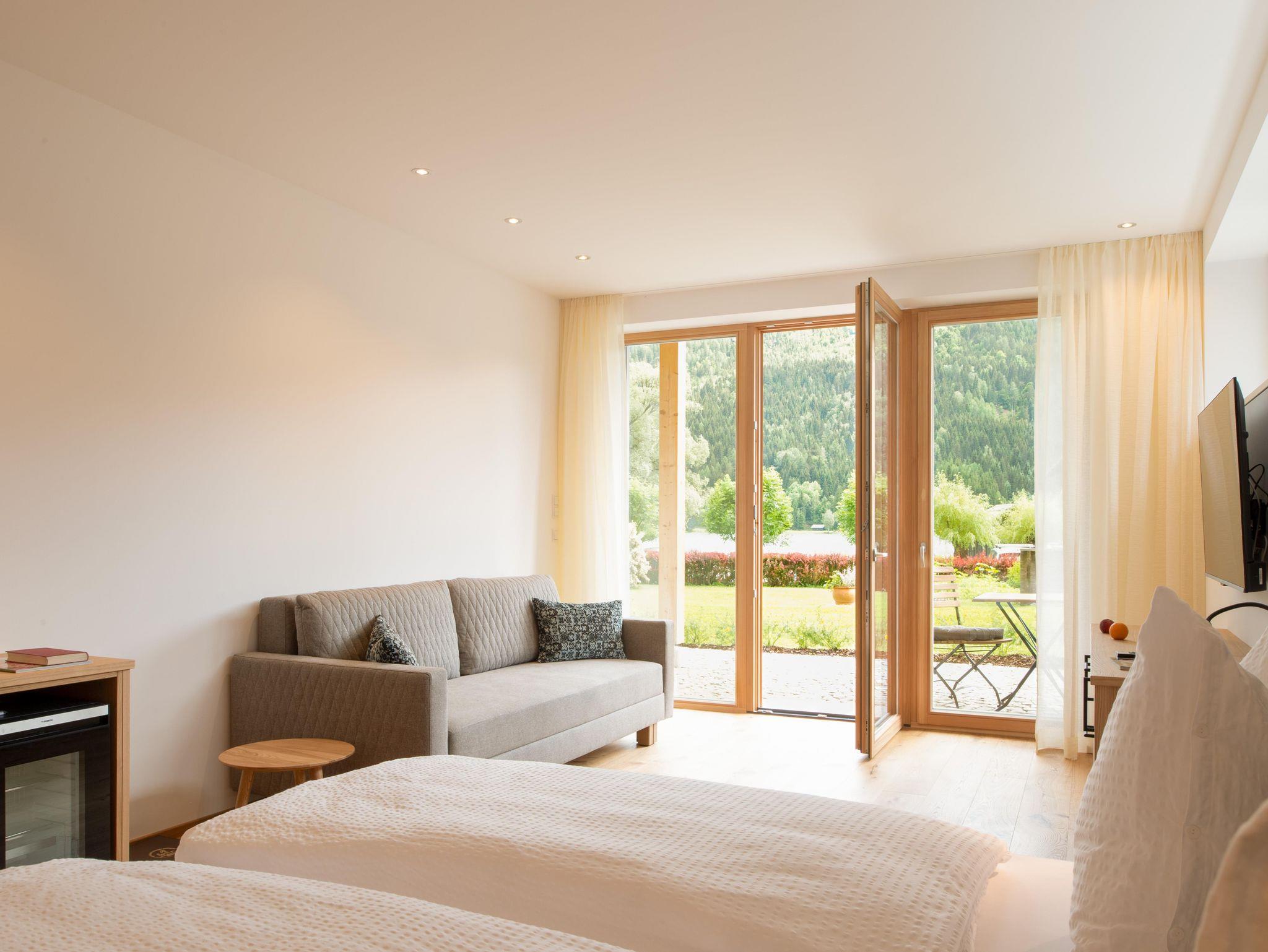 Sehr komfortables, barrierefreies Doppelzimmer mit direktem Seeblick, gehobene Ausstattung, modernes barrierefreies Badezimmer mit WC und Dusche, SAT-TV, Internet mit Glasfaseranschluss, großzügige Terrasse mit fantastischem Ausblick auf den See.