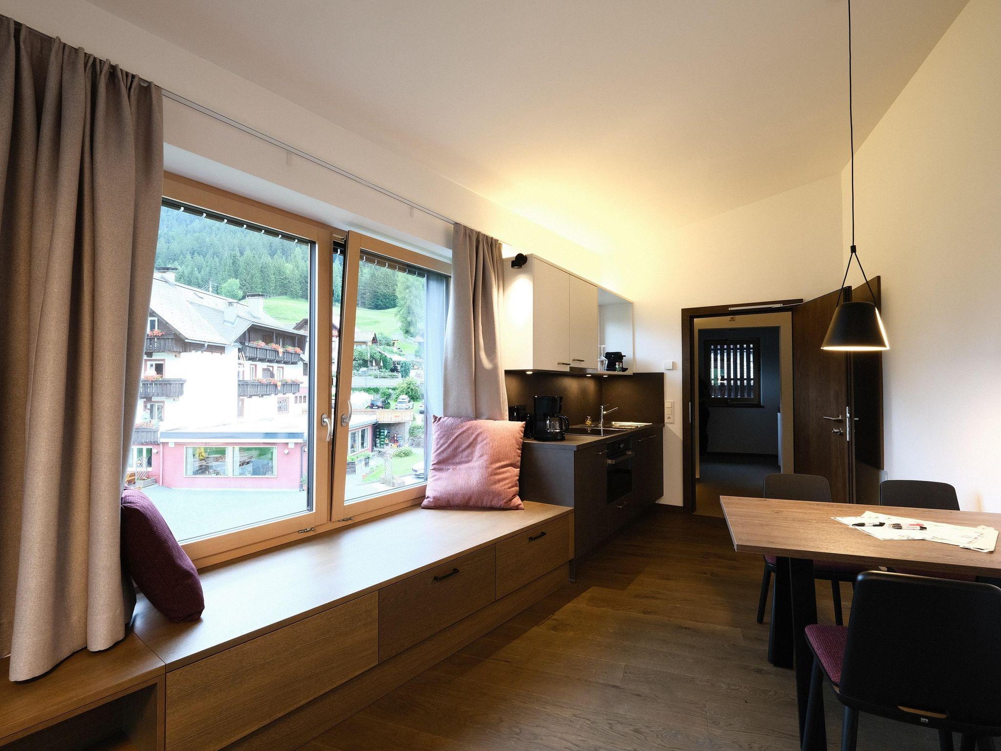 • Wohn-Esszimmer mit Aussichts-Sitzfenster und Zugang zum Panoramabalkon