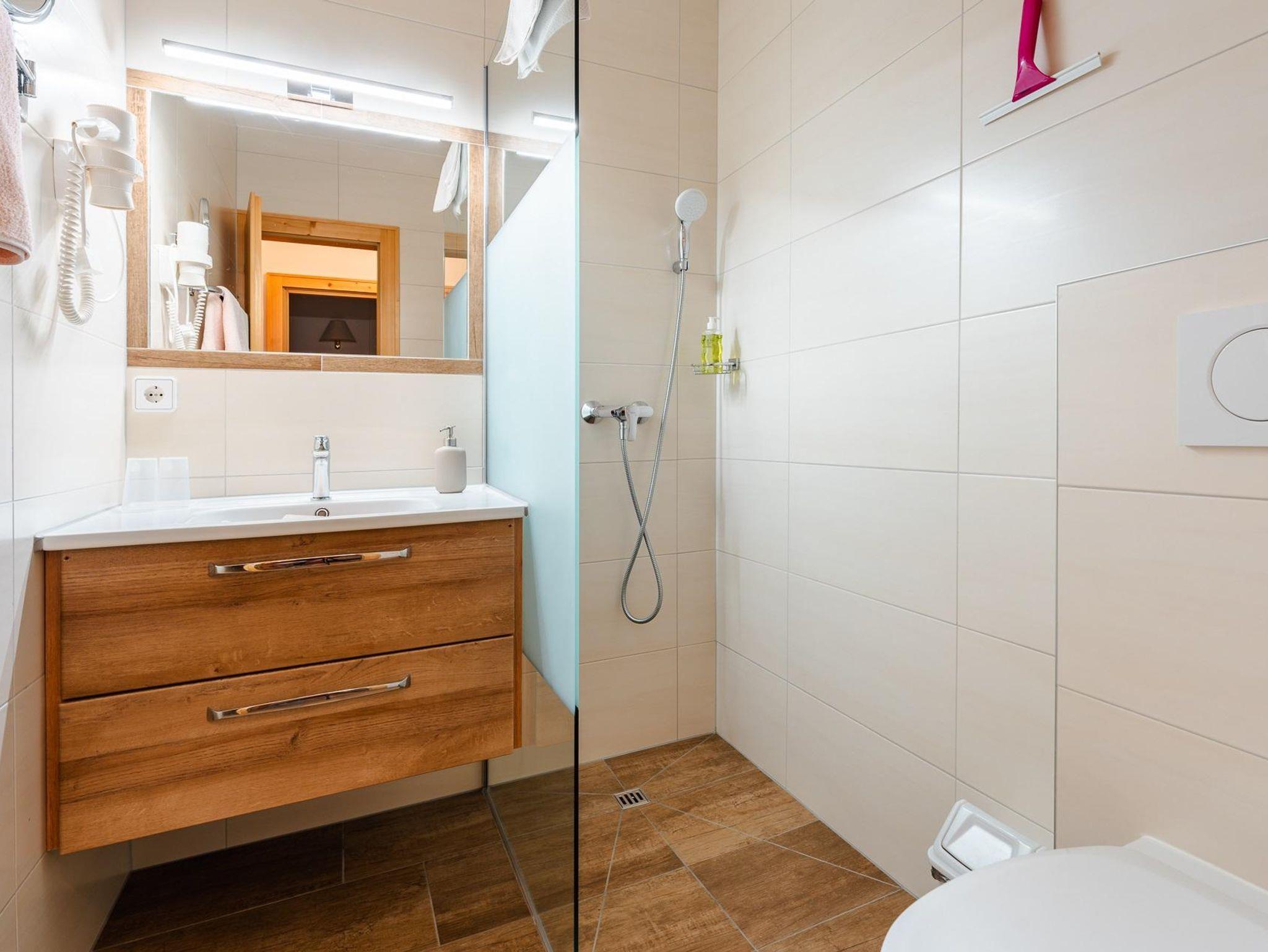 Unser Einzelzimmer zur Hofseite, ist 25 m² groß und natürlich mit Dusche und WC ausgestattet. Schrank, Flachbildfernseher, Schreibtisch, Garderobe.
