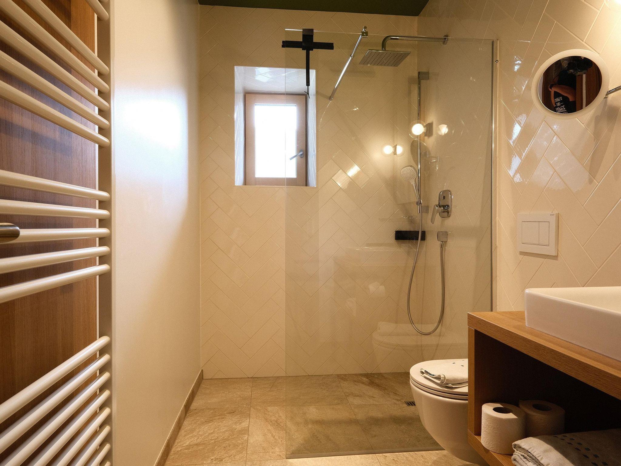 • Badezimmer mit Dusche, Badewanne, WC, Waschbecken mit Kosmetikspiegel und Fenster