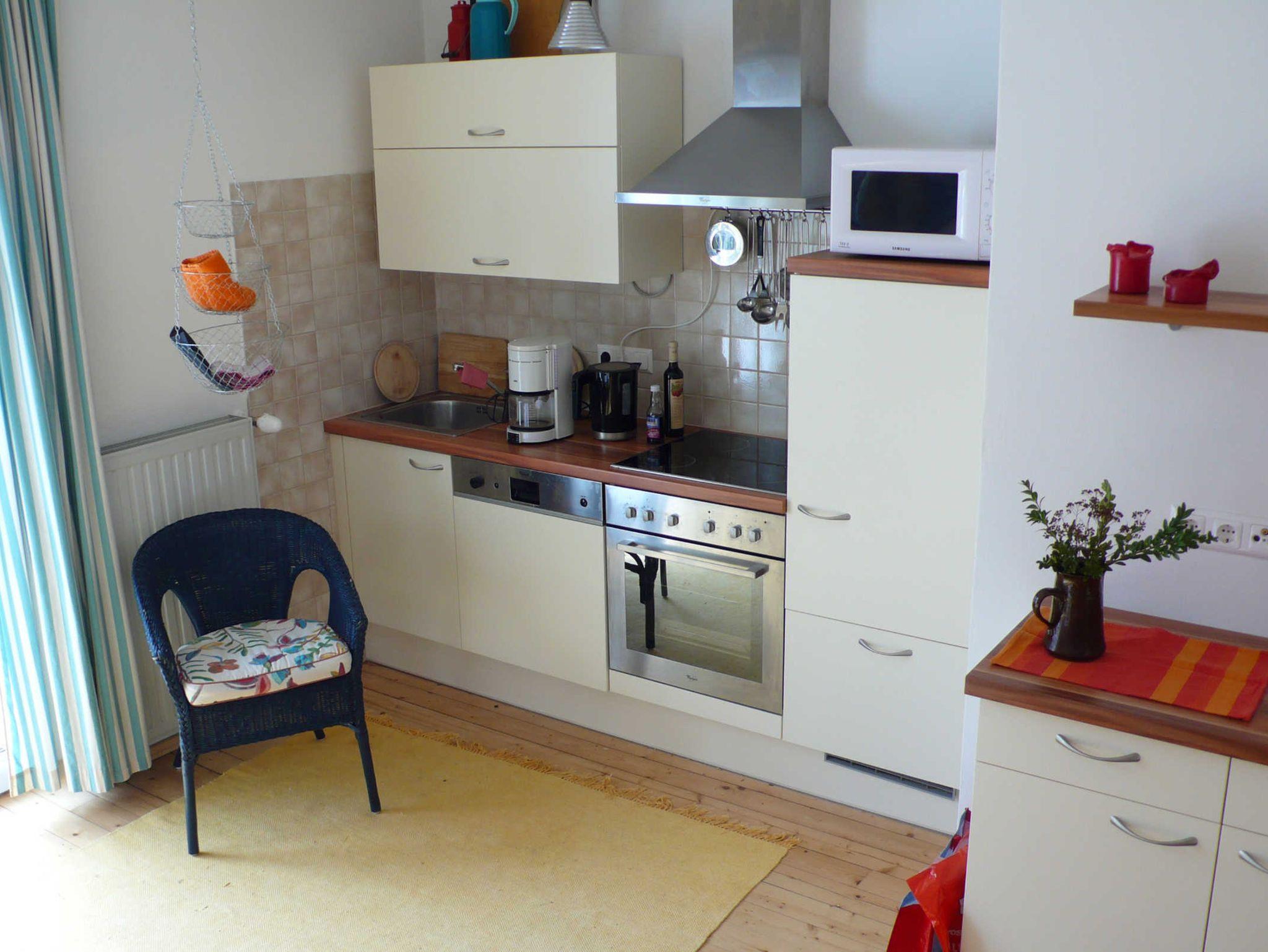 Wohnung mit großem Wohnraum, der eine gut ausgestattete Küchenzeile mit Backofen, Mikrowelle und Spülmaschine enthält und Zugang zum Balkon hat. Zwei Schlafzimmer mit Doppelbetten, Sitzecke und Waschbecken; eins ist mit einem seperaten WC ausgestattet. Zusätzlich Nasszelle mit Dusche und WC.