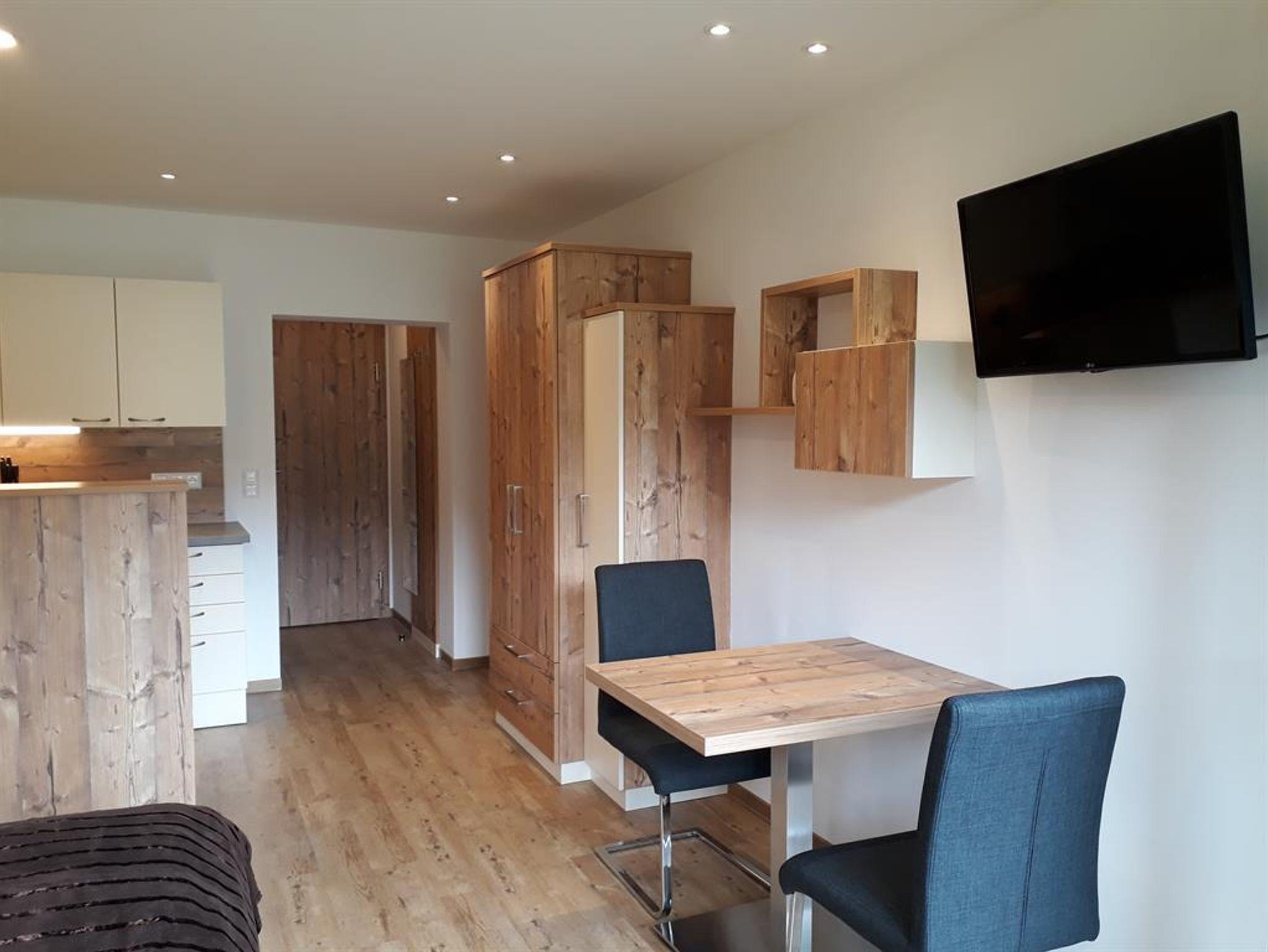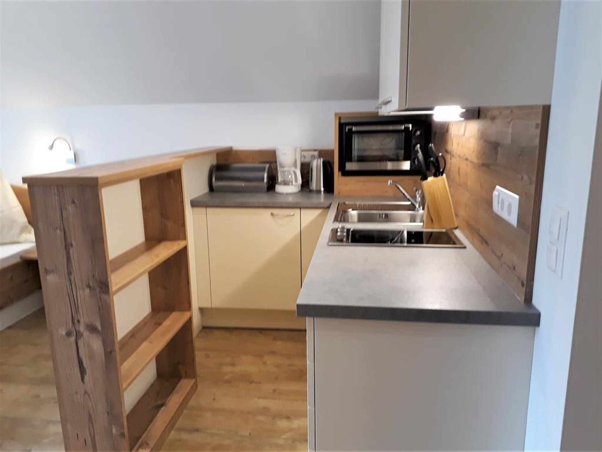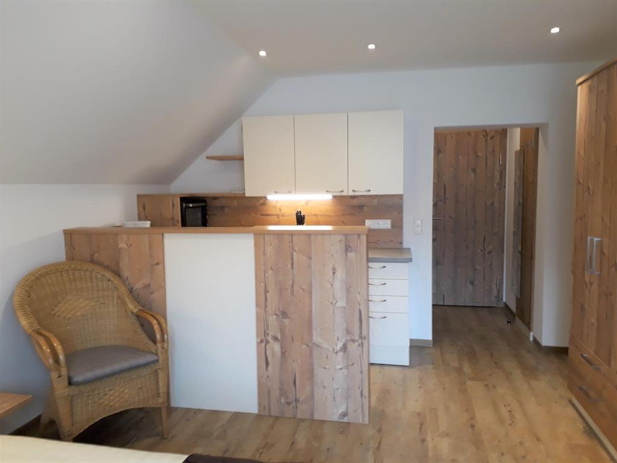 Eine voll ausgestattete Küche mit Geschirrspüler, Kühlschrank, Herd, Minibackofen, Kaffemaschine, Wasserkocher und einen gemütlichen Wohn-Schlafraum mit Flachbild Sat-TV, sowie ein Bad mit Dusche/WC und Fenster. W-LAN