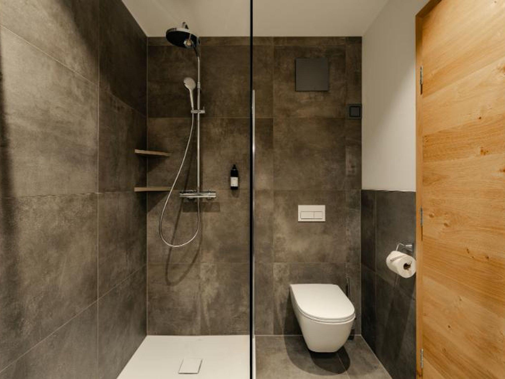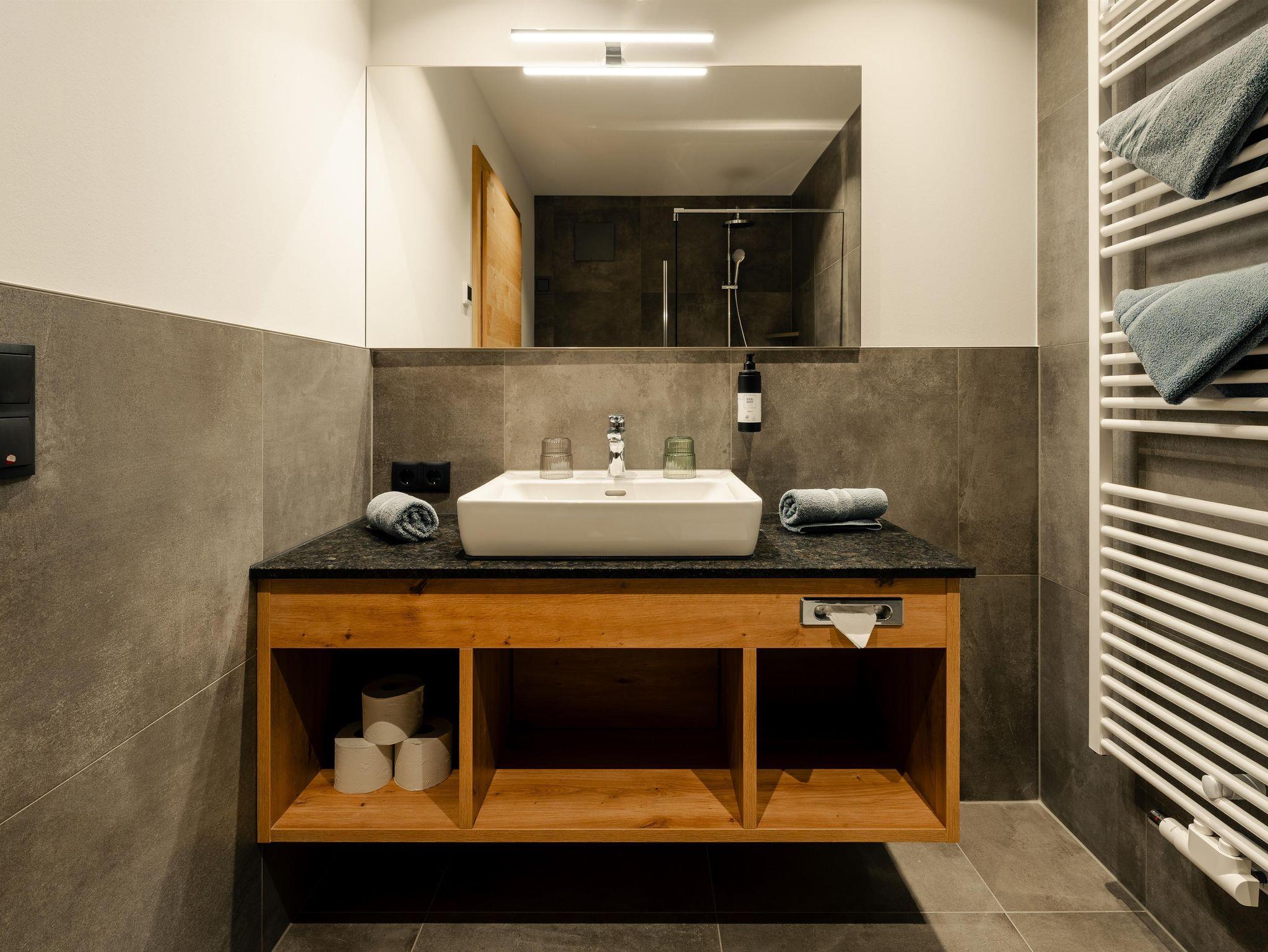Badezimmer mit ebenerdiger Dusche, WC, Seife und Duschgel, Föhn.