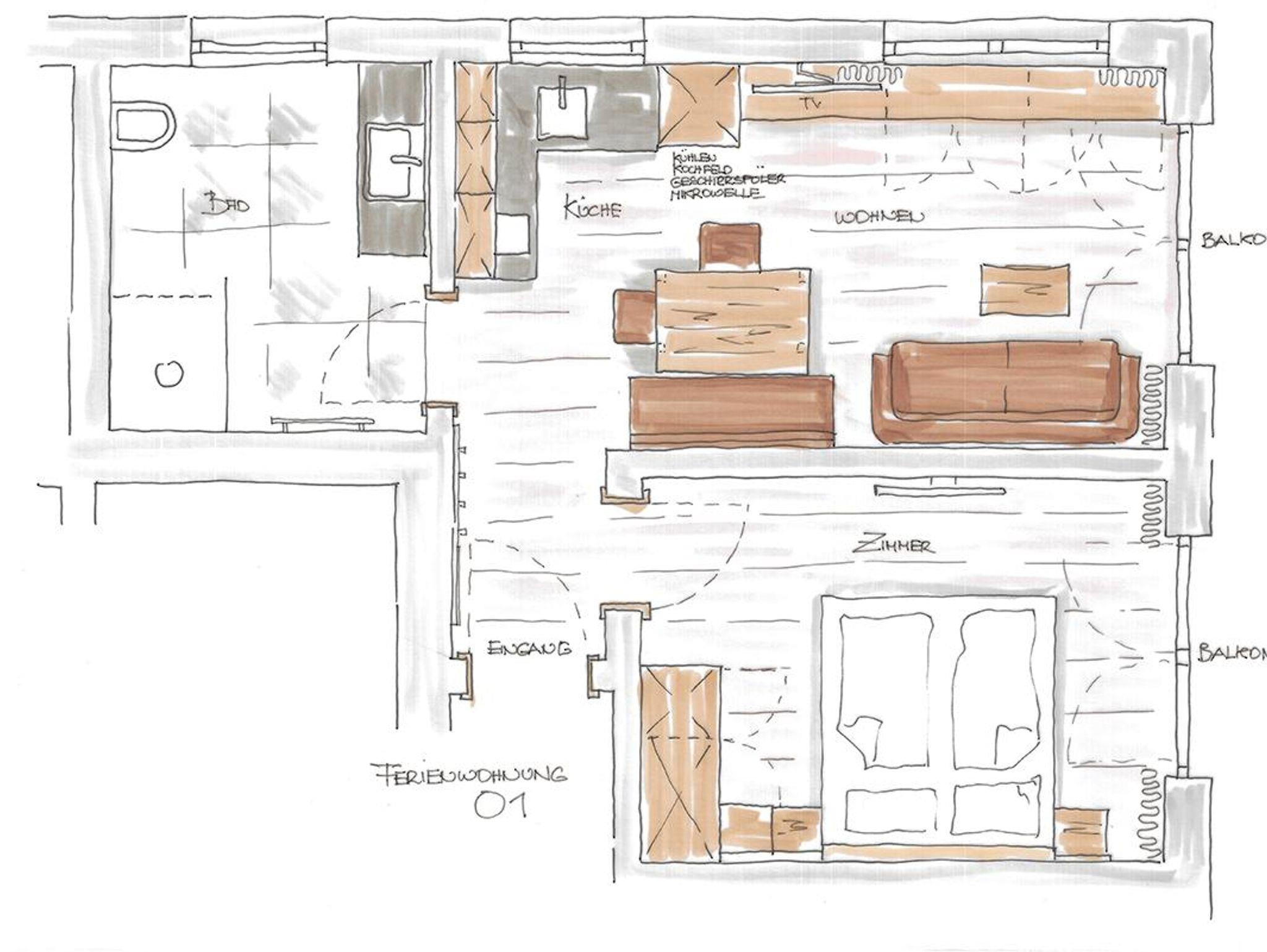 Ca. 36 m² für 1-3 Personen. Helles Wohnzimmer mit Couch, Smart-TV, Seeblick. Küche mit großen Kühlschrank, Mikrowelle, Induktionskochfeld (2 Platten), Geschirr, Besteck, Töpfe, etc. Badezimmer (6m²) mit ebenerdiger Dusche, Waschbecken, WC und Fenster. Schlafzimmer mit Doppelbett und Kleiderschrank. Überall Verdunkelungsvorhänge, Außenrollo, Insektenschutz.