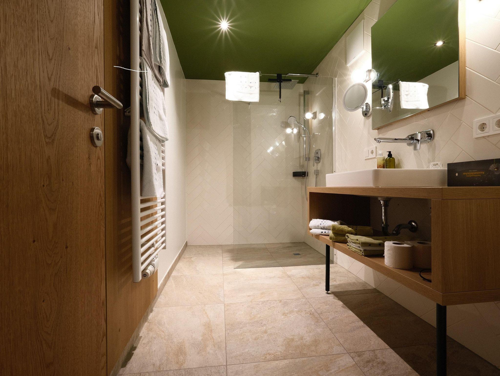 • Badezimmer mit Dusche, WC und Kosmetikspiegel