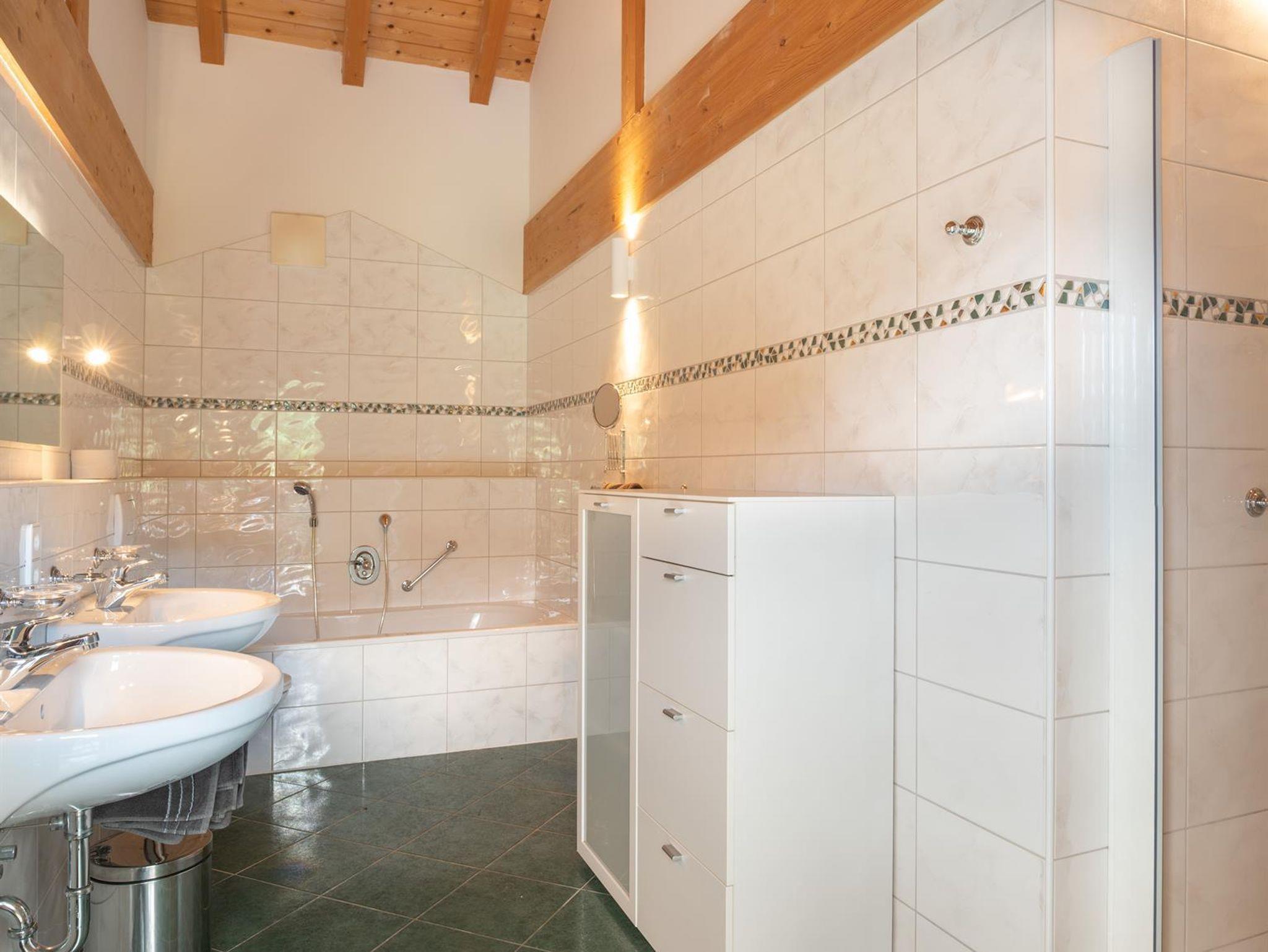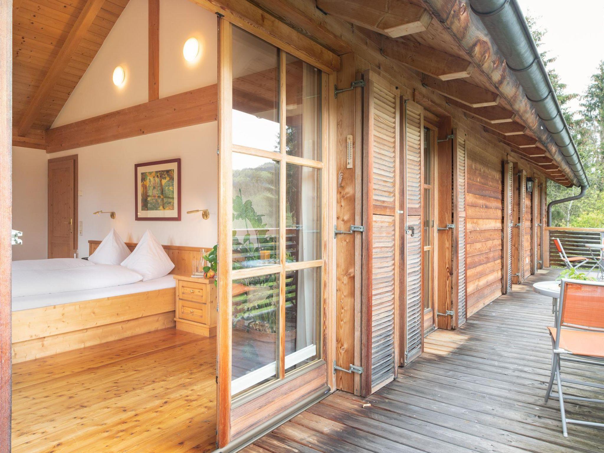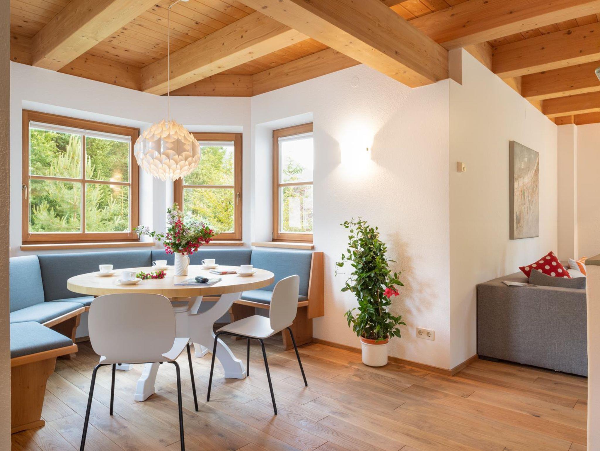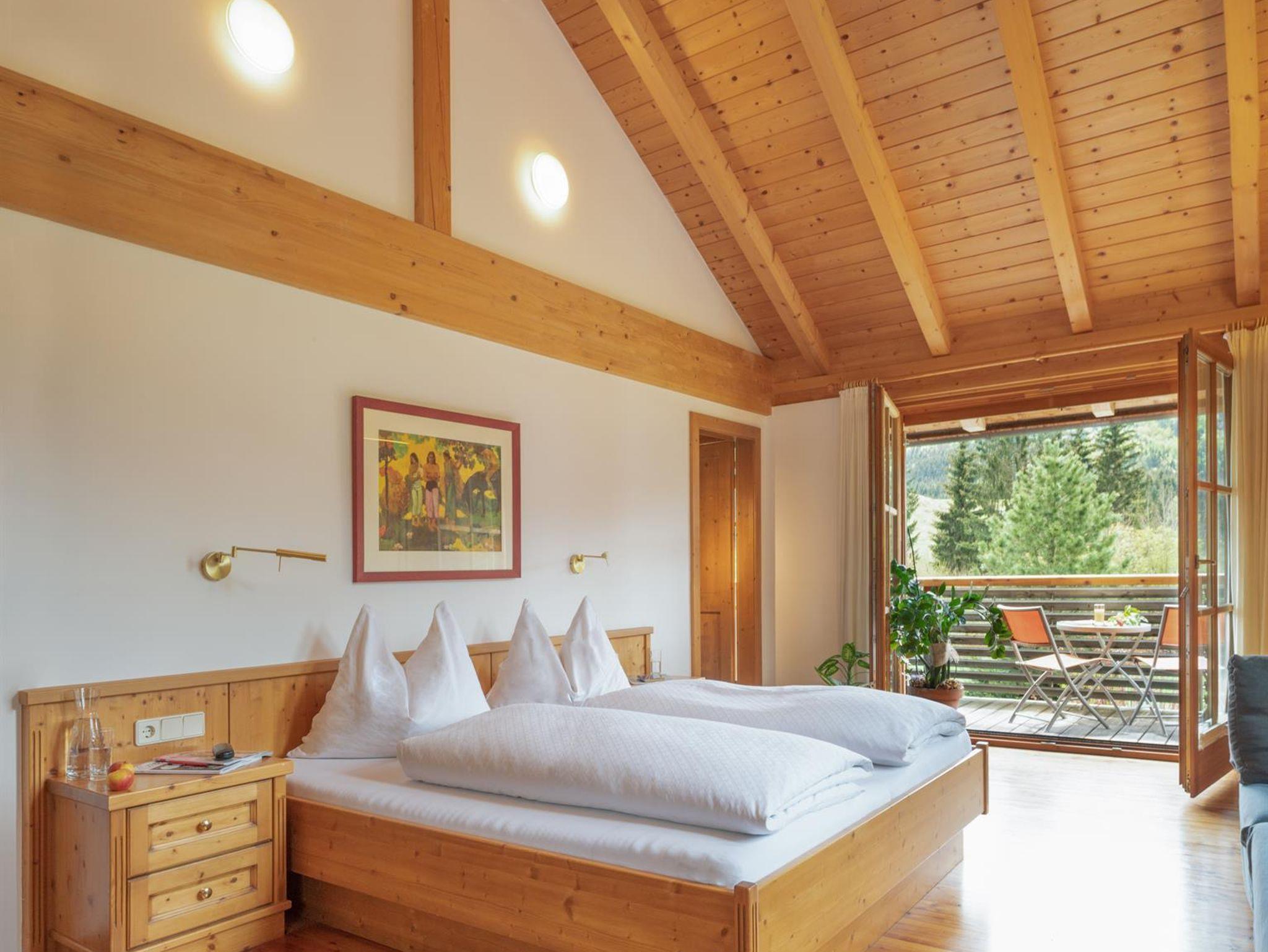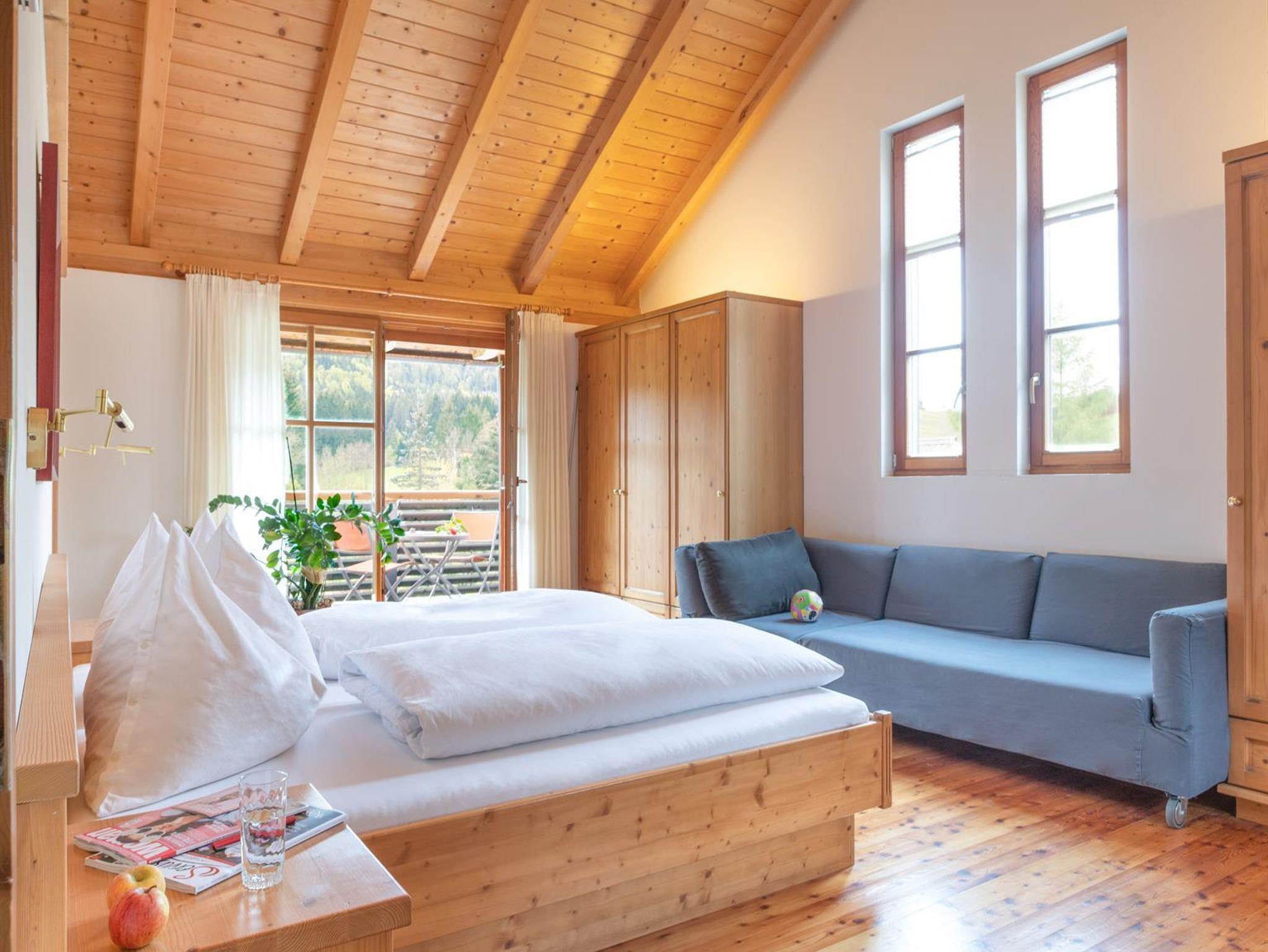 Das große, komplett offen gestaltete Erdgeschoß bietet eine gut ausgestattete Küche mit Küchenblock (G), einen großen Wohnraum mit zentralem Kamin (H), eine Panorama-Sitzecke (I) und einen weiteren Esstisch am Kamin. Eine gemütliche Sofalandschaft fehlt natürlich auch nicht. Für Seminare steht der 45?m2 große Gruppenraum mit wunderbarem Blick auf die umliegenden Wiesen und Wälder und getrenntem Eingang zur Verfügung (J).Es besteht aus einem großen Schlafzimmer mit Doppelbett, eigenem geräumigen Bad mit Wanne und Duschkabine (A & B), einem Schlafzimmer mit zwei Einzelbetten (C), einem Schlafzimmer mit Doppelbett (D) und einem gemeinsamen Bad (E). Alle Schlafzimmer haben direkten Zugang zum großen Balkon. Zweifellos das Highlight für Kids ist die „Zwergenstube“ - ein kleines Zimmer mit Dachschräge und zwei Kinderbetten (F).