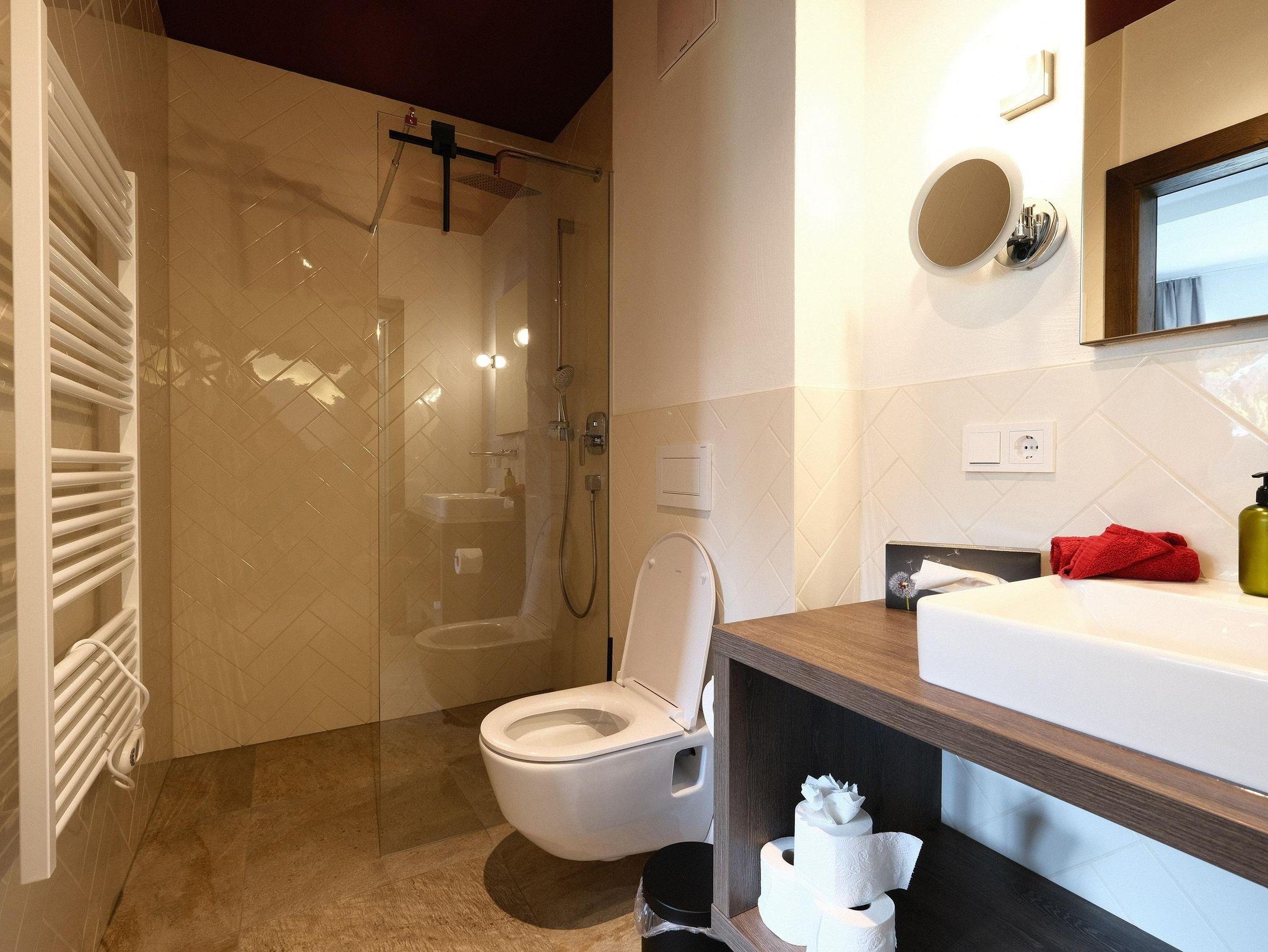 • Modernes Badezimmer mit Dusche, WC und Waschbecken mit Kosmetikspiegel