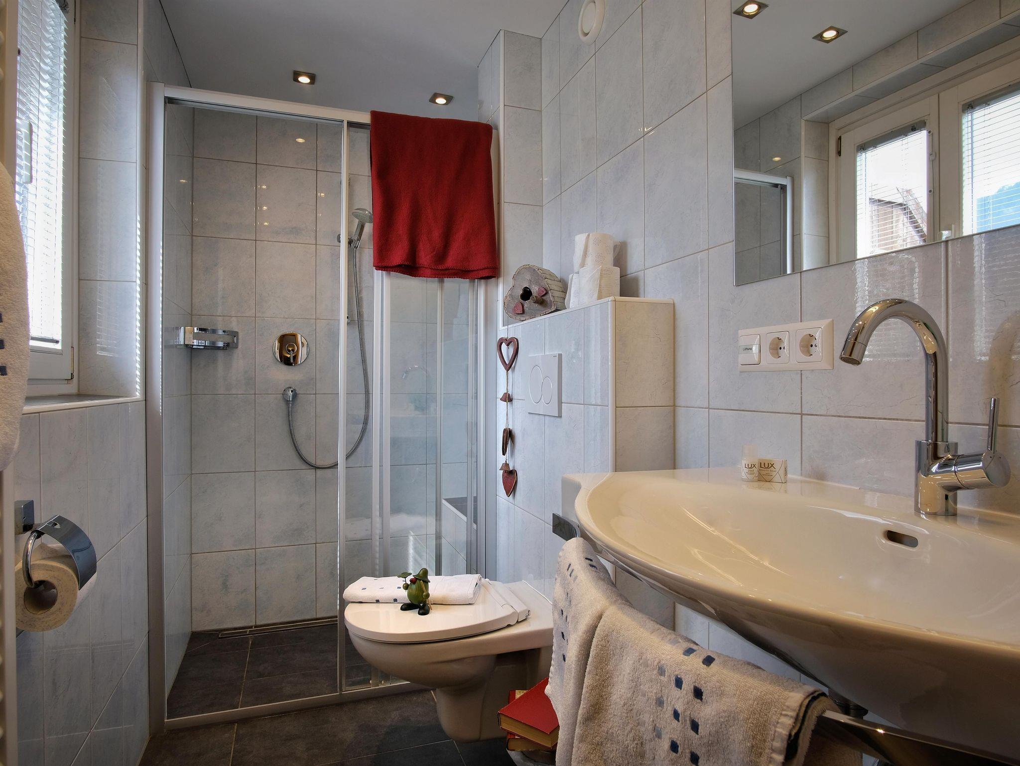 • Großes Badezimmer mit Dusche, beheizter Duschbank, WC, Föhn & Kosmetikspiegel
