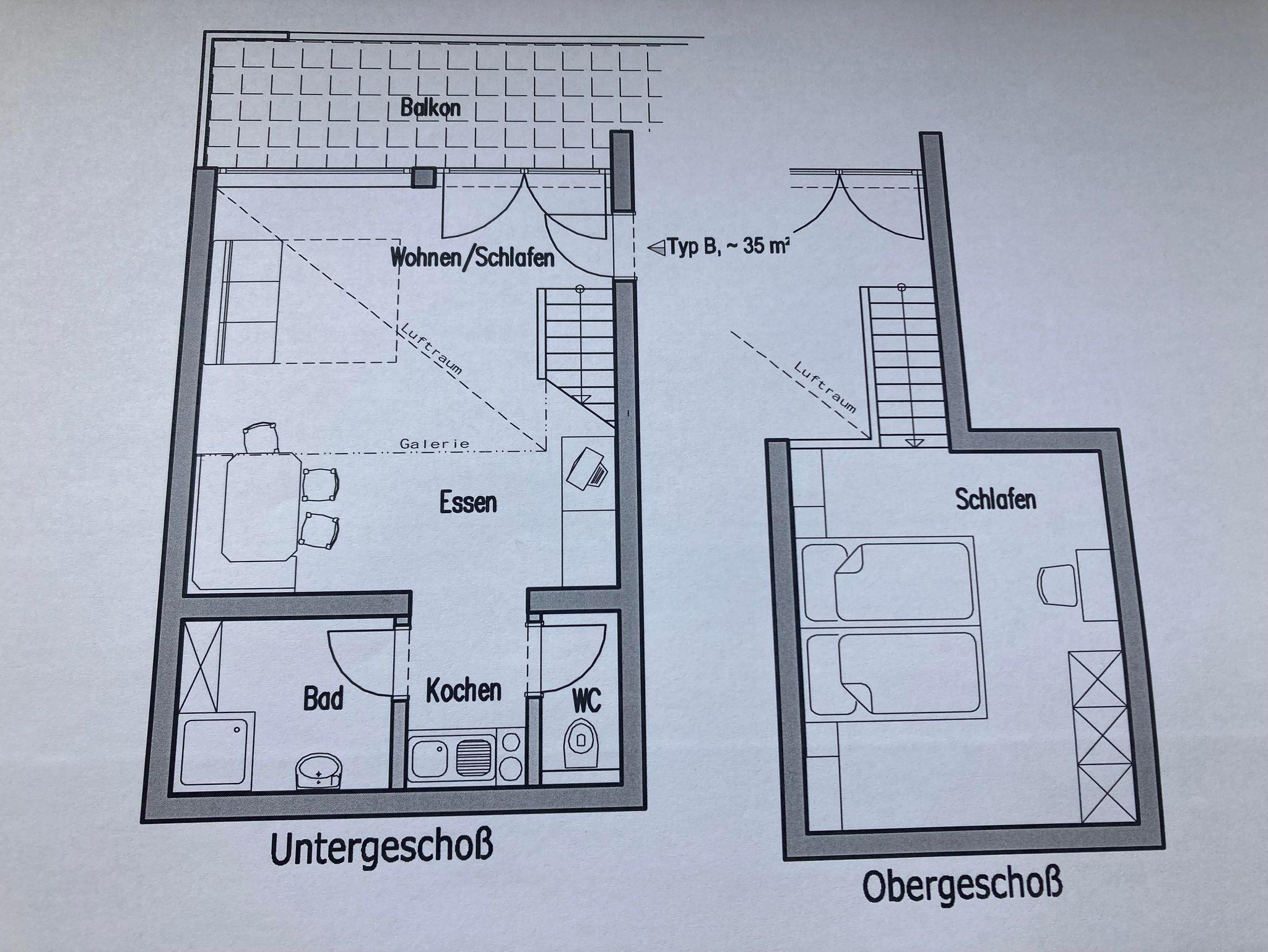 35 m² / Etagenwohnung - Galerieschlafzimmer mit Doppelbett, Wohnraum mit Schlafcouch, Eßecke, Kochnische, Dusche, sep. WC, Sat-TV, Safe, Balkon mit Waldblick
