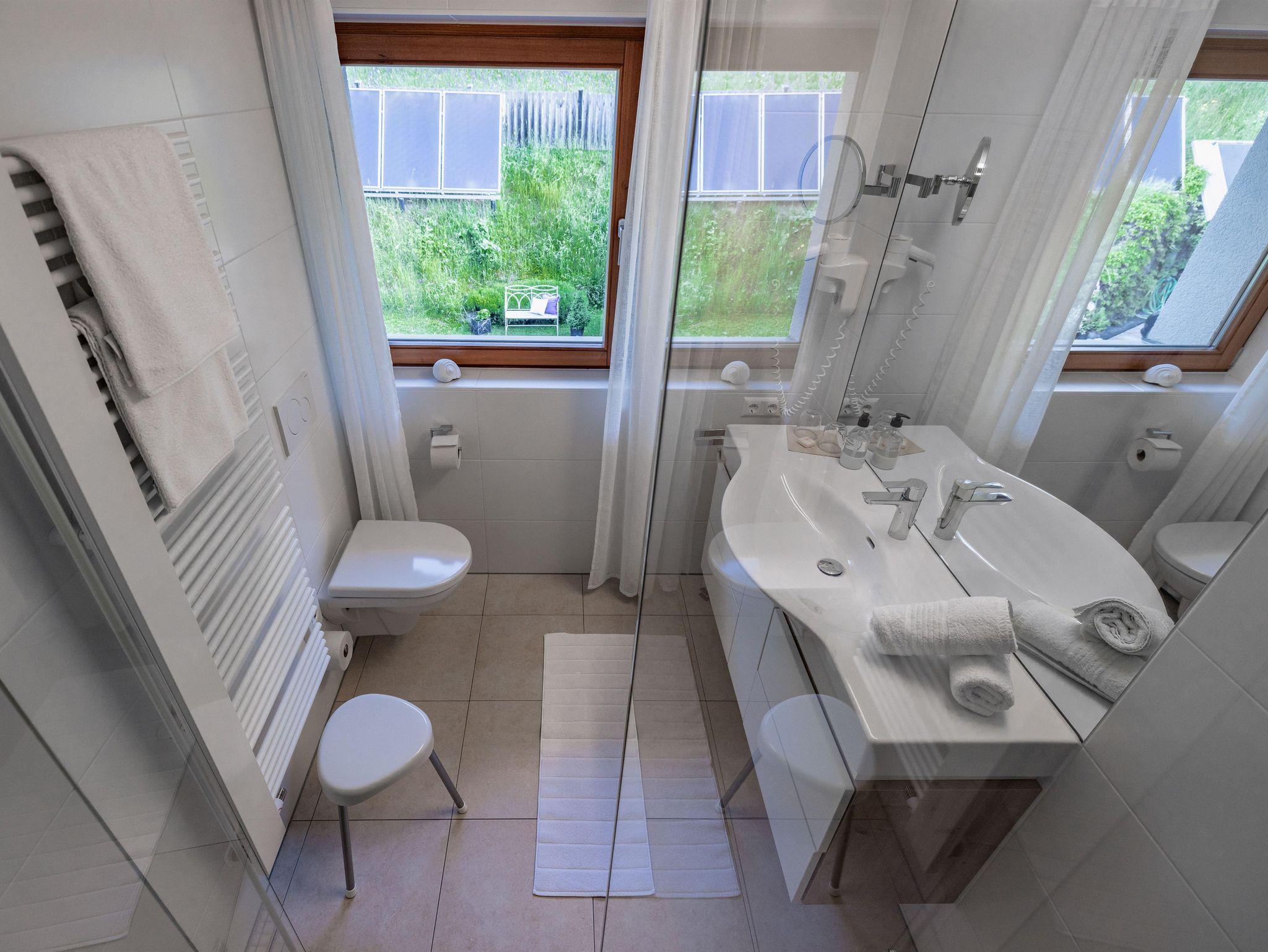 • ein nordseitig gelegenes Badezimmer mit Dusche, WC, Waschbecken und großem Fenster mit Blick zum Wald.