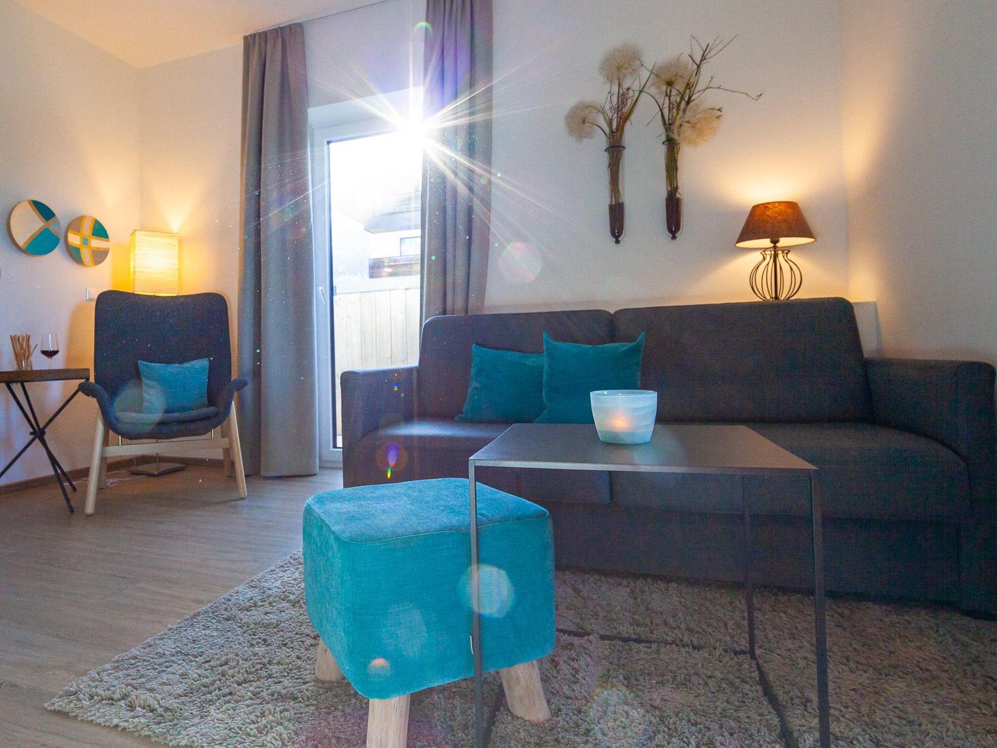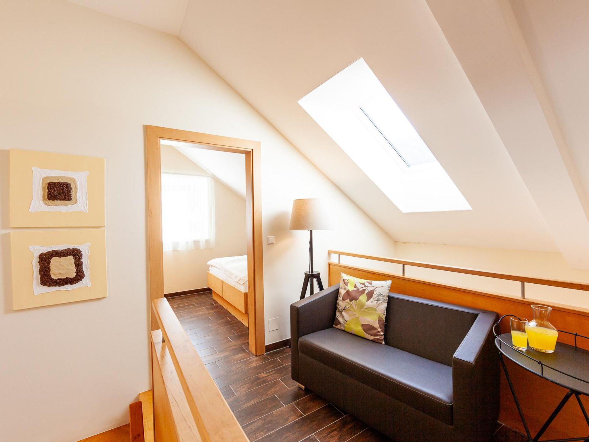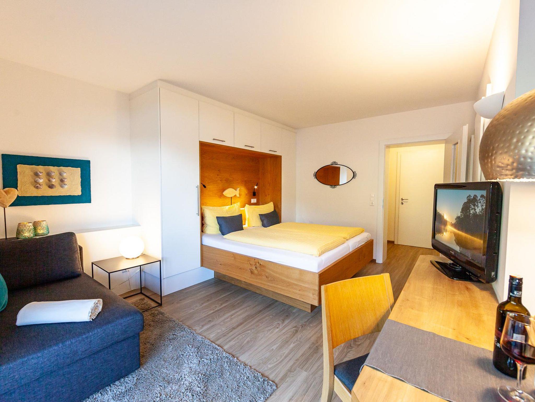 Diese Wohnungen verfügen über ein Wohn- und ein Schlafzimmer. Neben dem gemütlichen Doppelbett im Schlafzimmer bietet eine bequeme Schlafcouch im Wohnraum Platz für zusätzliche Gäste. Der Essplatz ist etwas erhöht und schafft so eine angenehme, offene Atmosphäre.