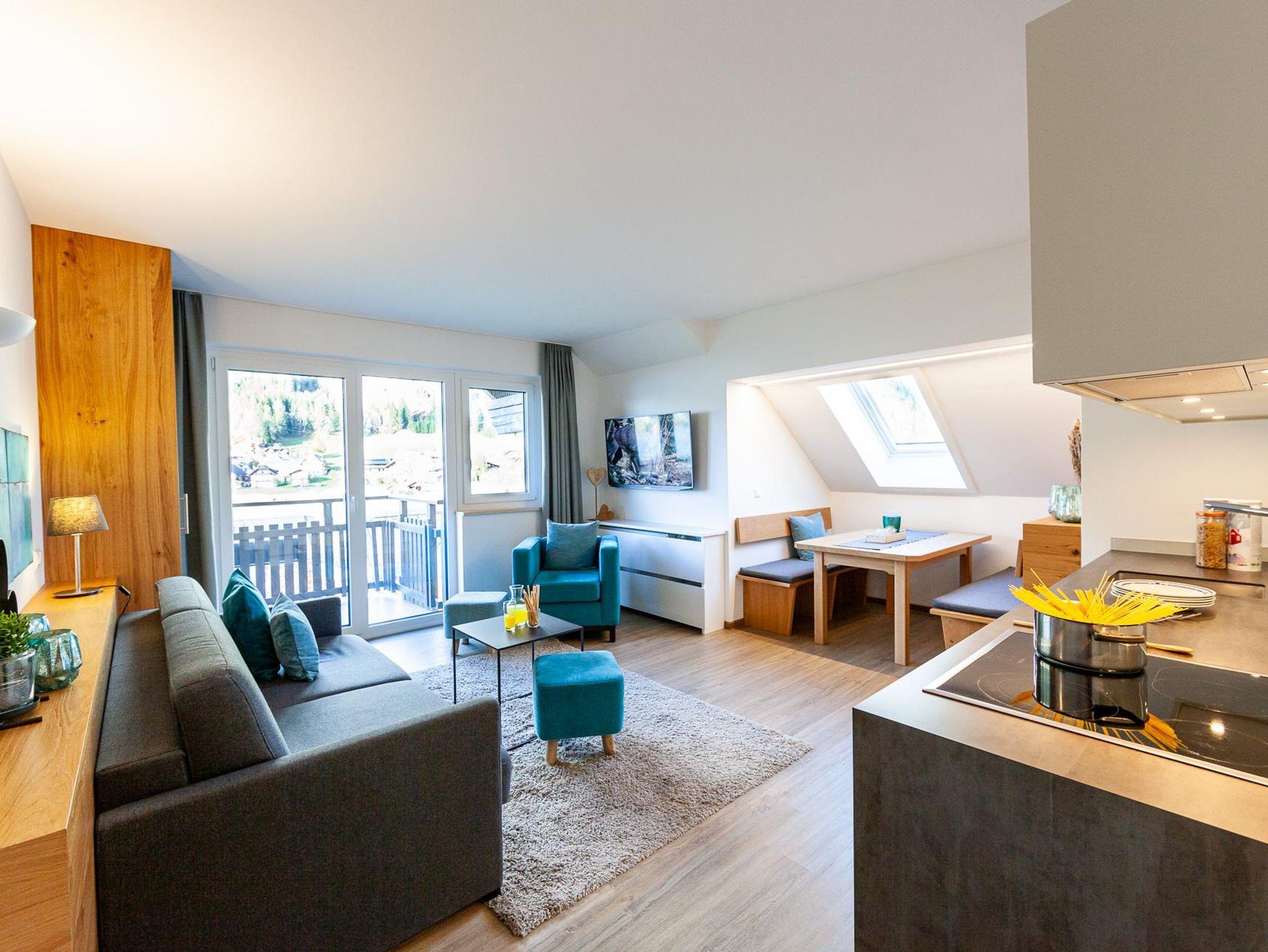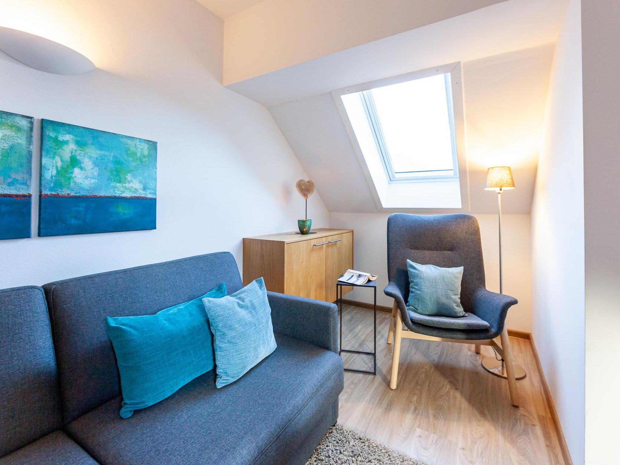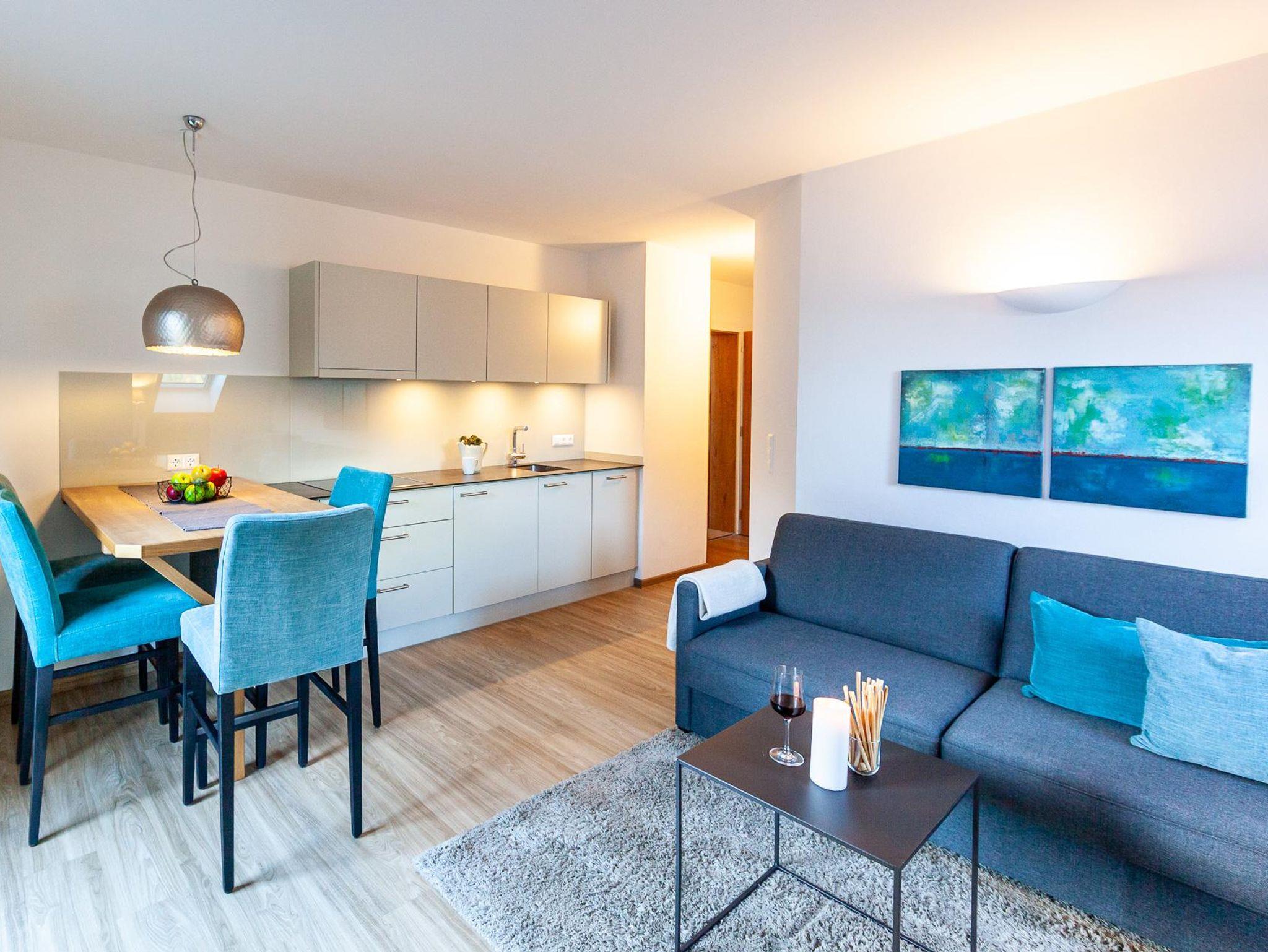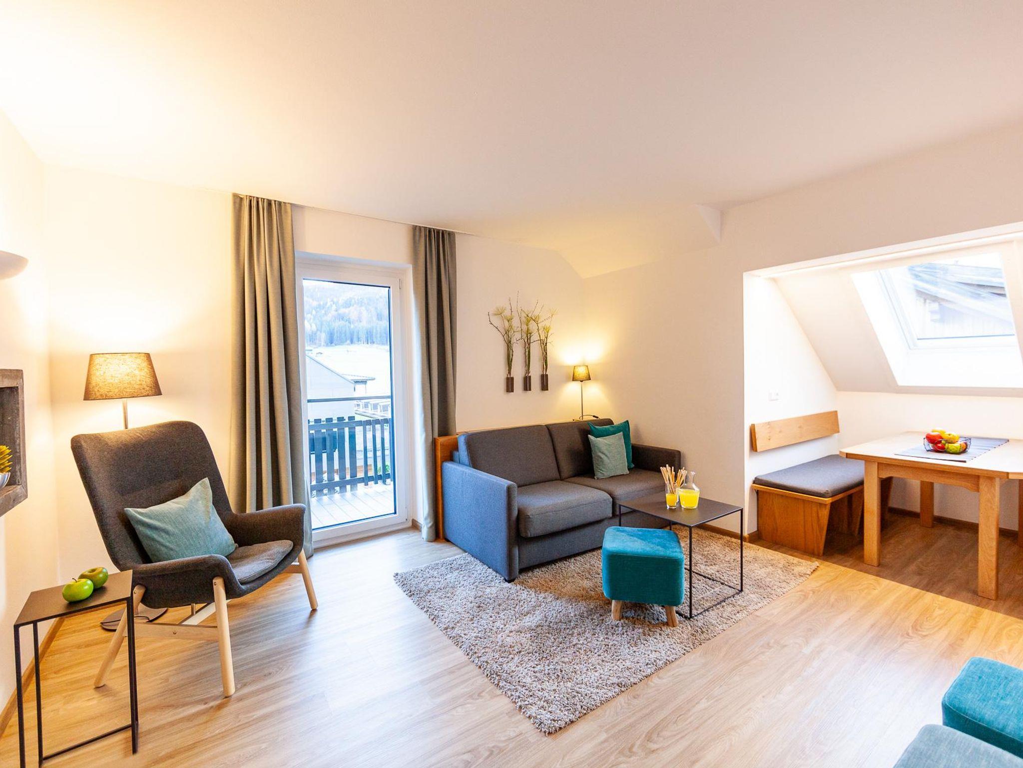 Diese Wohnungen verfügen über ein Wohn- und ein Schlafzimmer. Neben dem gemütlichen Doppelbett im Schlafzimmer bietet eine bequeme Schlafcouch im Wohnraum Platz für zusätzliche Gäste. Der Essplatz ist etwas erhöht und schafft so eine angenehme, offene Atmosphäre.