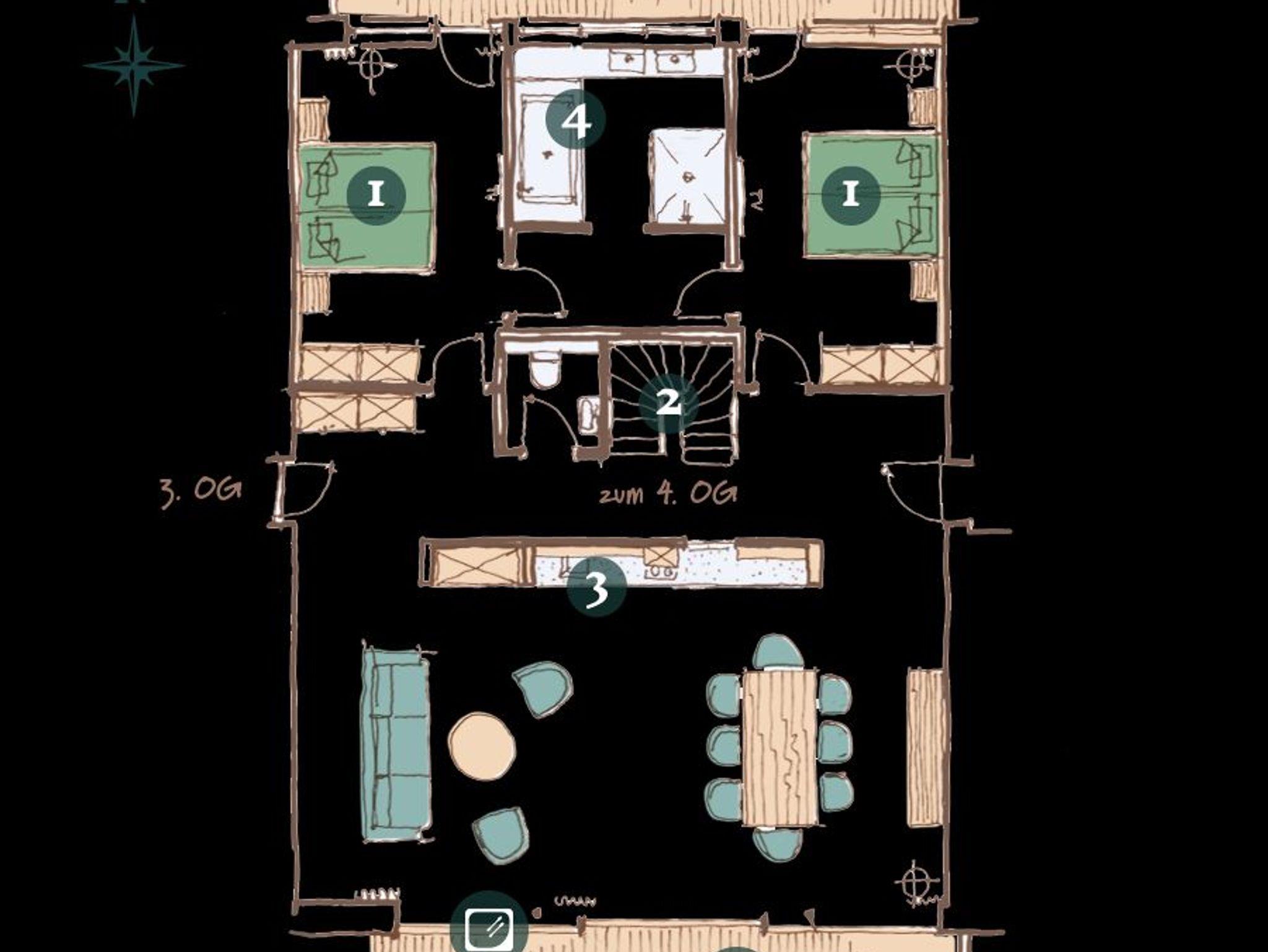 Grundgeschoss 130m2 / Spitzbogennest 31m2 / Südbalkon 16 m2 / Waldterrasse 14 m2