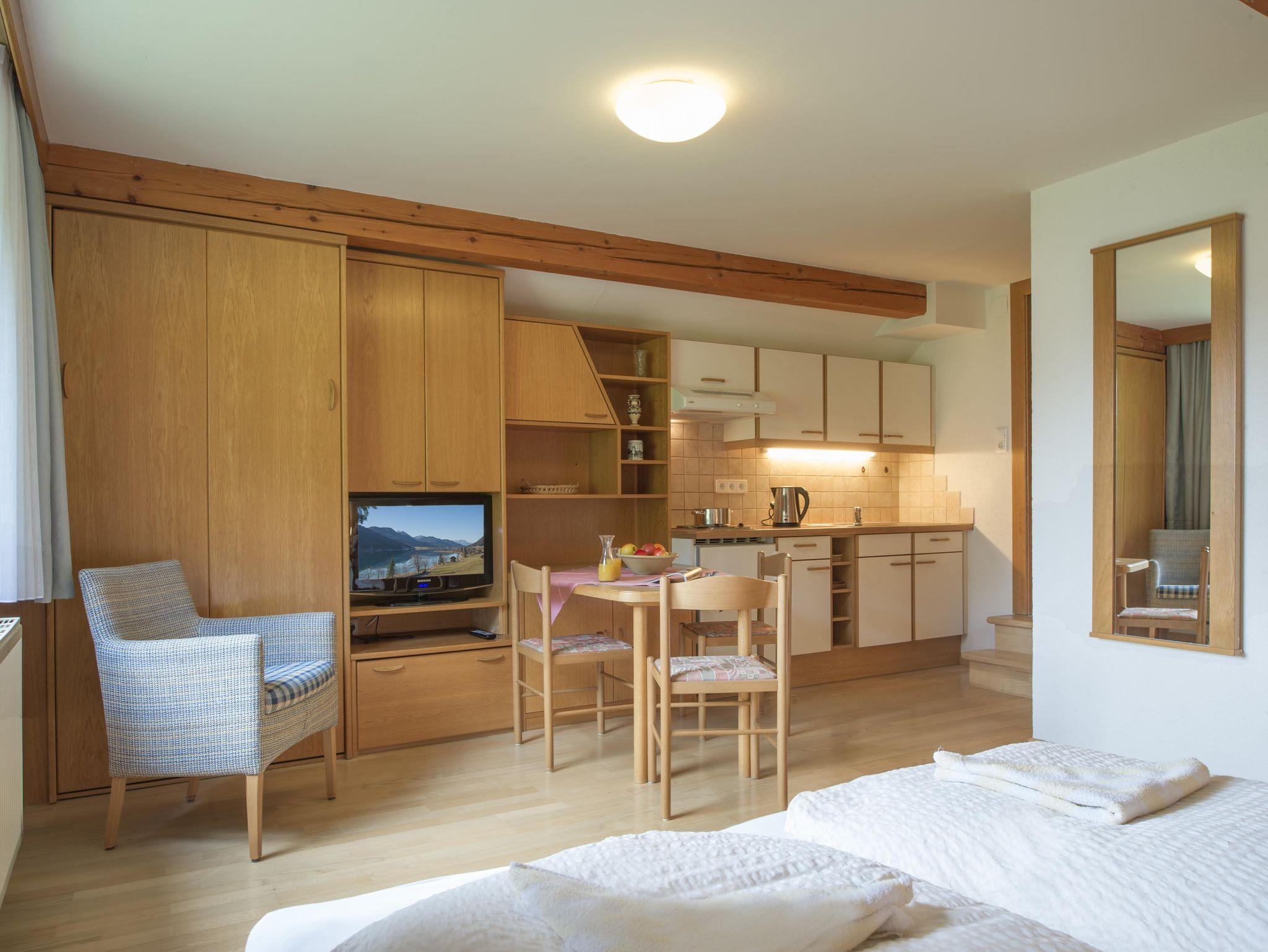 Gemütliche Einraum-Wohnung mit Doppelschlafcouch im Wohnraum (Schrankbett f. die 3. Person), Kochnische