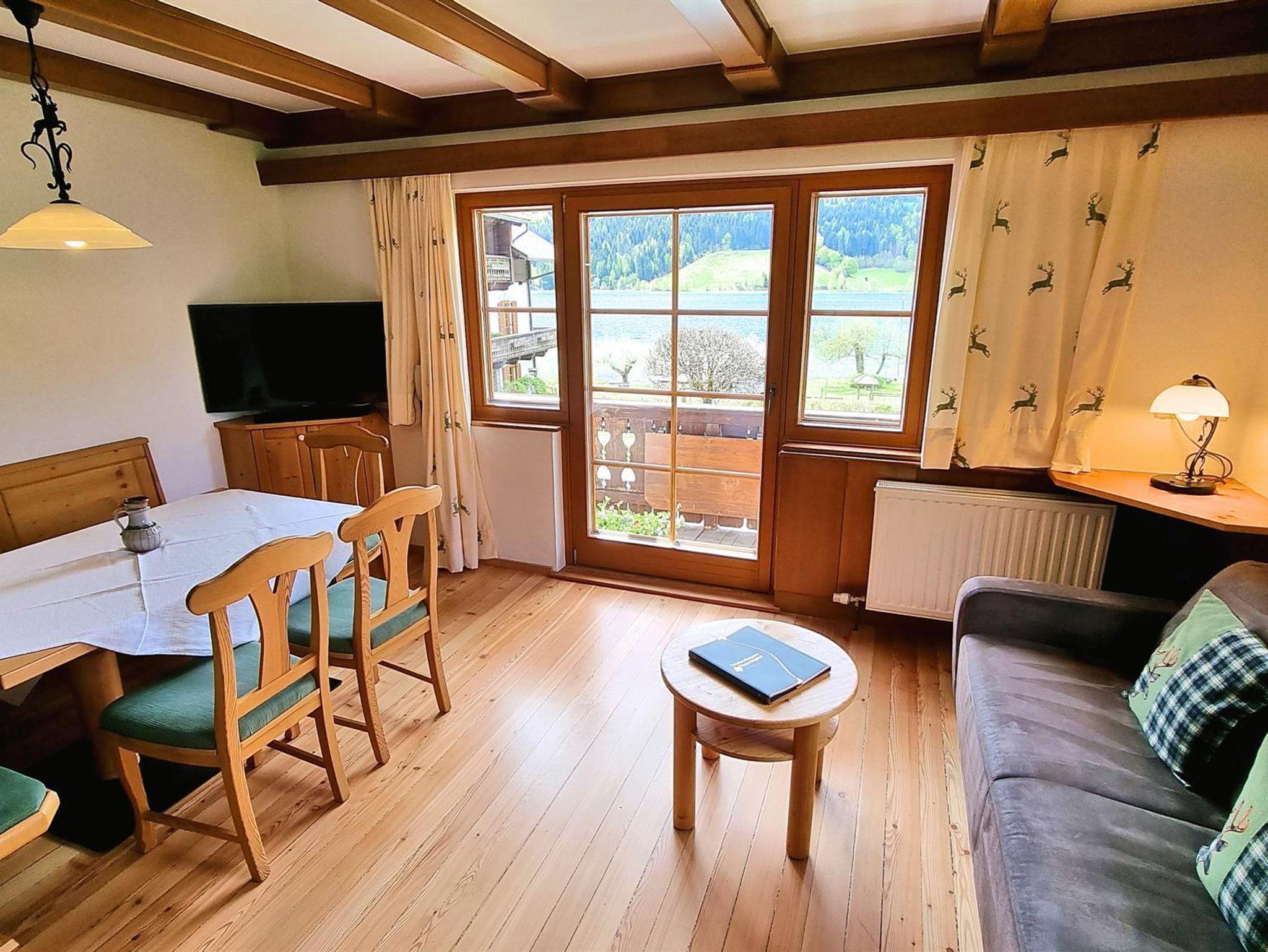 Erdgeschoß: Wohnzimmer mit Balkon zum See, Couch, Smart-TV, Safe, Kachelofen, Esstisch, herrlicher Blick auf den See.