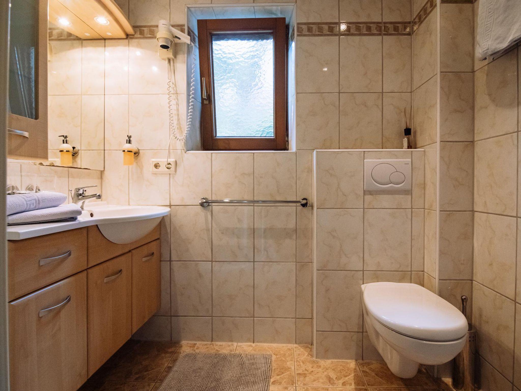 Badezimmer mit Dusche und WC, Fön, Handtücher