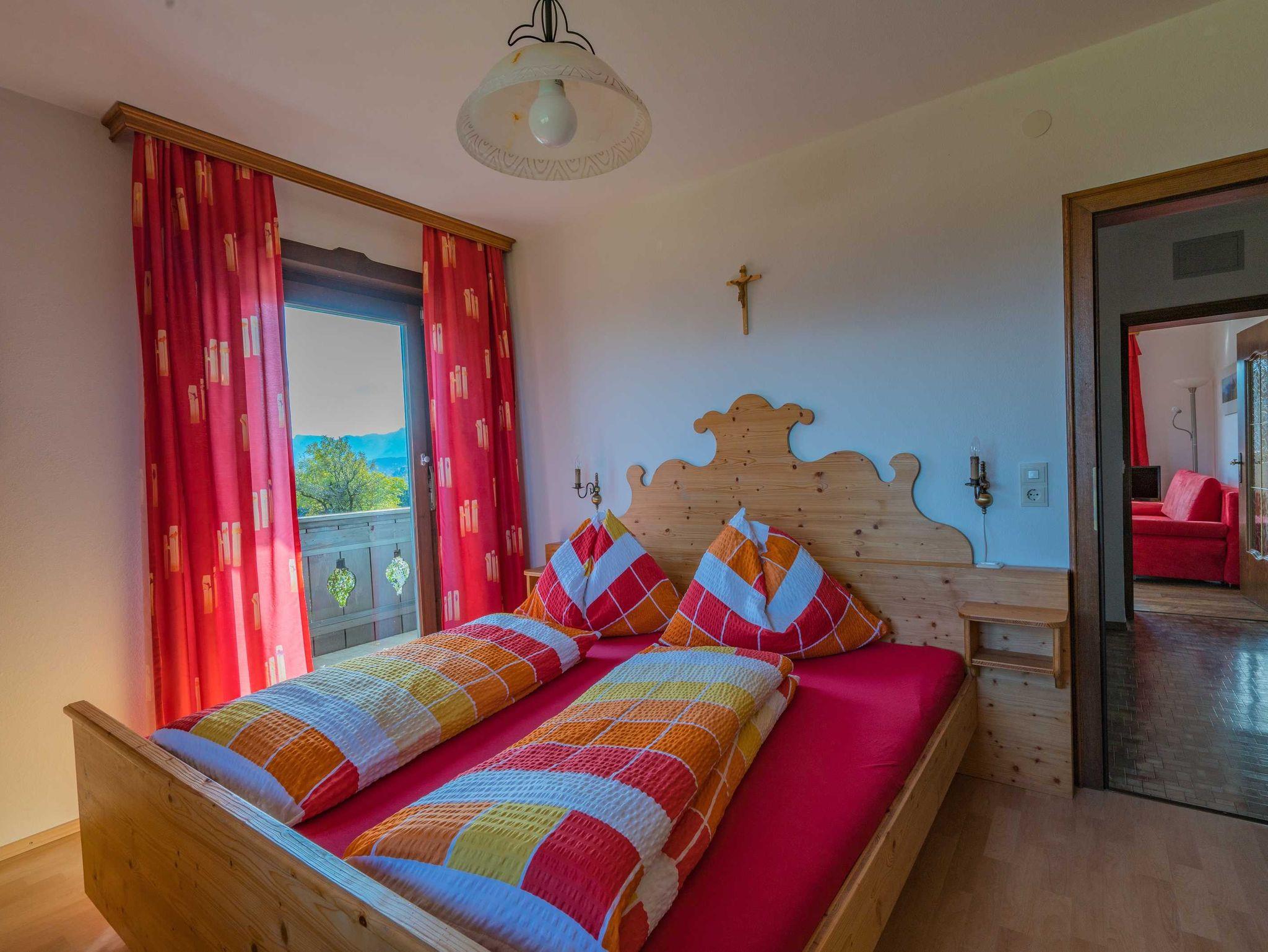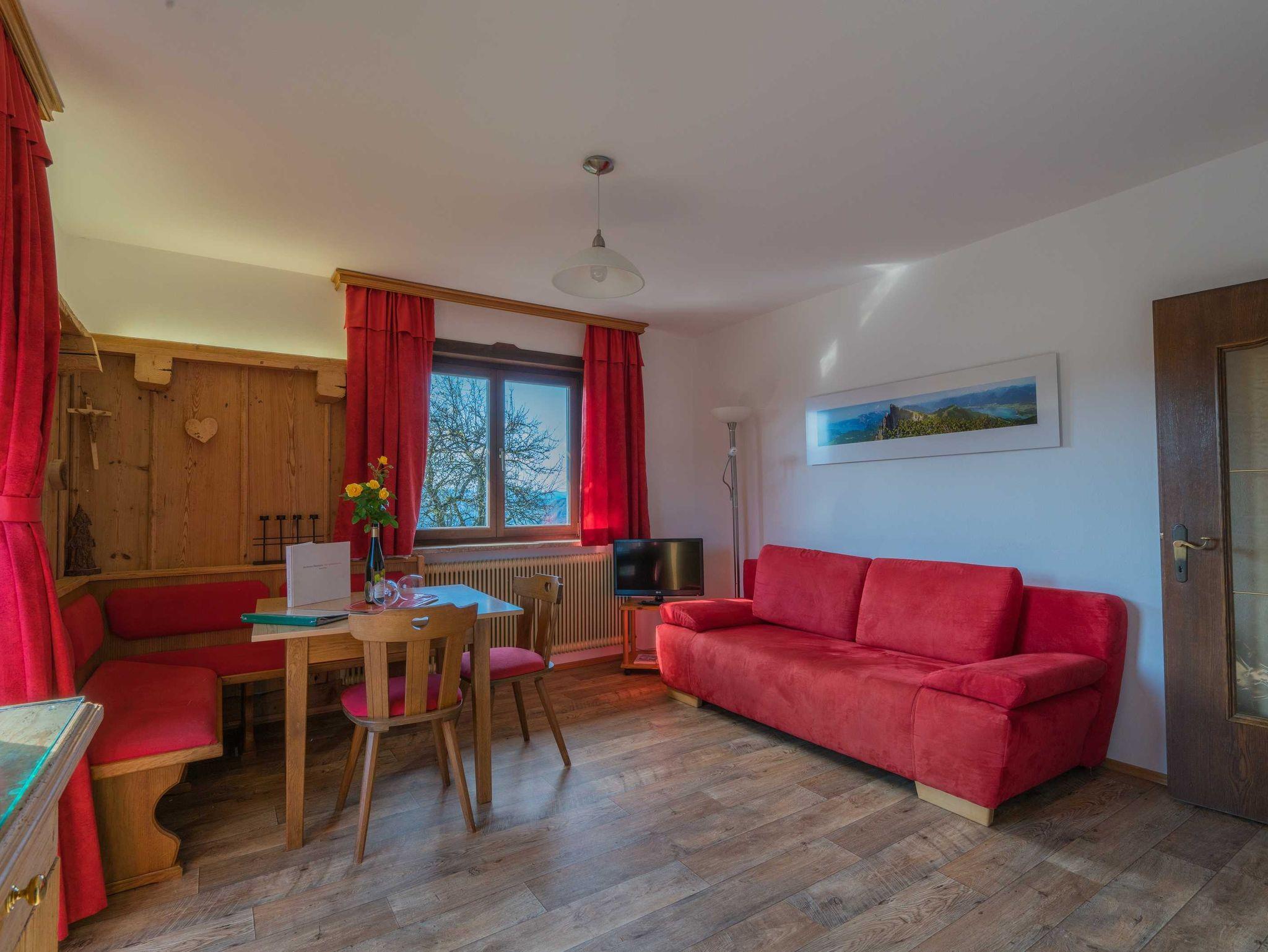 Die Ferienwohnung Sonnenaufgang bietet ebenso wie die anderen beiden Ferienwohnungen Platz für 2-4 Personen. Neben einem Schlafzimmer mit Massivholz-Doppelbett findet man eine gemütliche Ausziehcouch mit Topper.