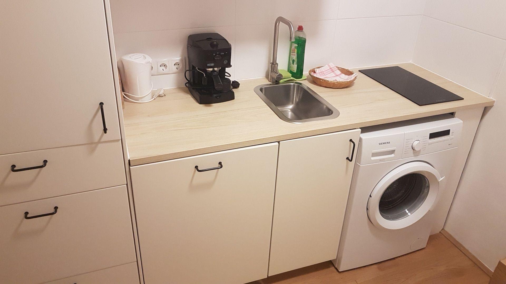 Im unteren Bereich finden Sie den Wohnbereich mit Sofa und Esstisch. Dahinter finden Sie eine voll ausgestattete Küche (sogar mit Geschirrspüler, Waschmaschine, Mikrowelle, Kaffeemaschine usw.)