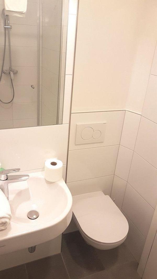 Das Badzimmer bietet eine bodentiefe Dusche und WC.