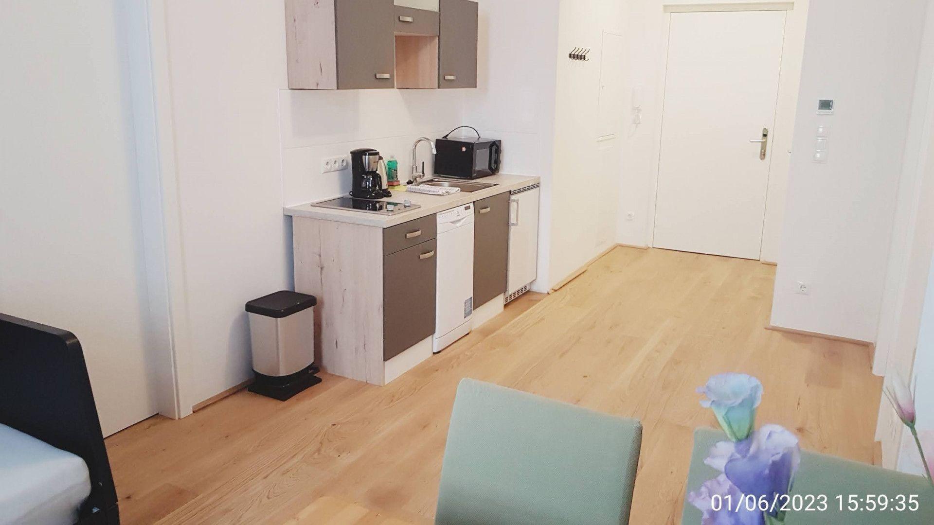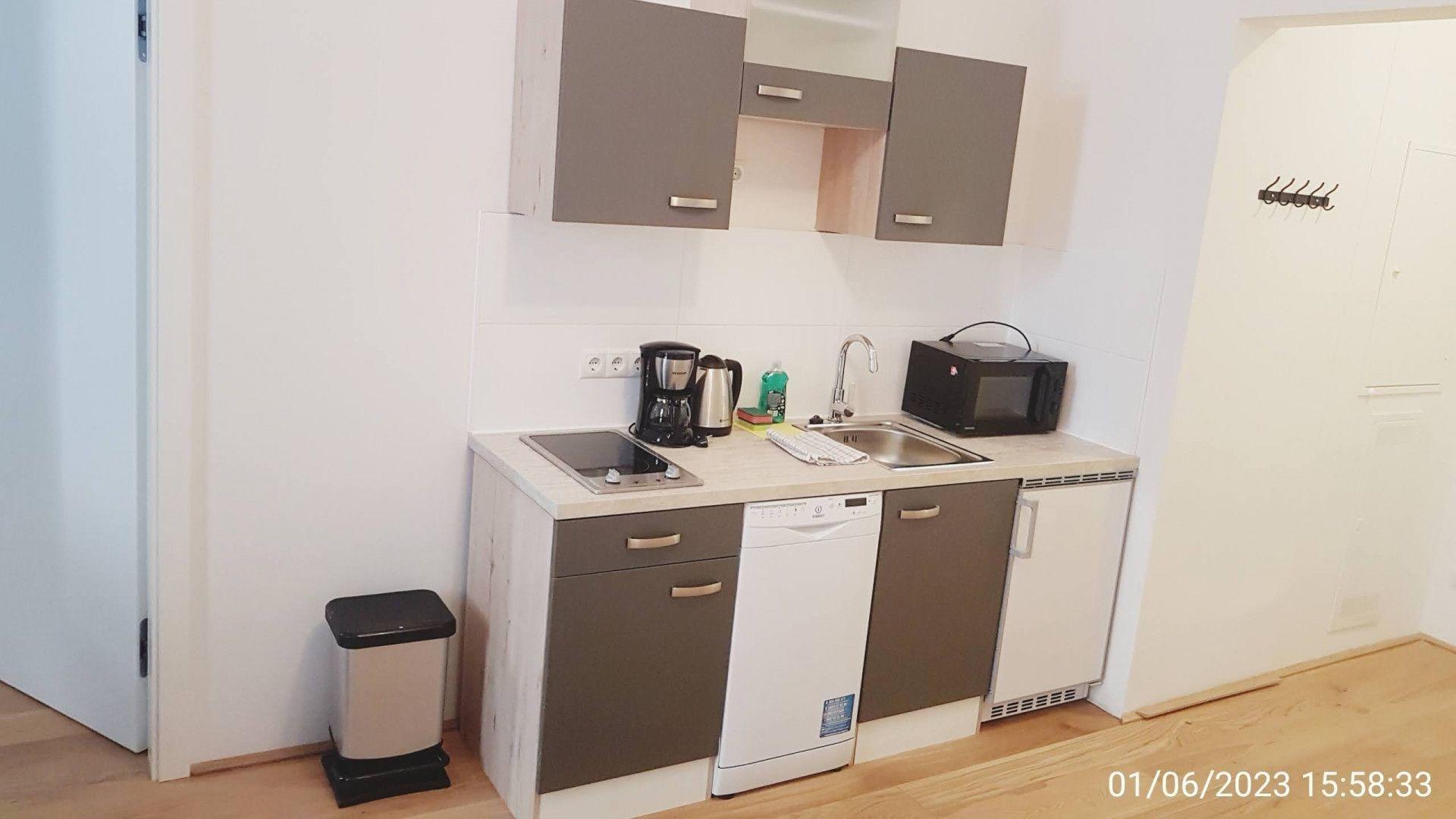 Die Küchenzeile ist voll ausgestattet inkl. Kaffeemaschine, Geschirrspüler, Mikrowelle und Kühlschrank. Sogar eine Waschmaschine steht im Apartment für Sie bereit (Badezimmer).