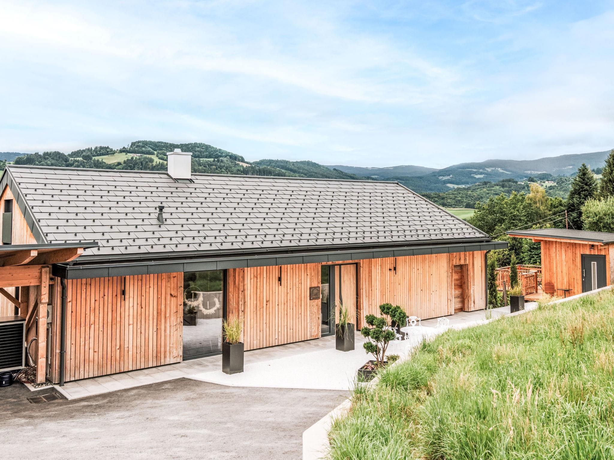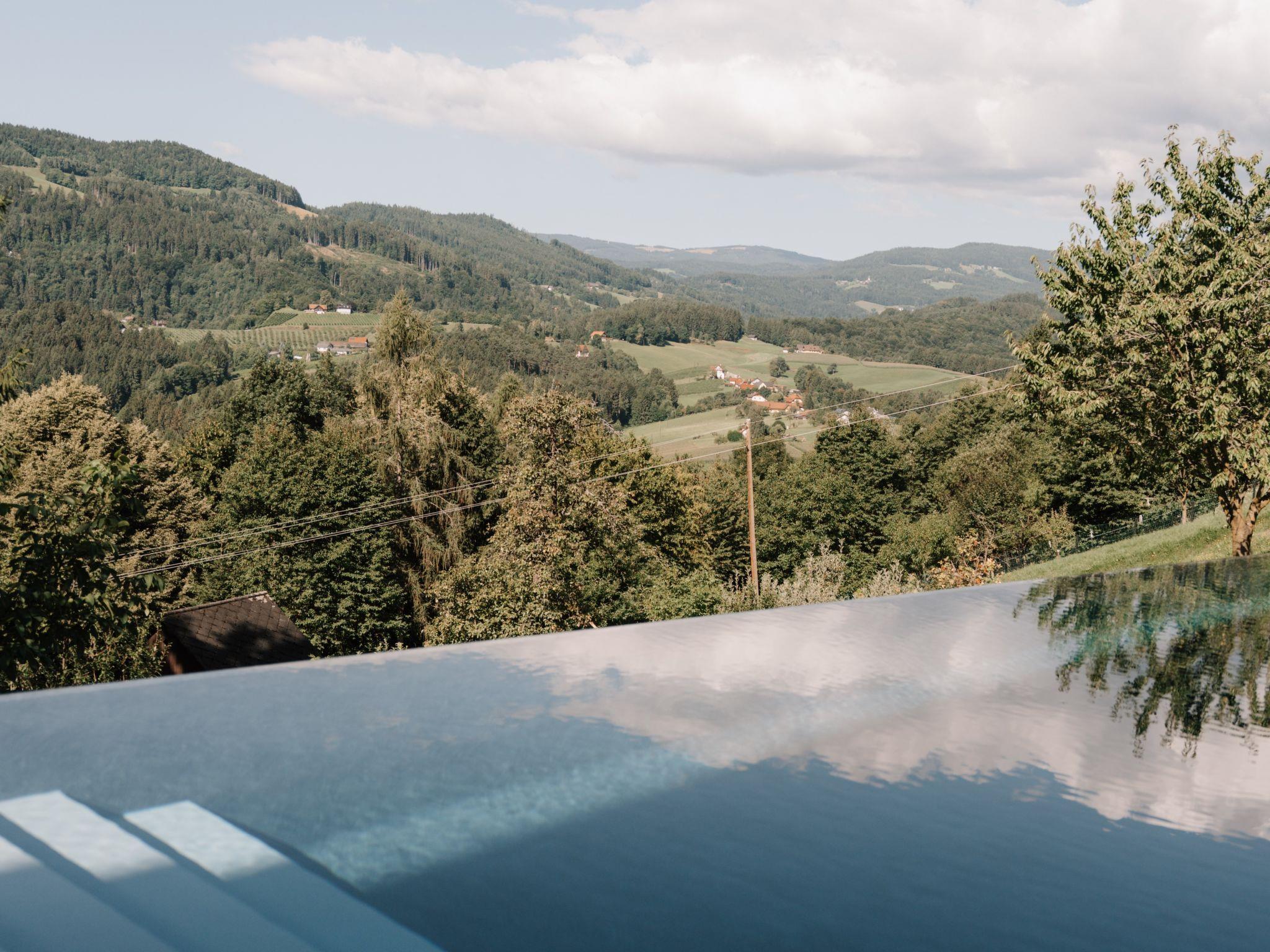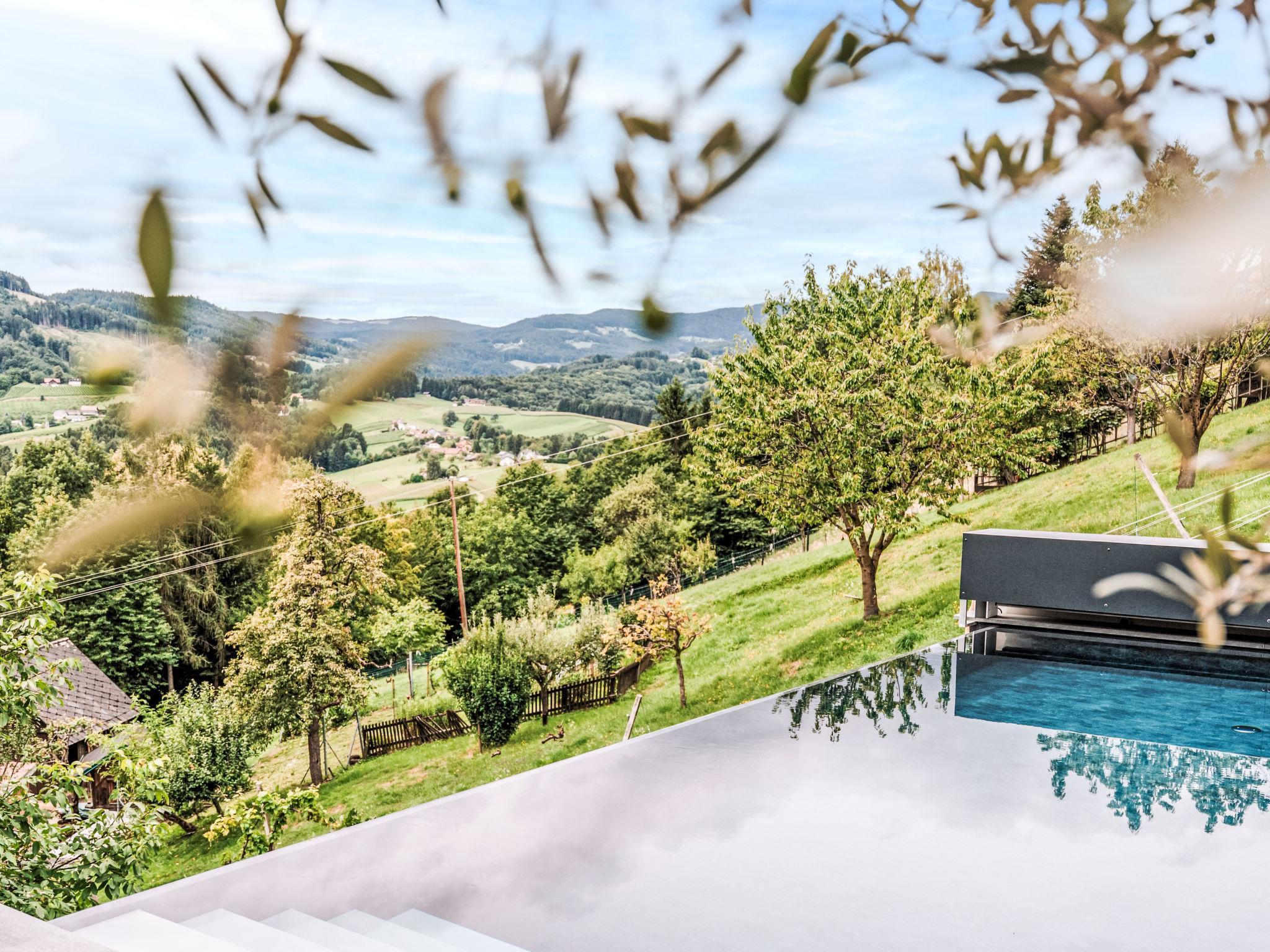 Süd-Weststeiermark 20 km from Deutschlandsberg: Modern cottage "Haus am Kogl", 2 storeys, surrounded by fields and vineyards. In the district of Oberer Kogl 5 km from the centre of Wies, in a quiet, sunny position. Private: property 1'000 m2, beautiful garden to relax, swimming pool (8 x 4 m, 32 m2, seasonal availability: 01.May. - 31.Oct.) with shutter cover. WC in the pool area, outdoor shower, pool house with fridge and cooking stove, patio, garden furniture, barbecue. In the house: WiFi, sauna, storage room for bicycles, central heating system, washing machine, tumble dryer. Cook (extra). Bread roll service and beverage service possible (extra). Storeroom available. Parking (for 5 cars). Carport. E-charging station. Grocery 1.6 km, supermarket 5 km, restaurant 300 m, bus stop "Wernersdorf Ort" 1.5 km, railway station "Wies-Eibiswald" 5 km. Nearby attractions: Wasserfall der weißen Sulm 12 km. Hiking paths: Wasserfall Hadernigg 11 km. Object suitable for 10 adults + 3 children. The owner does not accept any youth groups. 24hr guard. Wellness: Panorama sauna: 15 m² (in the garden, including shower and toilet in the sauna house) and infinity pool (8 x 4 m) with breathtaking views of the vineyards and massage function.