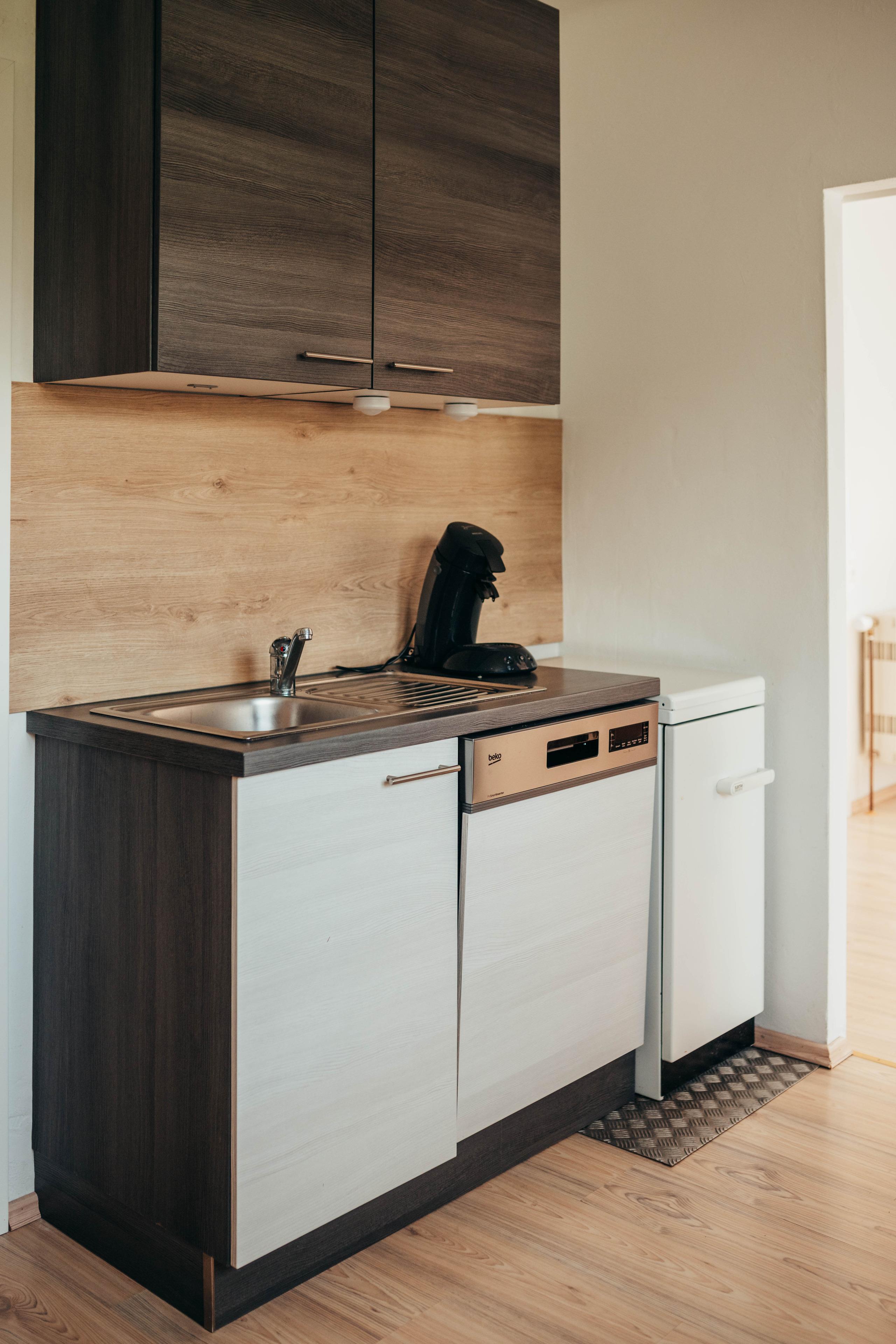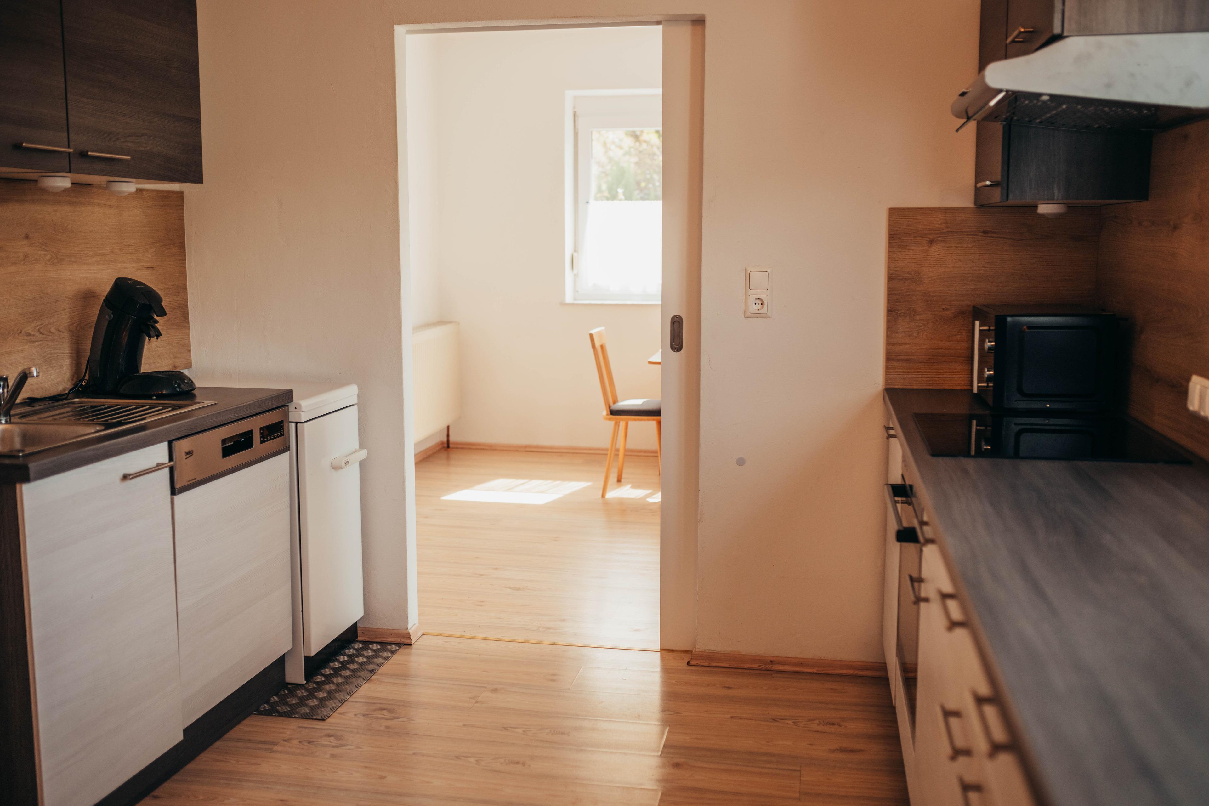 Voll ausgestattete Küche (Geschirrspüler, Herd, Backofen, Kühlschrank mit Gefrierfach)