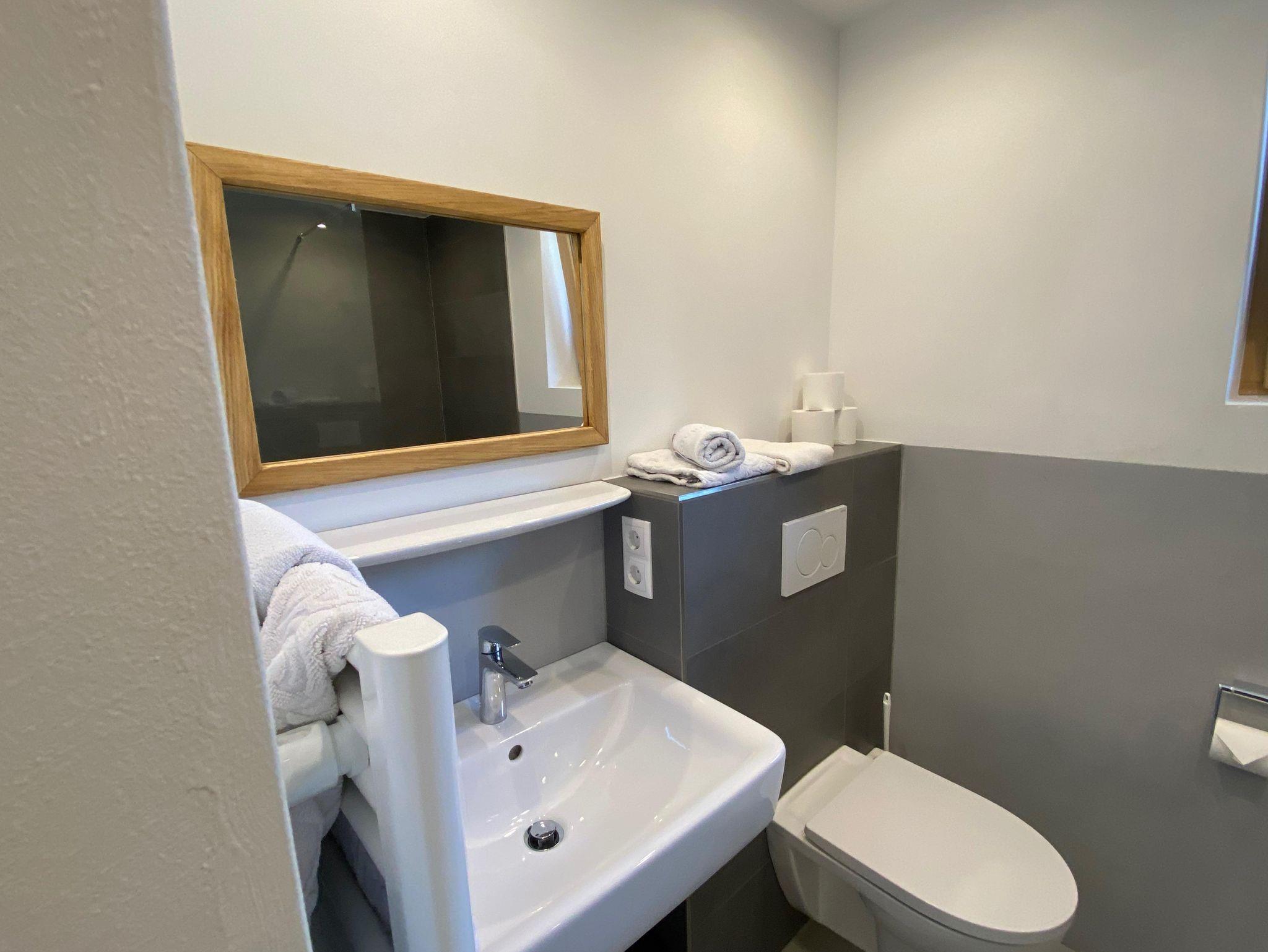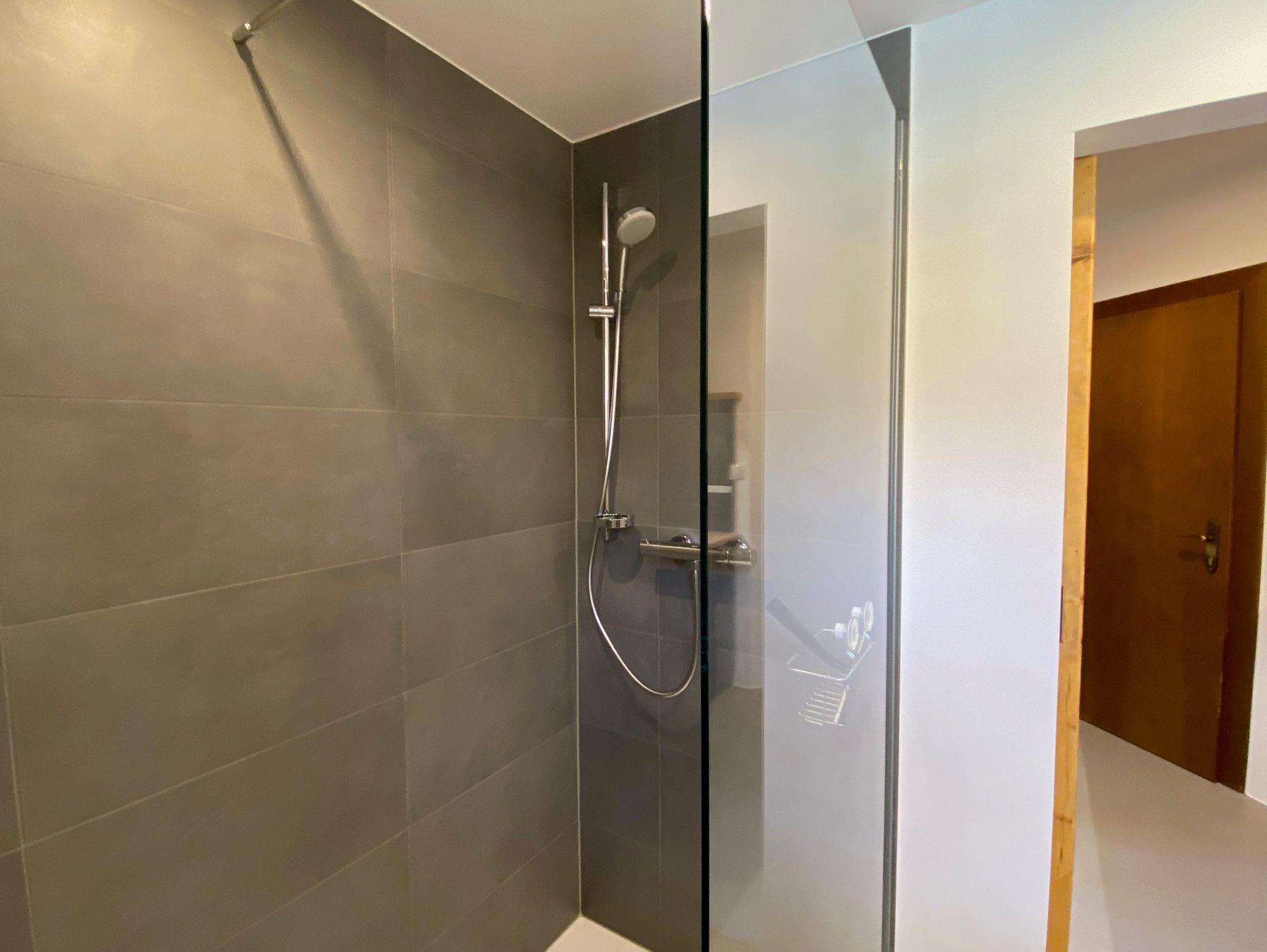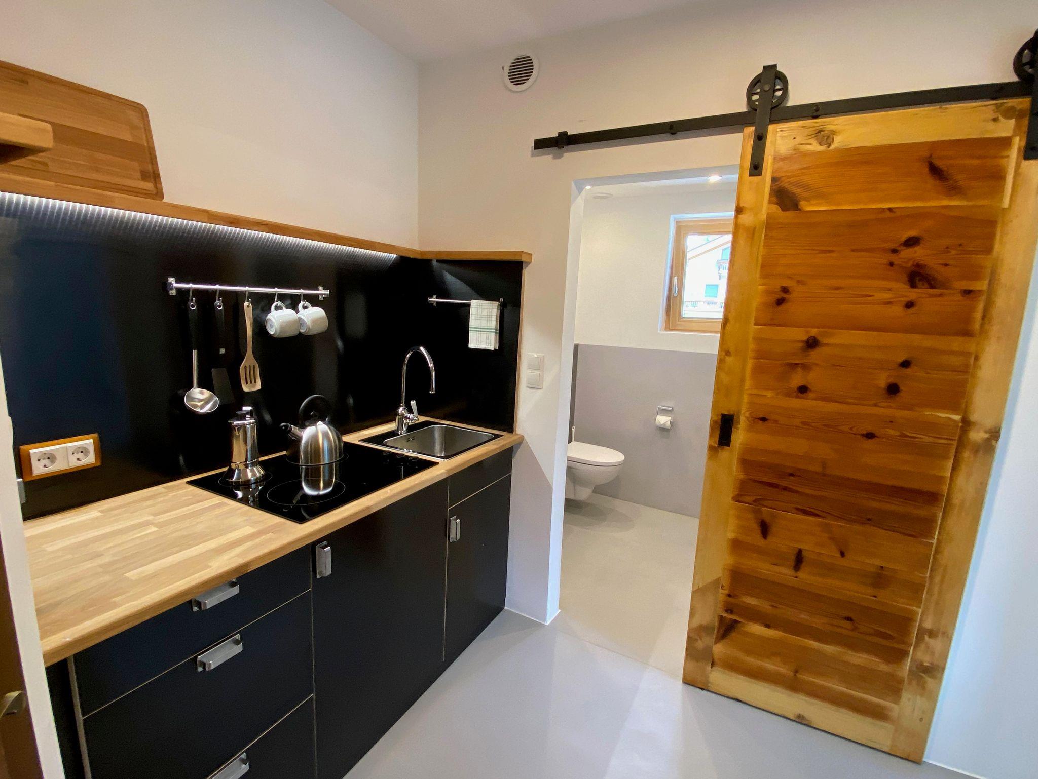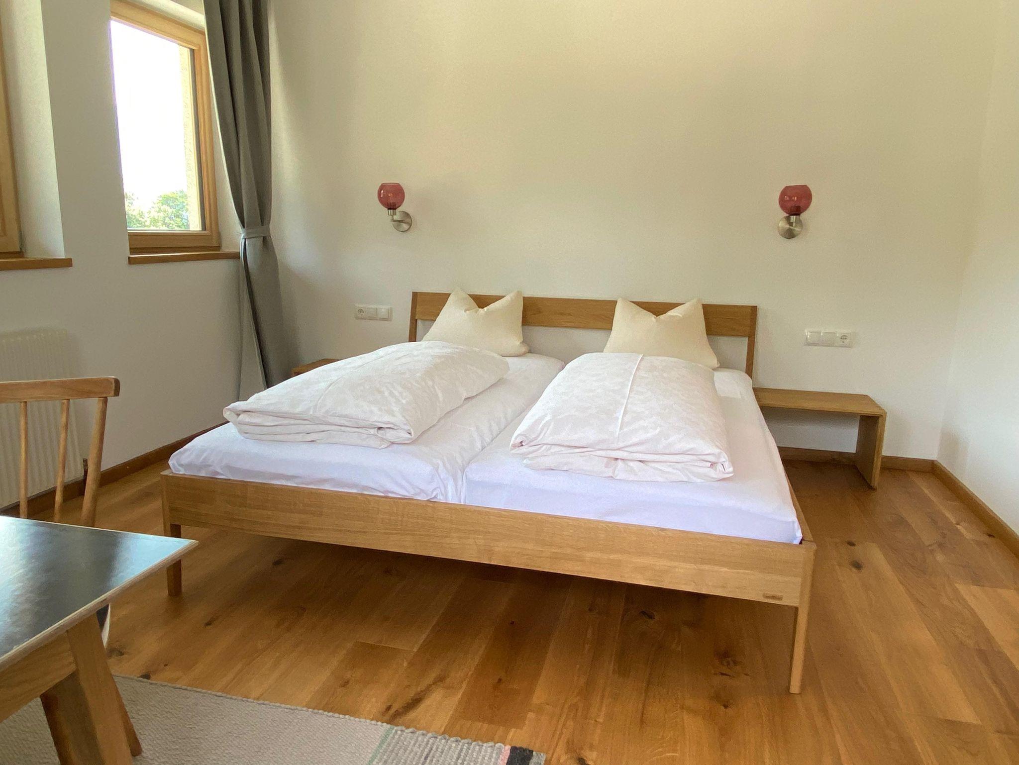 Generalsaniertes Doppelbettzimmer mit einer Küchenecke, ein Mix aus alten und neuen Elementen. Ca 100 Jahre alte Wandtäfer (welche ca. 50 Jahre in einer Garage als Wandteiler mißbraucht wurden) wurden vom Chef persönlich zu einer Garderobe bzw. einer Schiebetür upgecyclt. Ein uralter Tisch bzw. Stühle bekamen ebenfalls ein zweites Leben verpasst.