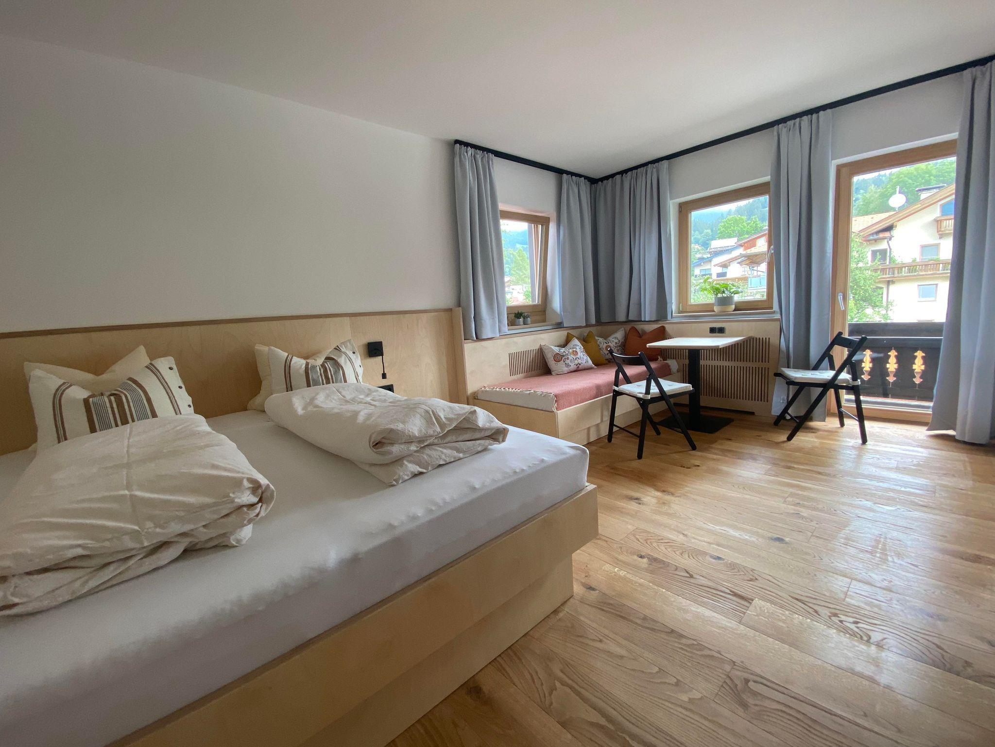 Generalsaniertes Dreibettzimmer (ein Doppelbett, ein Einzelbett), angenehmer Wohnkomfort ohne unnötigem Schnickschnack, auf das Wesentliche reduziert, aber keineswegs spartanisch. Getreu dem Motto: Perfektion wird nicht erreicht sobald man nichts mehr hinzufügen kann, sondern sobald man nichts mehr weglassen kann.