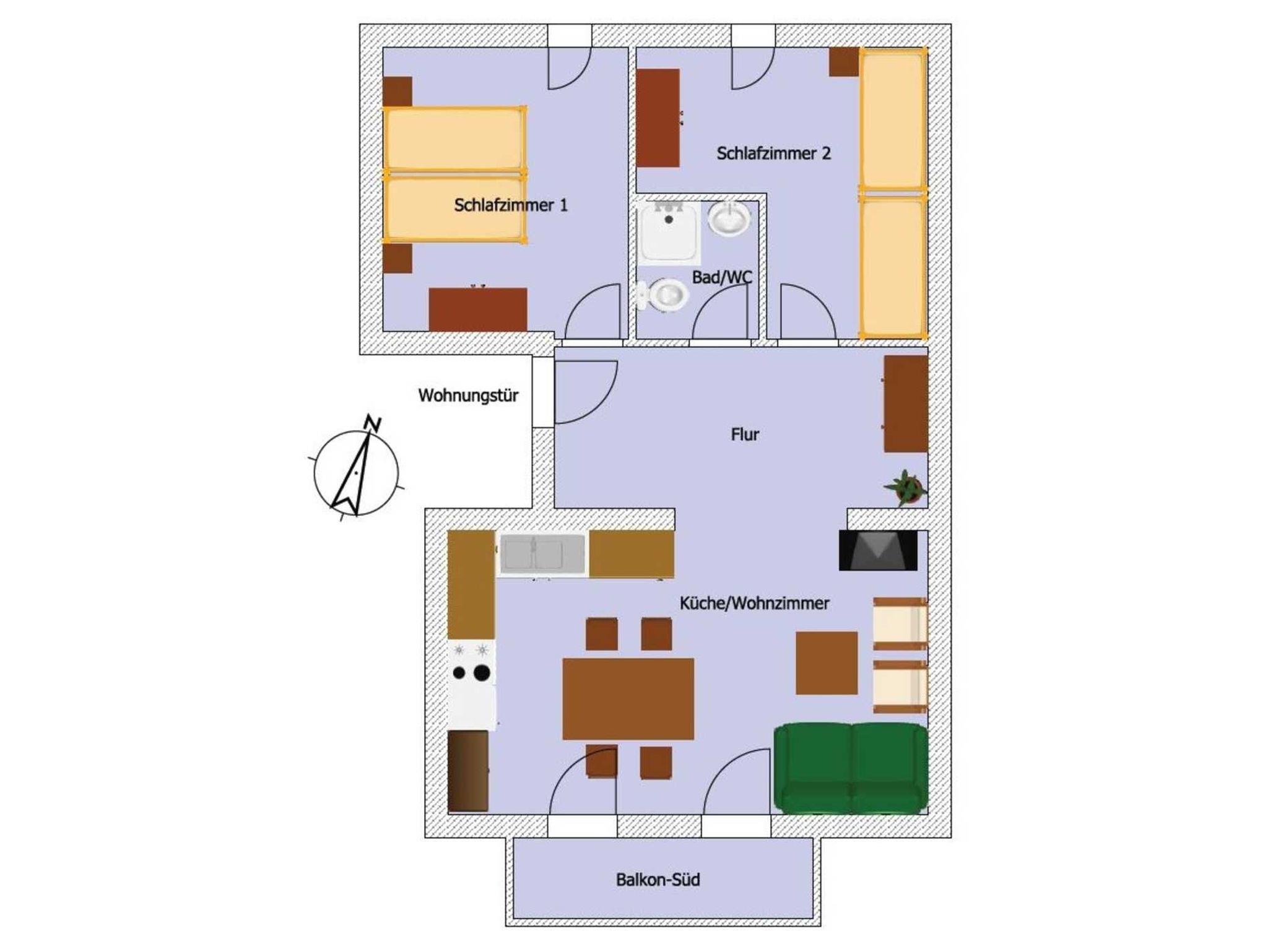 Sie umfasst Vorraum, 2 Schlafzimmer, einen großen Raum mit Wohnzimmer- und