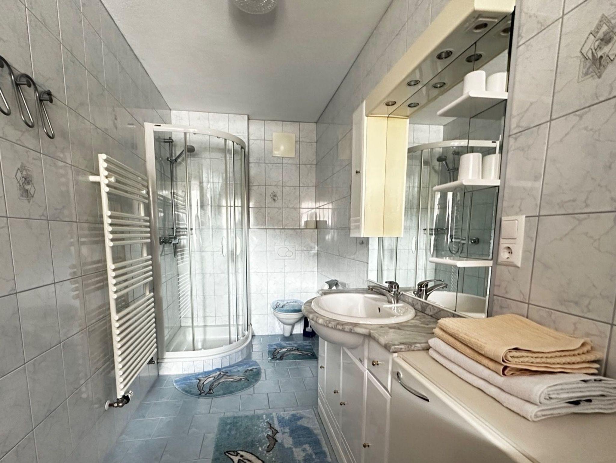 Typ A (55 m²): große komplett eingerichtete Wohnküche mit Bettcouch, SAT-TV, Radio, 1 Schlafzimmer mit Doppelbett, 1 Schlafzimmer mit zwei Einzelbetten, großes Bad mit Badewanne und Dusche, WC extra. Diese Wohnung befindet sich im Parterre.
