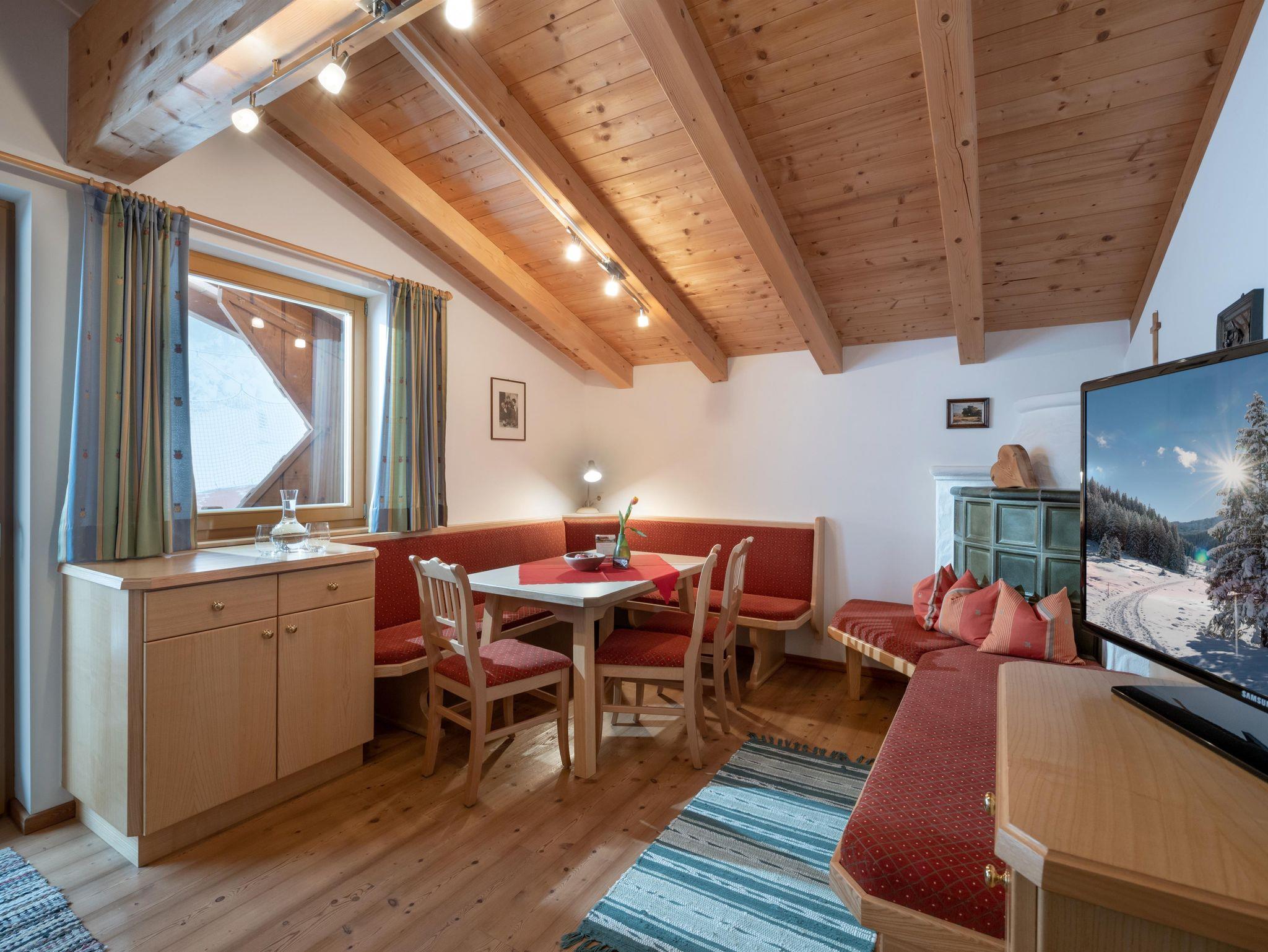 Schlafzimmer in Zirbenholz-Ausführung, Balkon gegen Süden mit Blick zur Gondel, Wohnküche komplett ausgestattet, alles Holzböden, Kachelofen, Bad mit Dusche und WC, Handtücher und Bettwäsche vorhanden.
