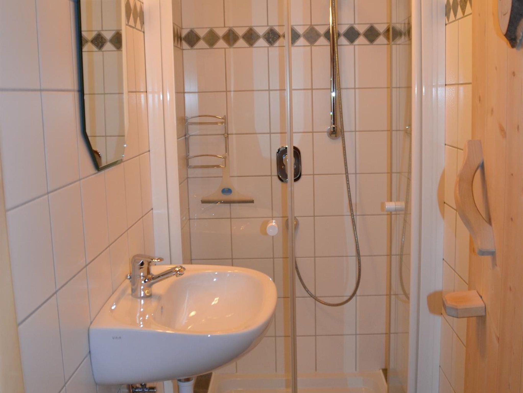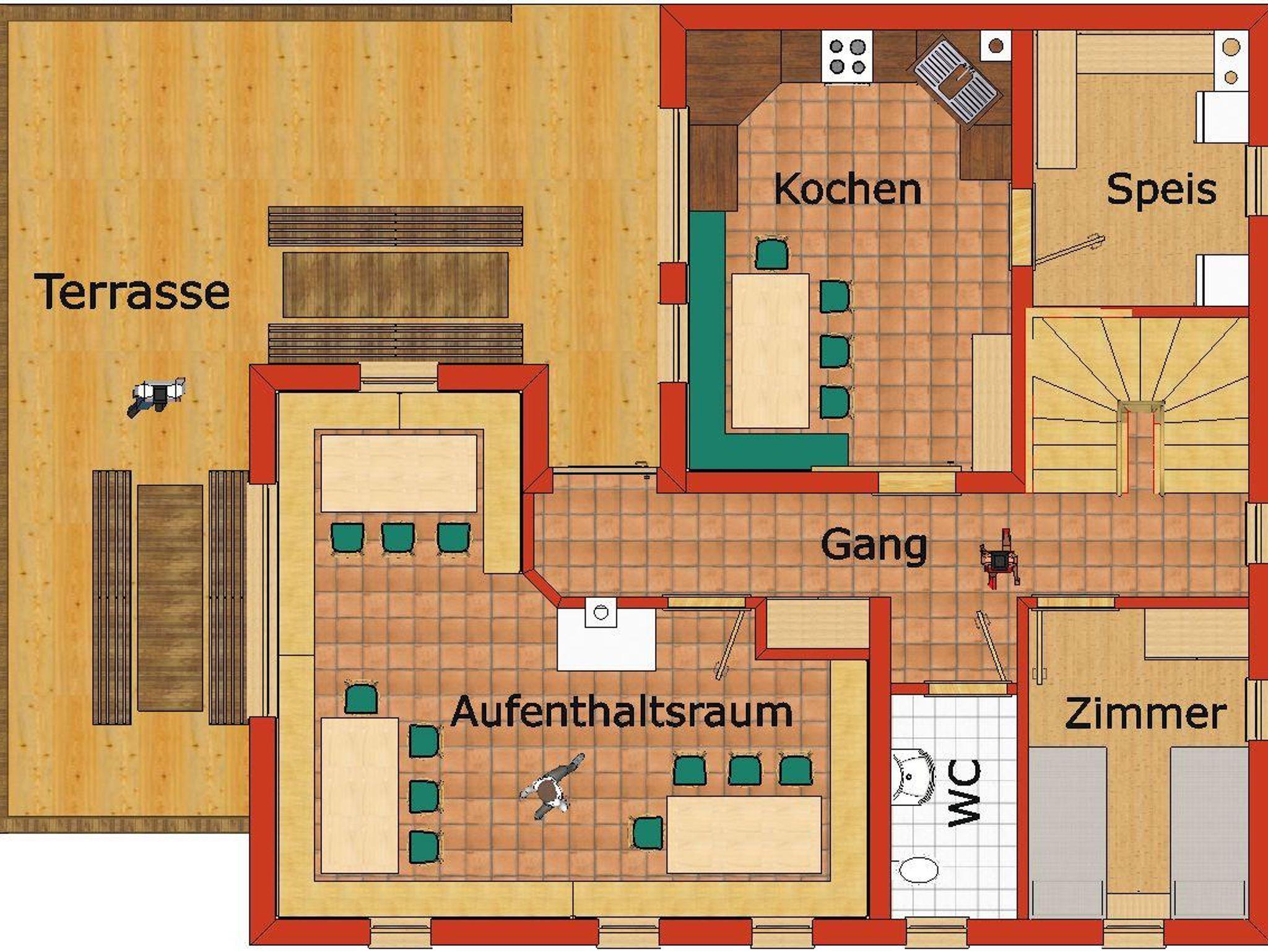 Im Erdgeschoß befindet sich die komplett ausgestattete u. geräumige Wohnküche (E-Herd mit Backrohr, großer Holzherd mit Backrohr, Kühlschrank, Gefrierschrank, Geschirrspüler, Mixer, Wasserkocher), Speisekammer, der Wohnraum mit Schwedenofen (Sat-TV), ein rollstuhlgerechtes 2-Bettzimmer, WC, Waschtisch.