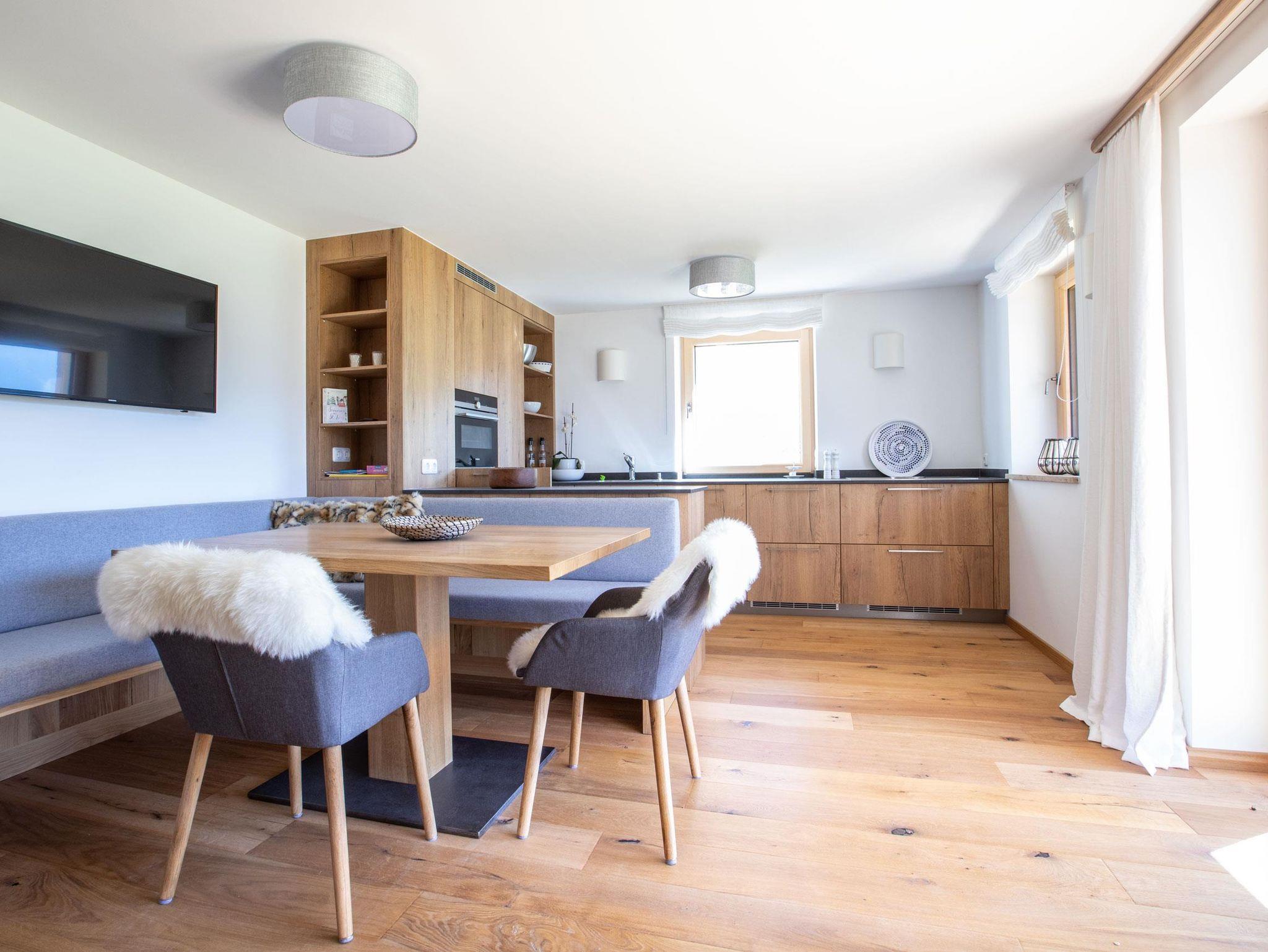 Wohn/Esszimmer mit Flat-TV mit Couch, Esstisch mit Eckbank