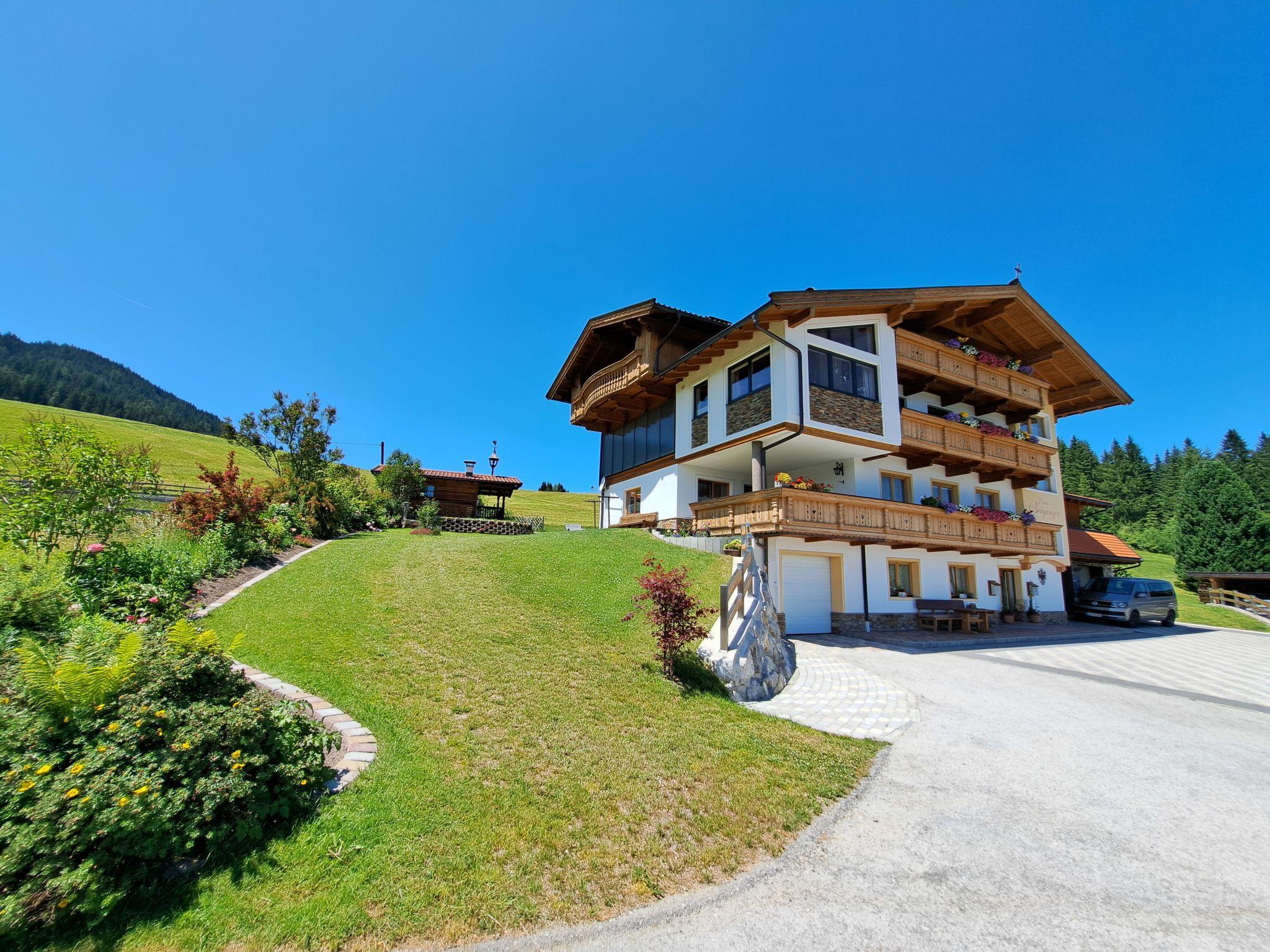 Haus BERGANGER enjoys a wonderful panoramic location at an altitude of approximately 1175 m, at the end of a dead-end road in the Thierbach-Außerthierbach district. It offers expansive views over the entire Wildschönau region, all the way to the Wilder Kaiser massif. Meadows and pastures surround the house. The nearest supermarket is 7 km away. The Wildschönau outdoor swimming pool is 8.6 km away. The Schatzbergbahn cable car in Auffach is 7 km away. The Thierbach Koglweg adventure hiking trail (approx. 8 km long) passes close to the house. Access is via a steep, winding mountain road (4.5 km). Winter information: Access is 4.5 km away via a steep, winding mountain road (snow chains may be required). Cross-country ski trails and winter walking paths in Thierbach are 1.2 km away. The ski school and the Schatzbergbahn valley station in Auffach are 7 km away (access to the Skijuwel Alpbachtal - Wildschönau ski area). Valley station of the Markbachjochbahn in Niederau 10 km. Apartment house "Berganger", 1'175 m a.s.l.. In the district of Thierbach-Ausserthierbach 1.2 km from the centre of Thierbach, 16 km from the centre of Wörgl, 32 km from the centre of Kufstein, 7 km from the skiing area, in a cul-de-sac. For shared use: property. 4.5 km long steep motor access. In Winter: please take snow chains. Parking on the premises. Supermarket 7 km, bus stop 100 m, railway station "Wörgl" 16 km, outdoor swimming pool 8.6 km. Golf course (18 hole) 38 km, mountain railway 11 km, ski lift 7 km, ski school 7 km, cross country ski track 1.2 km. Please note: the owner lives in the same residence. Animals in the neighbourhood.