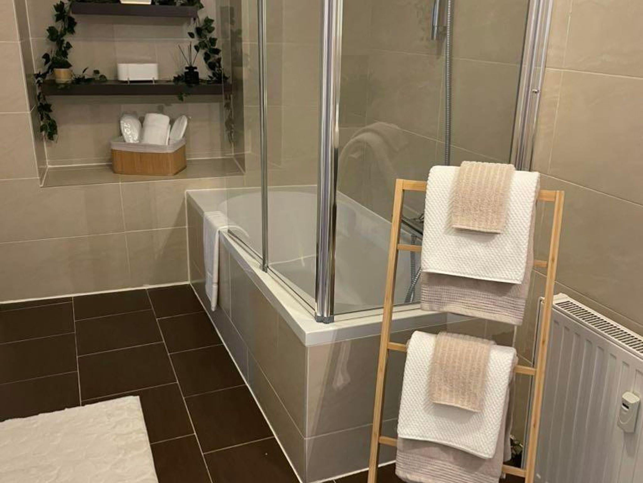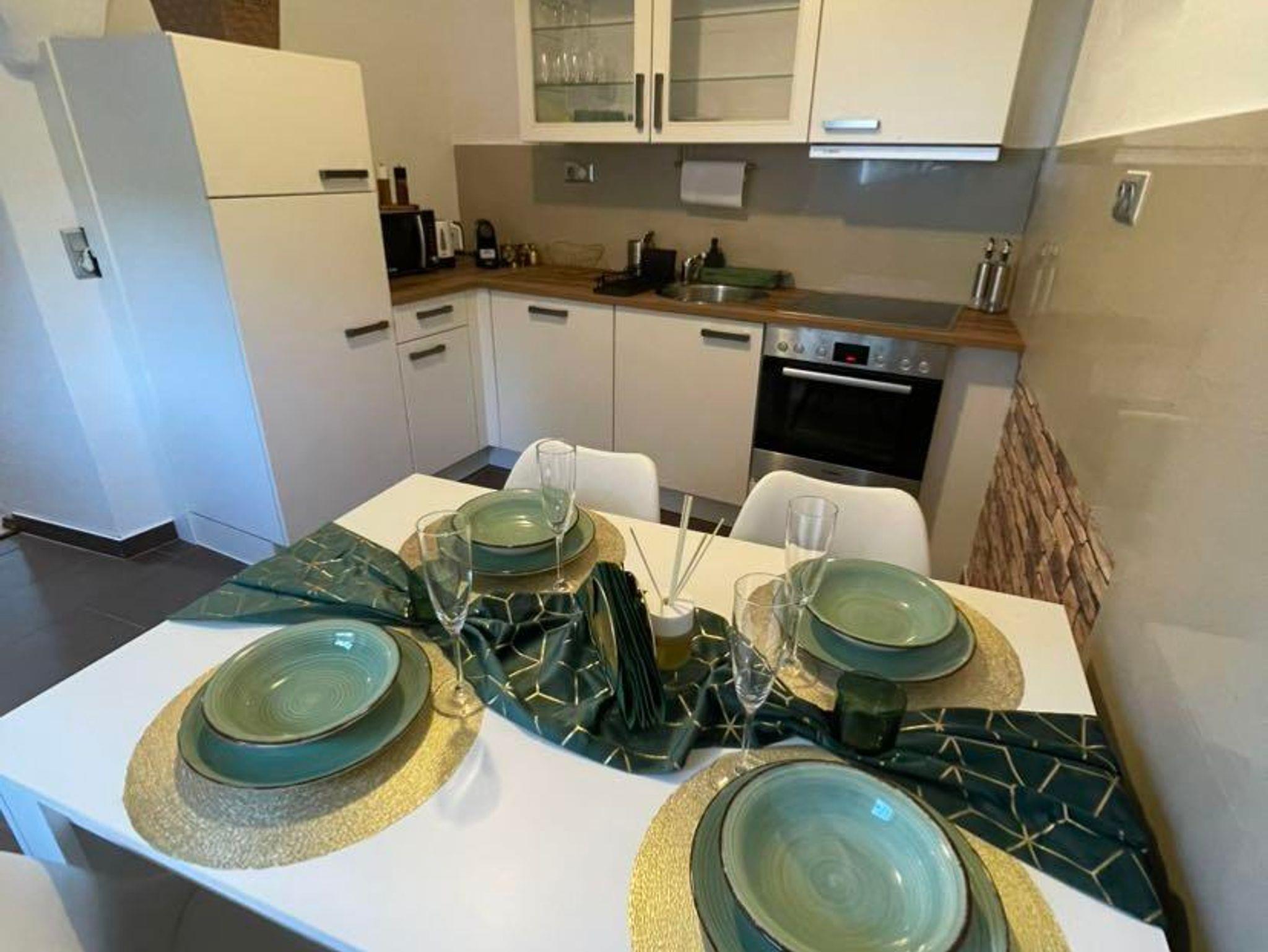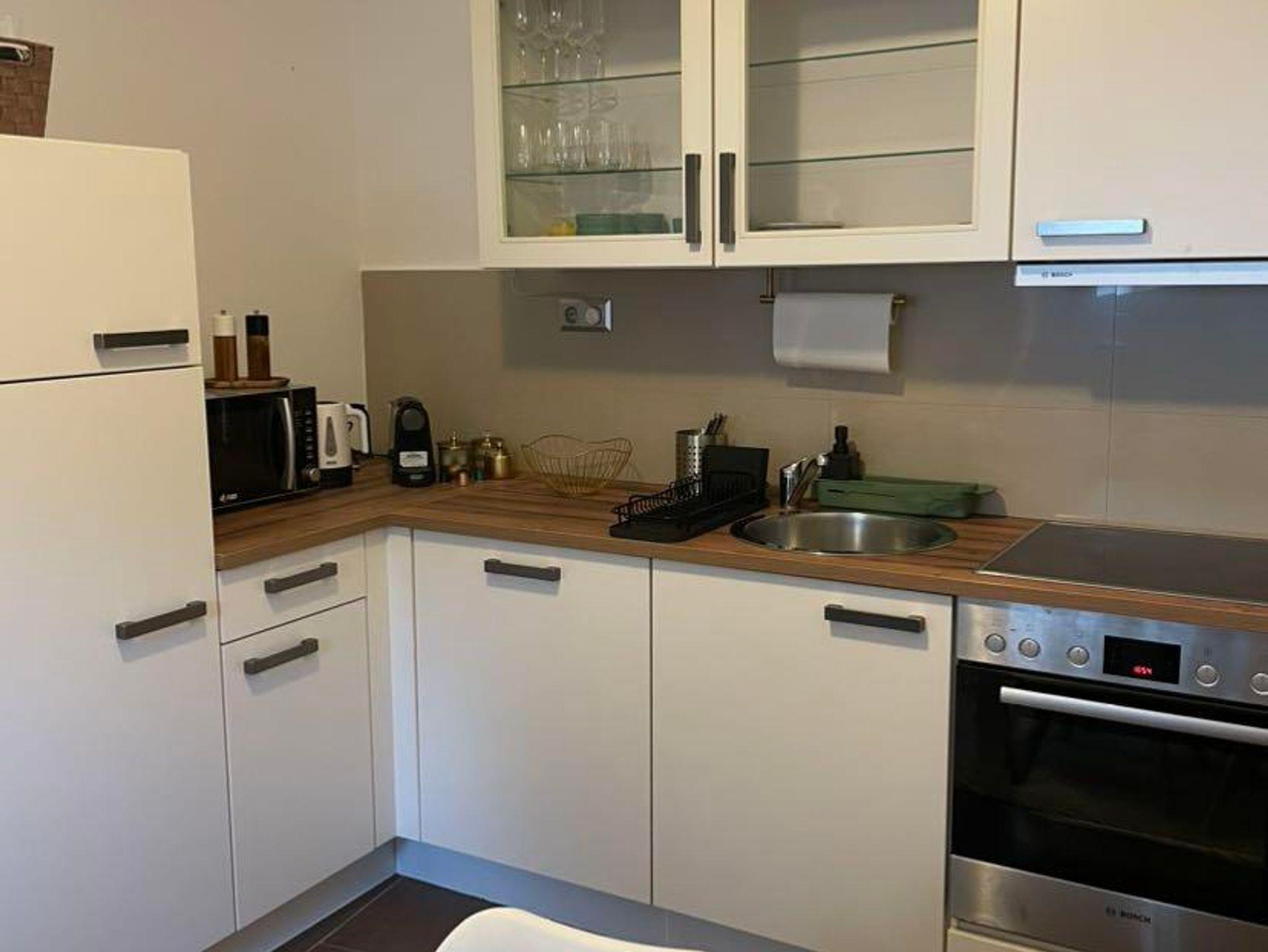 Die Küche ist ausgestattet mit allen notwendigen Annehmlichkeiten, wie einem Kühlschrank, Herd, Kaffeemaschine, Toaster, Wasserkocher und einer Mikrowelle. Eine kleine, einladende Küchenzeile bietet ausreichend Platz zum Kochen und Vorbereiten von Mahlzeiten. Ein kleines Badezimmer mit Dusche rundet die Wohnung ab und sorgt für Bequemlichkeit.